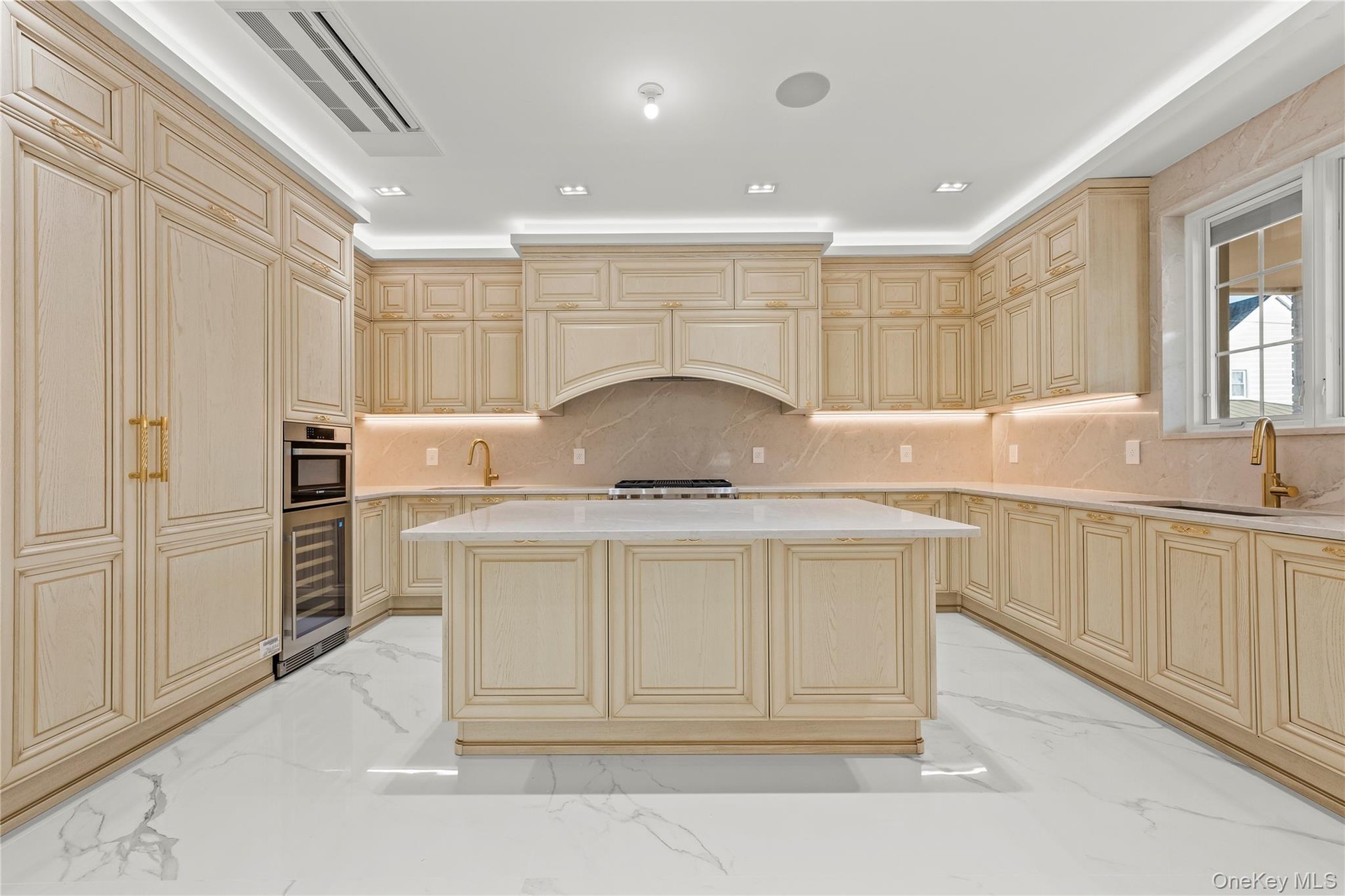 - Kitchen with light marble finish floors, backsplash, light stone countertops, a kitchen island, and recessed lighting