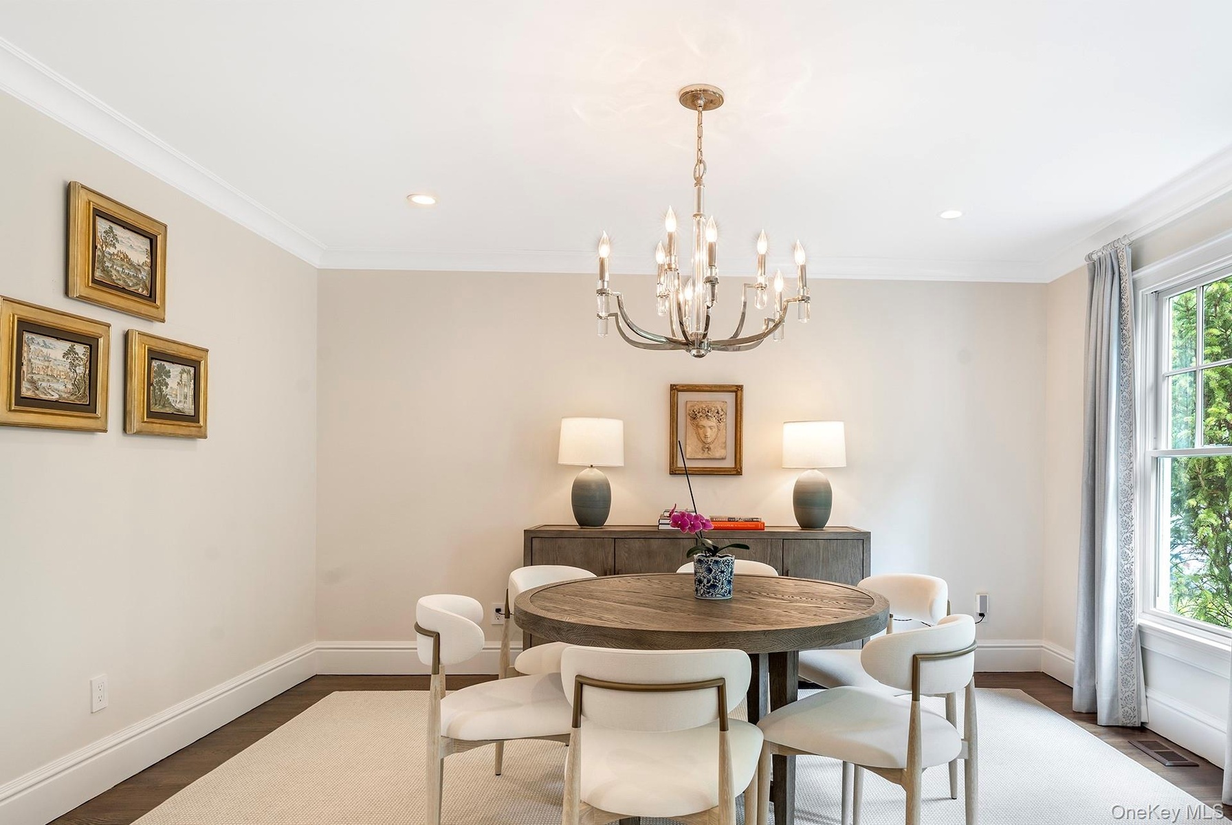 - Dining area with wood finished floors, ornamental molding, a chandelier, and recessed lighting