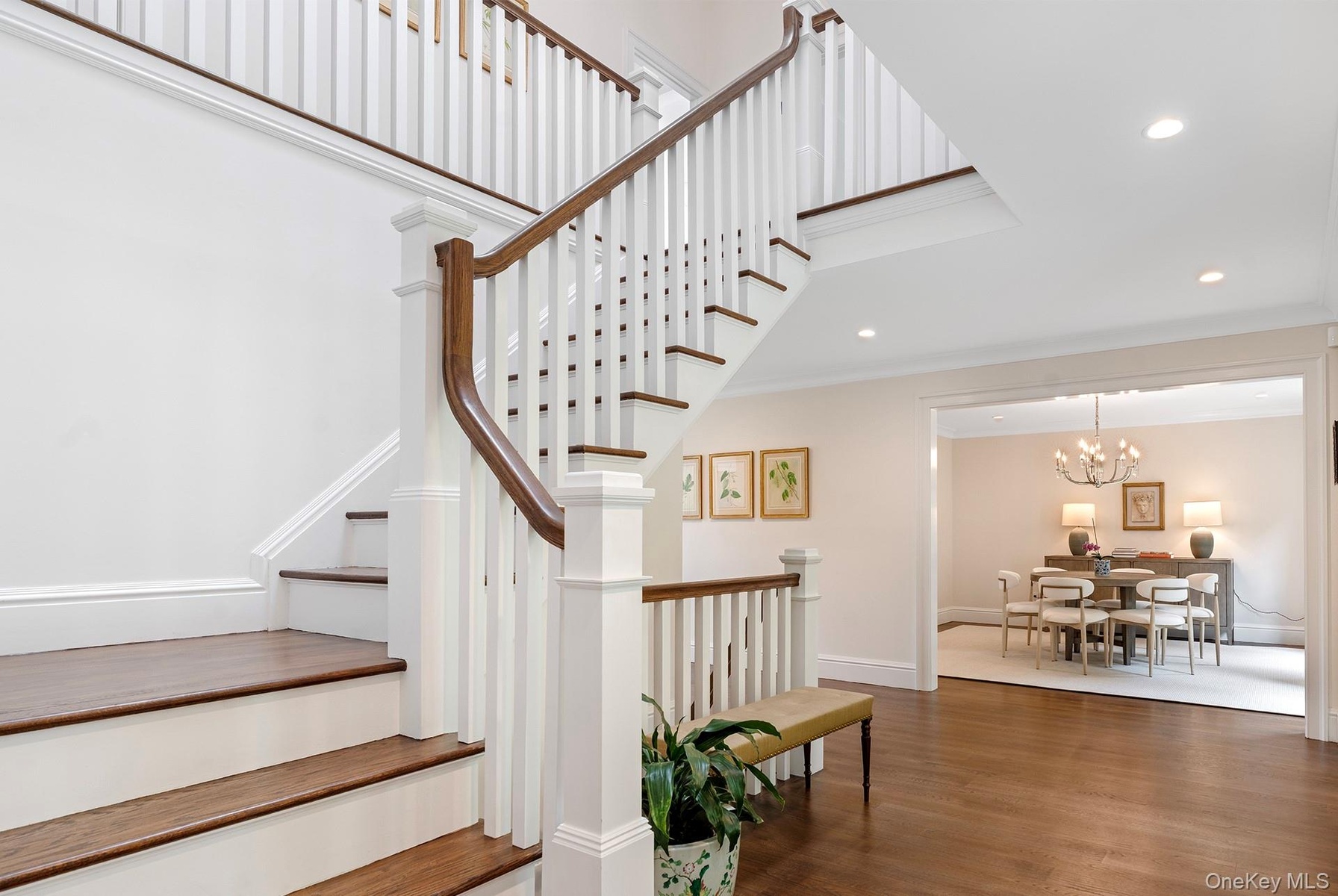 - Stairs featuring wood finished floors, recessed lighting, crown molding, and a chandelier