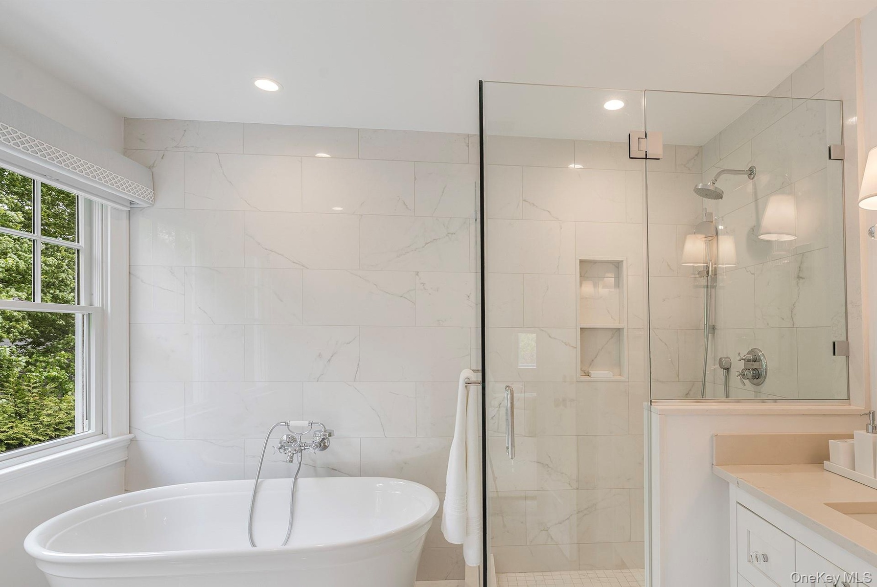 - Bathroom with a soaking tub, tile walls, vanity, a marble finish shower, and recessed lighting
