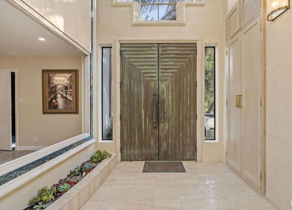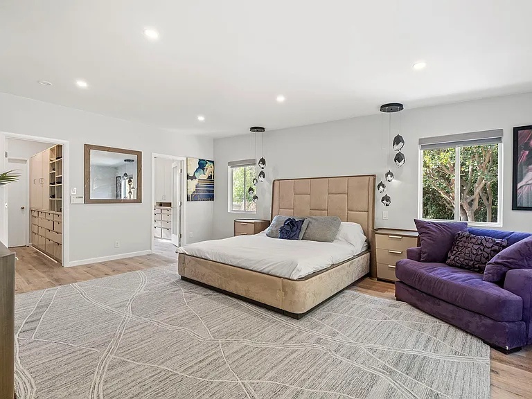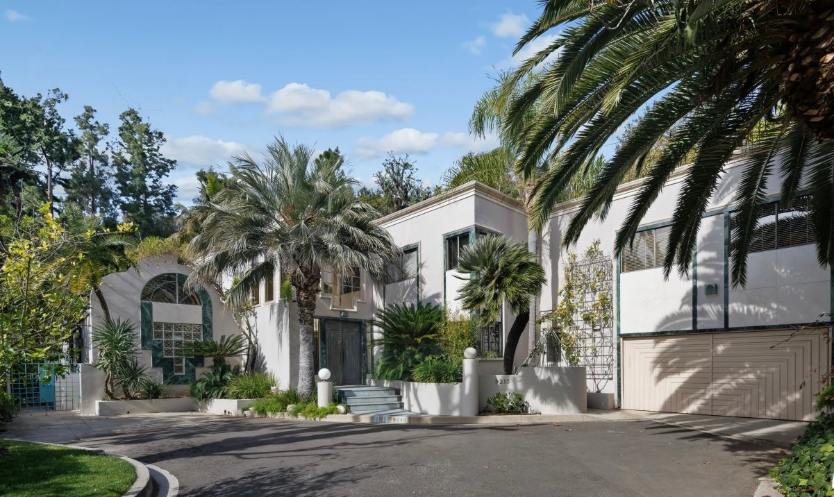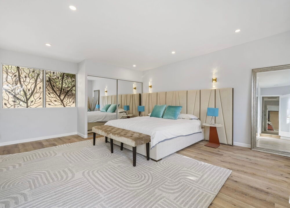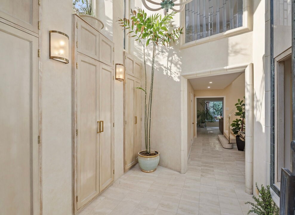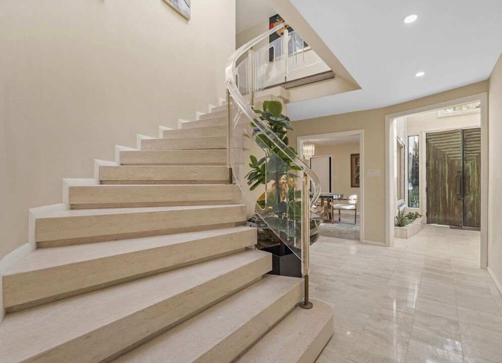 This home offers elegance & sophistication perfect for entertaining or retreating in style.Nestled at the end of a quiet cul-de-sac, 5 bedroom, 5.5 bath home approx. 5,500 square feet of elegant interiors and seamless indoor-outdoor living. A sweeping travertine staircase with a spectacular Lucite railing by celebrated designer Charles Hollis Jones anchors the entry and sets the tone for the home's Hollywood elite. Generously scaled living and dining areas open to sun-drenched patios, mature landscaping creates a private backdrop around dramatic pool pavilion. Located off Sunset Blvd yet tucked away in a serene enclave. Recently renovated, the property also features brand-new, extra-large bathrooms crafted entirely from exquisite Dekton and marble, upgraded electrical systems, and recessed lighting throughout, enhancing both functionality and ambiance. This home boasts an impressive array of amenities, including an indoor pool, Jacuzzi spa, private gym and a relaxing sauna. A rare opportunity to own a flawlessly restored architectural masterpiece. Property is also available for lease option $25k fully furnished
