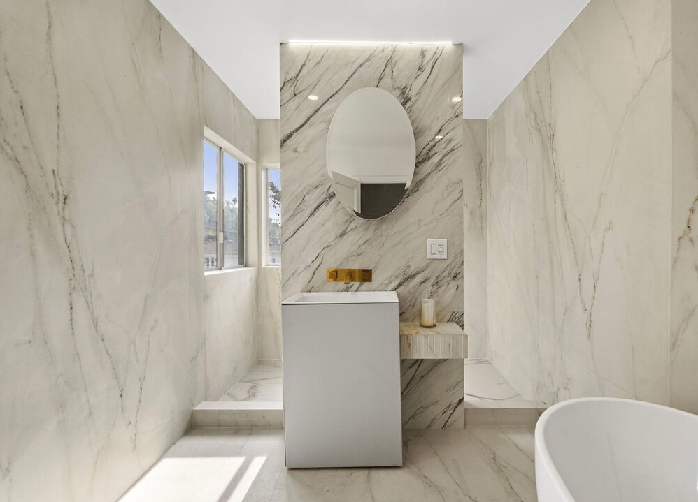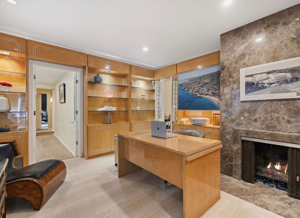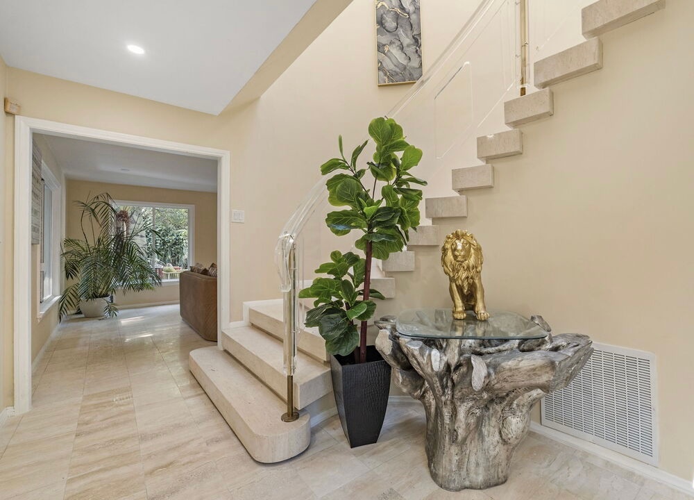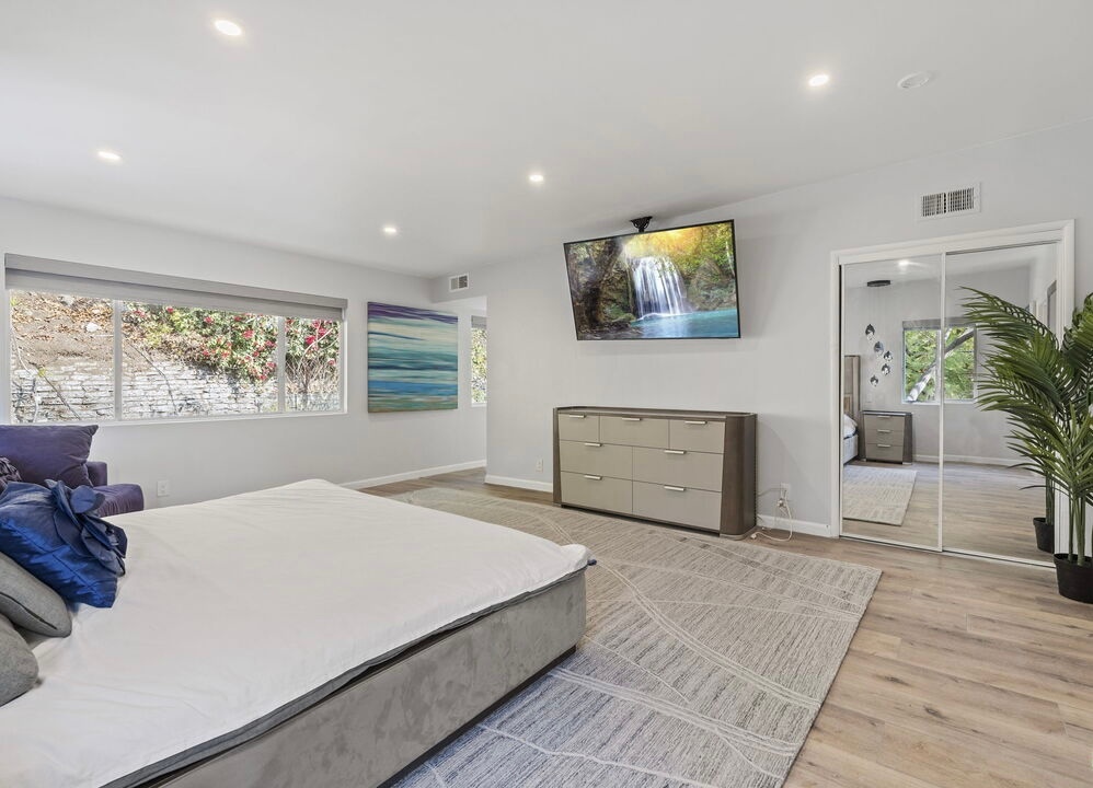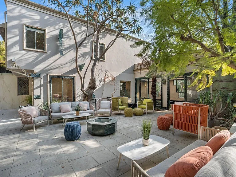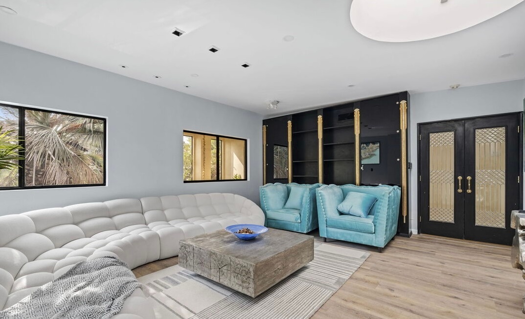 This home offers elegance & sophistication perfect for entertaining or retreating in style.Nestled at the end of a quiet cul-de-sac, 5 bedroom, 5.5 bath home approx. 5,500 square feet of elegant interiors and seamless indoor-outdoor living. A sweeping travertine staircase with a spectacular Lucite railing by celebrated designer Charles Hollis Jones anchors the entry and sets the tone for the home's Hollywood elite. Generously scaled living and dining areas open to sun-drenched patios, mature landscaping creates a private backdrop around dramatic pool pavilion. Located off Sunset Blvd yet tucked away in a serene enclave. Recently renovated, the property also features brand-new, extra-large bathrooms crafted entirely from exquisite Dekton and marble, upgraded electrical systems, and recessed lighting throughout, enhancing both functionality and ambiance. This home boasts an impressive array of amenities, including an indoor pool, Jacuzzi spa, private gym and a relaxing sauna. A rare opportunity to own a flawlessly restored architectural masterpiece. Property is also available for lease option $25k fully furnished