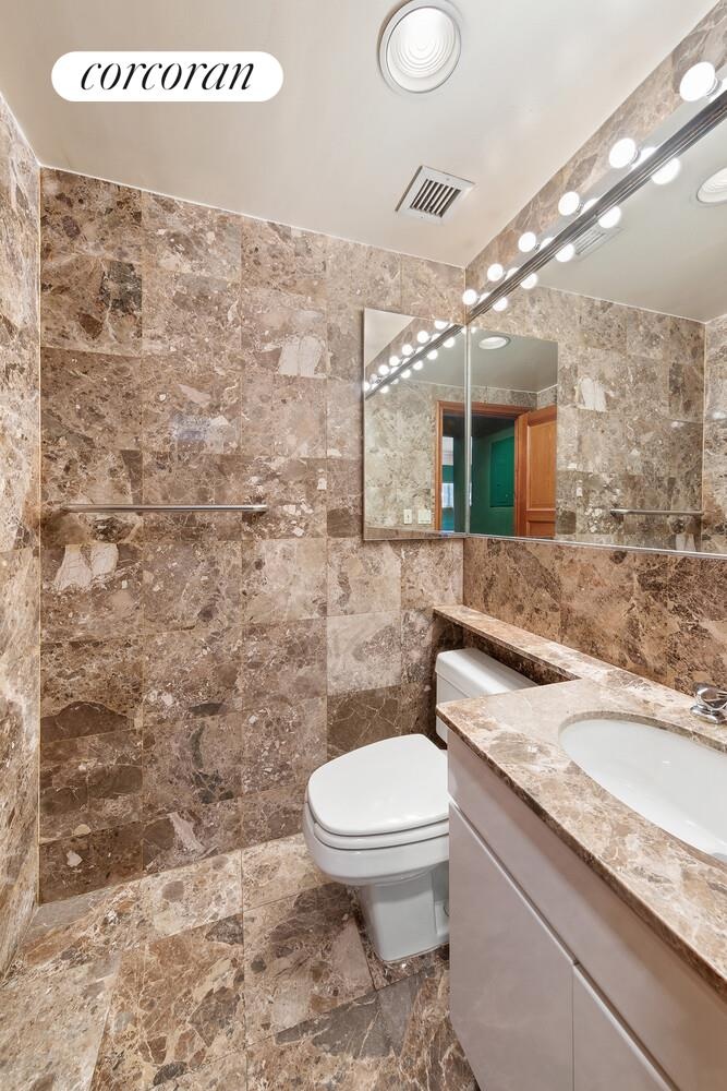 The well-proportioned living room with walls of windows opens onto a large terrace which easily accommodates a dining table and/or seating and offers beautiful open and quiet views north. The kitchen opens to a spacious separate dining area with floor to ceiling windows and open views. The primary bedroom suite includes floor to ceiling picture windows with open views and a separate dressing area and marble bath. The layout is complete with a half bath off the entry and an attractive ceiling height.
