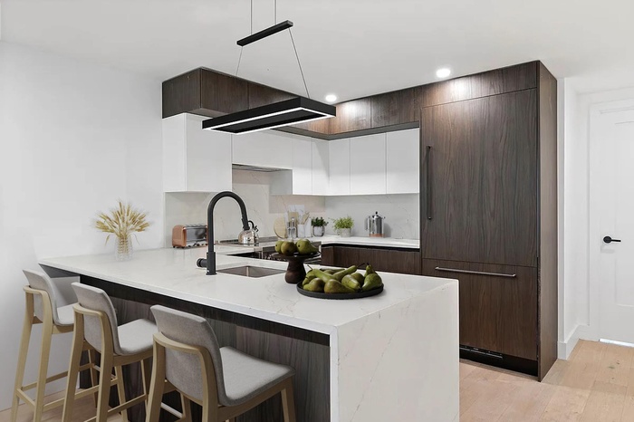 The kitchen features an eat-in waterfall peninsula, gleaming Marigold Quartz countertops and backsplash, custom walnut cabinetry from Scavolini, an Artos faucet, and integrated high-end Bertazzoni appliances including a state-of-the-art, eco-friendly induction range.