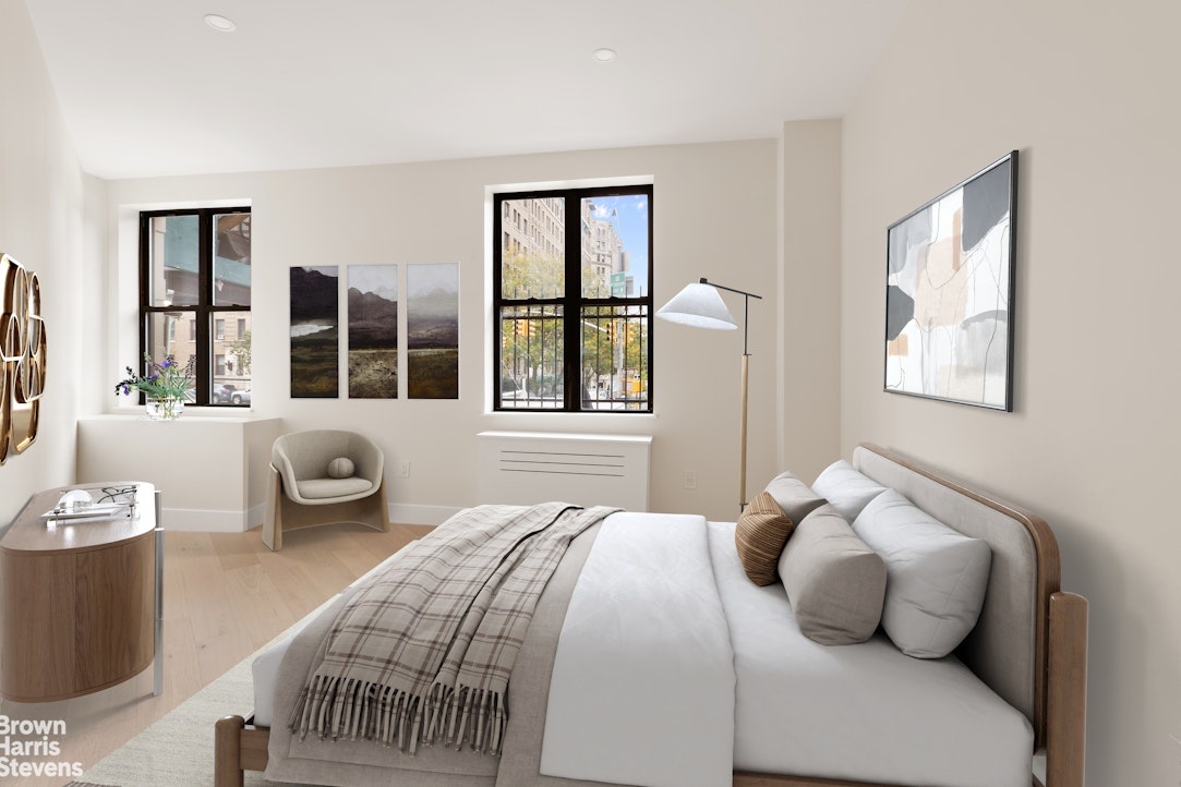 The generous windowed dining area (formerly the third bedroom) is large enough to host gatherings or function as an expansive home office. Both bedrooms face west and are exceptionally large, offering wonderful natural light throughout the day. The windowed bathroom is impressively scaled, with double sinks and elegant finishes, rarely found in this price range.