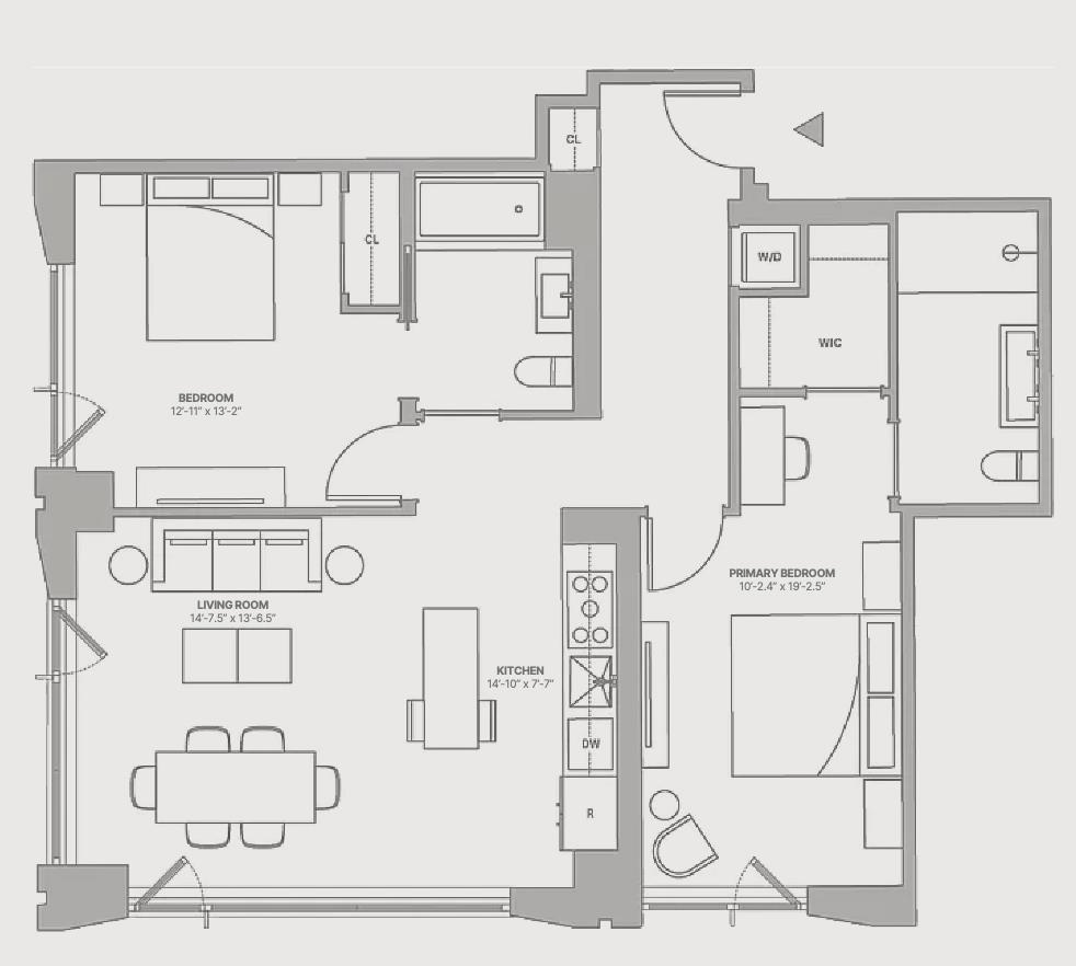 The home is bathed in natural light through floor-to-ceiling windows, showcasing breathtaking north east city views. The chef’s kitchen is a masterpiece, featuring custom cabinetry, marble countertops, and premium appliances—perfect for culinary creations or casual entertaining. The spacious primary suite boasts a walk-in closet and a spa-inspired ensuite bathroom, while the second bedroom offers versatility to suit your lifestyle.