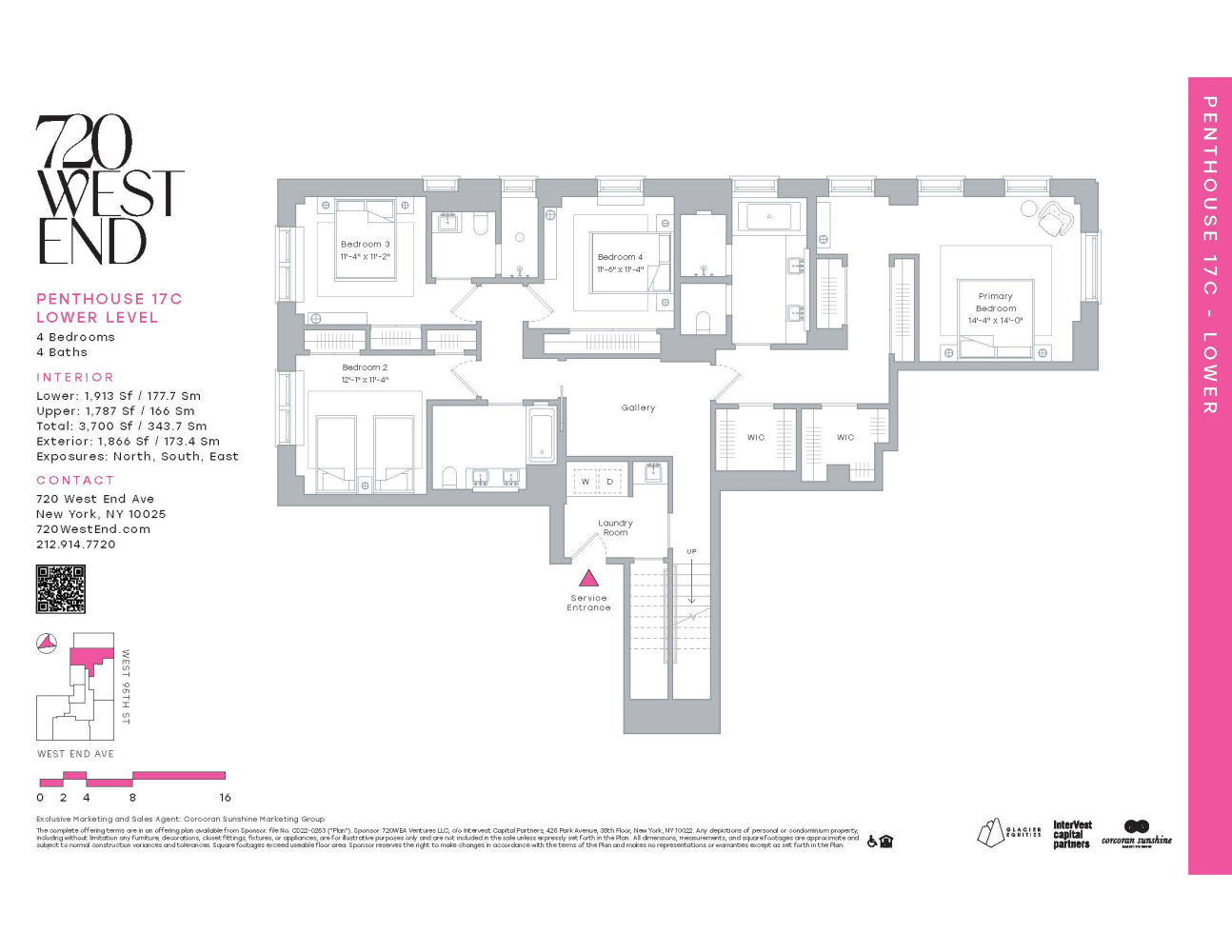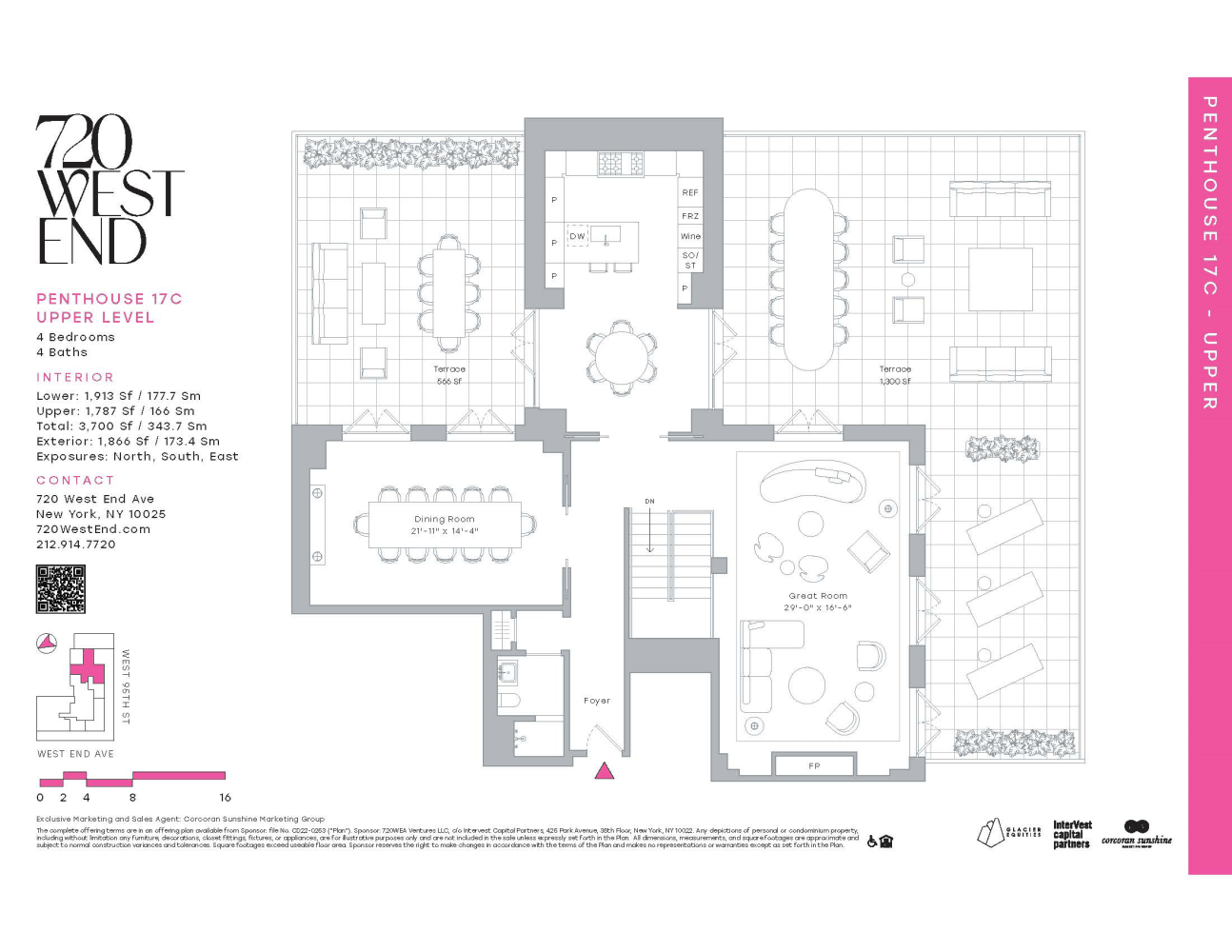 Designed by renowned architect and designer Thomas Juul Hansen, Penthouse 17C is a CORNER four-bedroom, four-bathroom residence with two separate terraces. Totaling 1,922sqft both terraces flank the tremendous great room, separate formal dining room and eat-in kitchen which are located on the 17th floor, the upper portion of this spectacular duplex. Highlighted by the timeless character of yesterday and the compelling minimalist styling, modern conveniences and technologies of tomorrow, each home at 720 West End Avenue is unique. Celebrate an abundance of natural light, and open, flowing space in each residence. Penthouse 17C offers triple exposure to the south, east and to the north from portions of the 16th and 17th floors which are connected by a stately staircase.