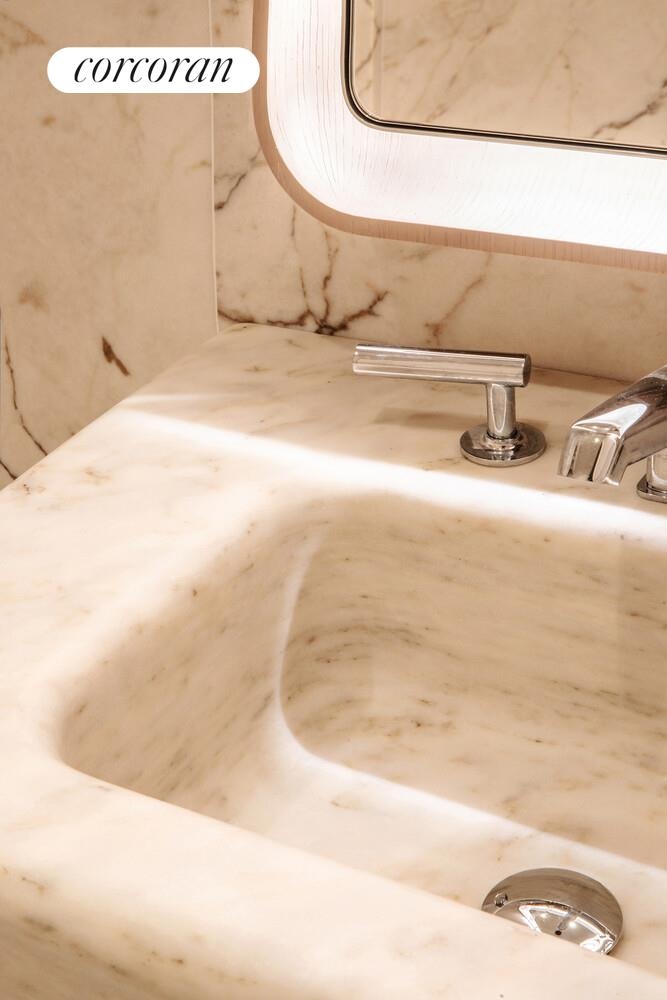 The elegant secondary bathrooms are outfitted with a custom Thomas Juul Hansen designed white oak vanity, honed Thassos marble wainscot, countertop and flooring, Waterworks fixtures in polished chrome and a Duravit wall mounted toilet.