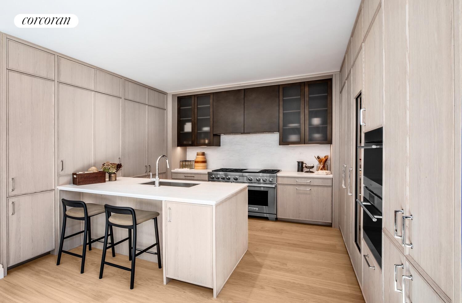 A custom Italian kitchen designed by Boffi features a hand selected honed Namibia Rose marble countertop and backsplash, white oak cabinetry, fluted, reflective bronze upper doors and Waterworks polished chrome hardware and complete with a large pantry for ample storage. Professional-grade appliances include Sub-Zero refrigerator, Wolf cooktop and oven, wine fridge, and Cove dishwasher.
