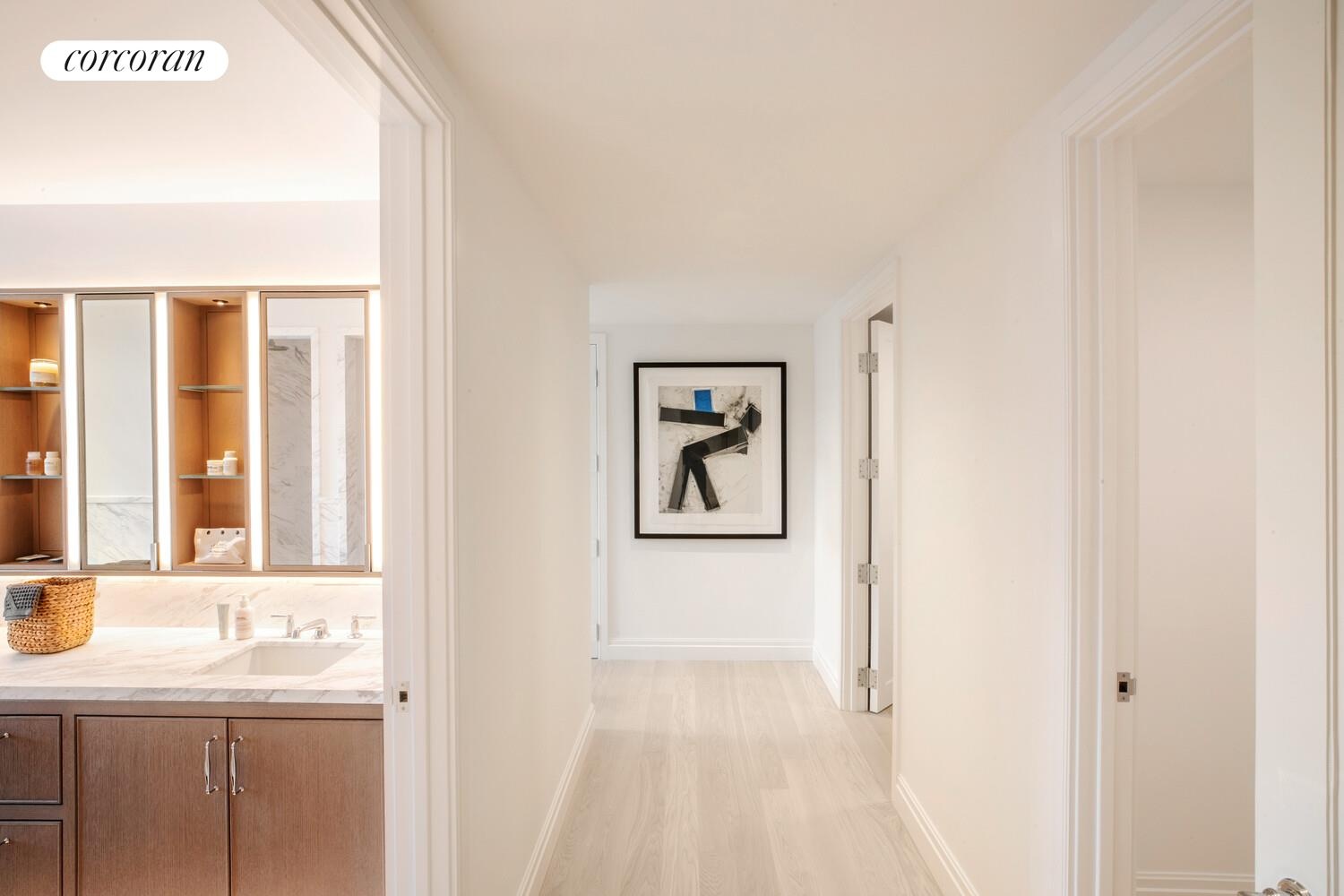 The five-fixture primary bathroom offers a custom Thomas Juul Hansen designed white oak vanity with recessed medicine cabinet and integrated facial lighting, Volakas marble counters, flooring and walls, waterworks fixtures in polished chrome, radiant heated flooring, and a Toto wall mounted toilet. Two oversized closets can be found in the primary bedroom.