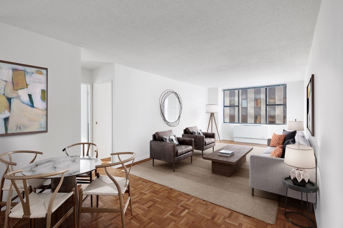 Spacious and bright one bedroom with a fully equipped windowed kitchen, large living room with space for a dedicated dining area or home office, a windowed bath, and wood floors throughout.