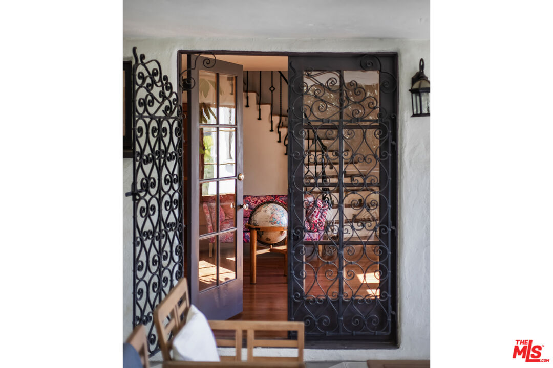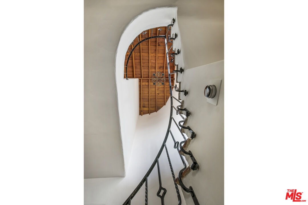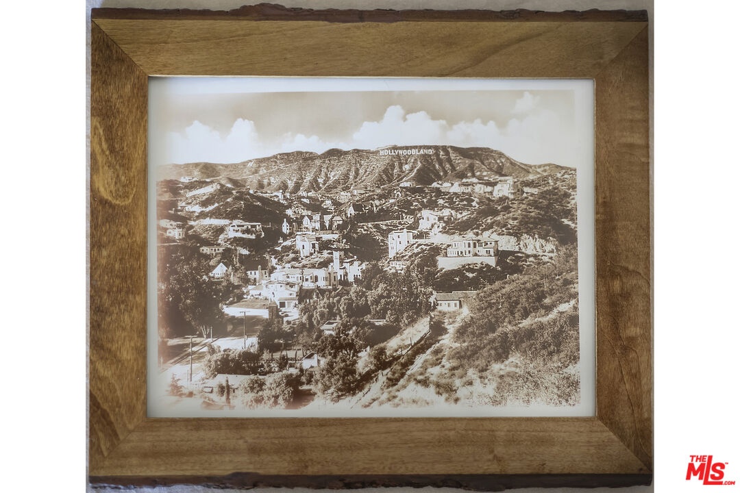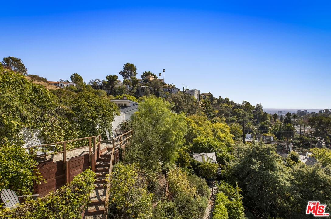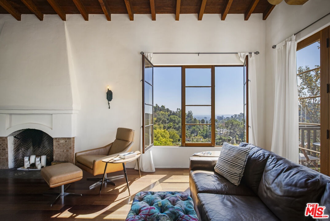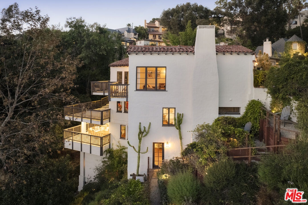 This classic Hollywoodland Spanish Colonial Estate circa 1928 is sited with privacy and bathed in natural sunlight offering stunning original character, sensational views of the canyon and city lights, spacious bright rooms and a full separate parcel landscaped as a private park with meandering paths and a myriad of fruit and flowering specimens. The gated courtyard at street level leads to tiled grand formal entry and dramatic living room with towering wood beamed ceiling, authentic stone fireplace, and original casement windows and French doors leading to a romantic balcony to take in the view. Unique pentagonal dining room opens to balcony and spacious eat-in cooks' kitchen, with vaulted wood beamed ceiling, chef's appliances, large breakfast area plus butler's pantry. Stunning tiled staircase leads to middle level with an office and three bedrooms including a luxurious primary suite; with large bedroom and gorgeous vintage style black-and-white en suite bath with floor to ceiling tiles, double sink and separate tub and shower. The third level features flex space with three spacious bright original rooms with high ceilings and natural light: including an office/library with exterior entrance, a second living room opening to a large patio; and separate family room/4th bedroom with oversized tiled bath. All three levels feature flow to outdoor covered and open balconies. This property includes a second parcel with its own APN that has been transformed to an outdoor wonderland navigated on foot through dozens of varieties of fruit, rosemary, lavender and wild sage. Entertain large groups outdoors in the lower area of the lot featuring a huge tiled patio with built-in grill. Original hardwood floors, unpainted casement doors and windows, vintage Spanish tile, built-ins, hand crafted wrought iron, and clay tile roof are some of the classic hallmarks of this historic home. Additional bonus room w/half bath. A short walk to the village offers a neighborhood cafe and grocery. An impeccable original offering beauty, ease and comfort.