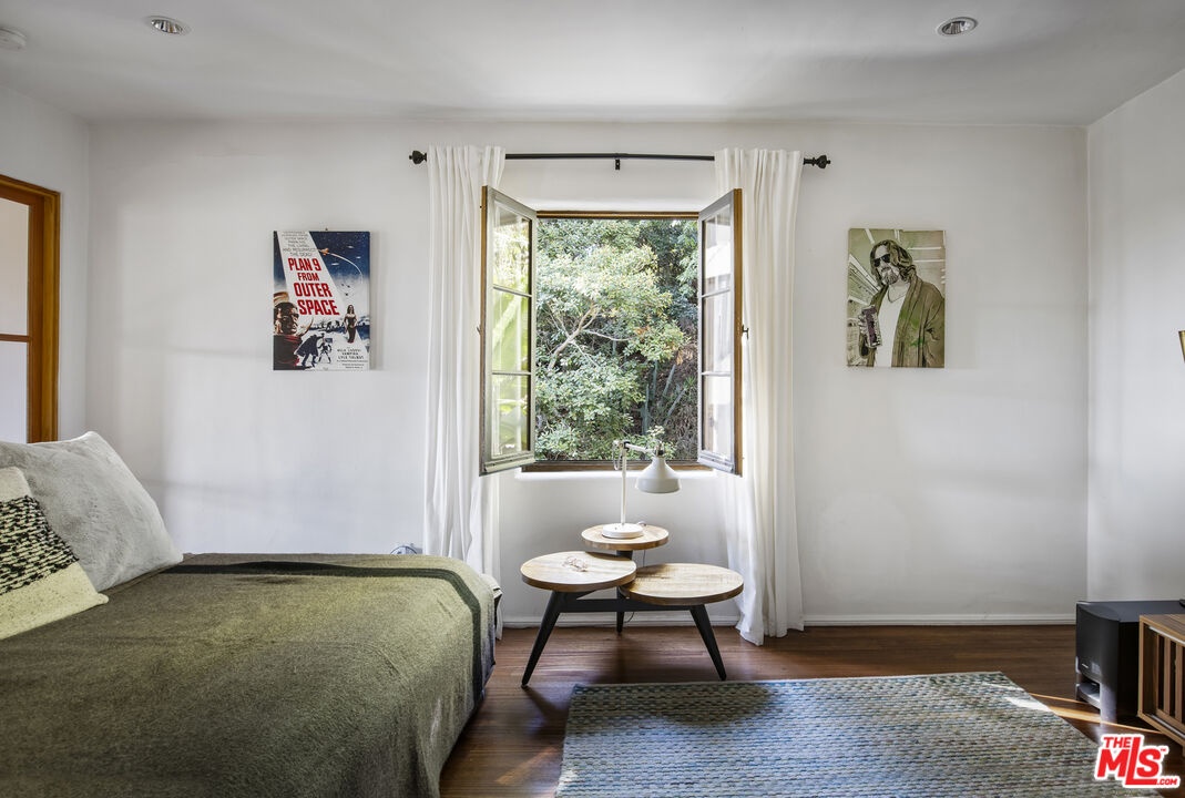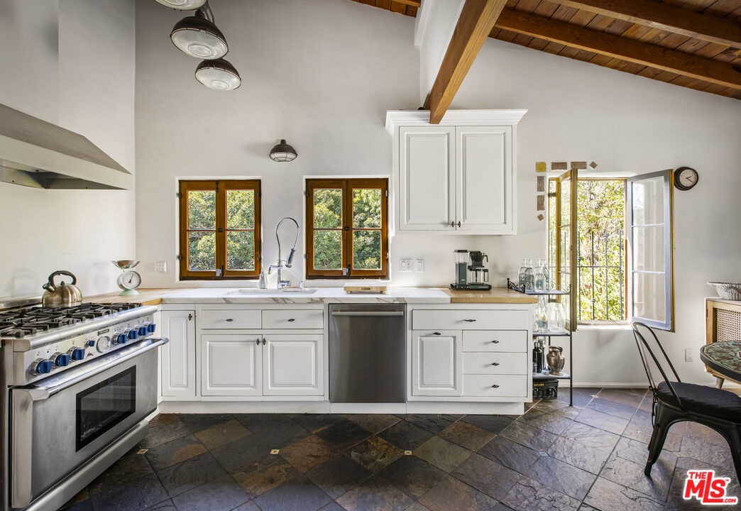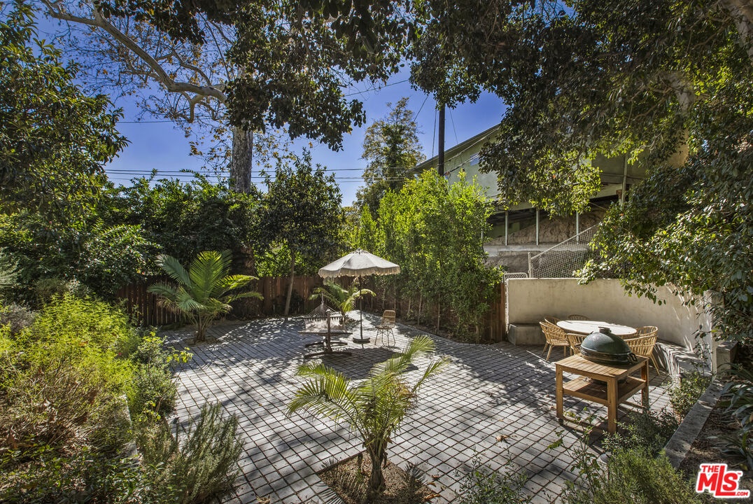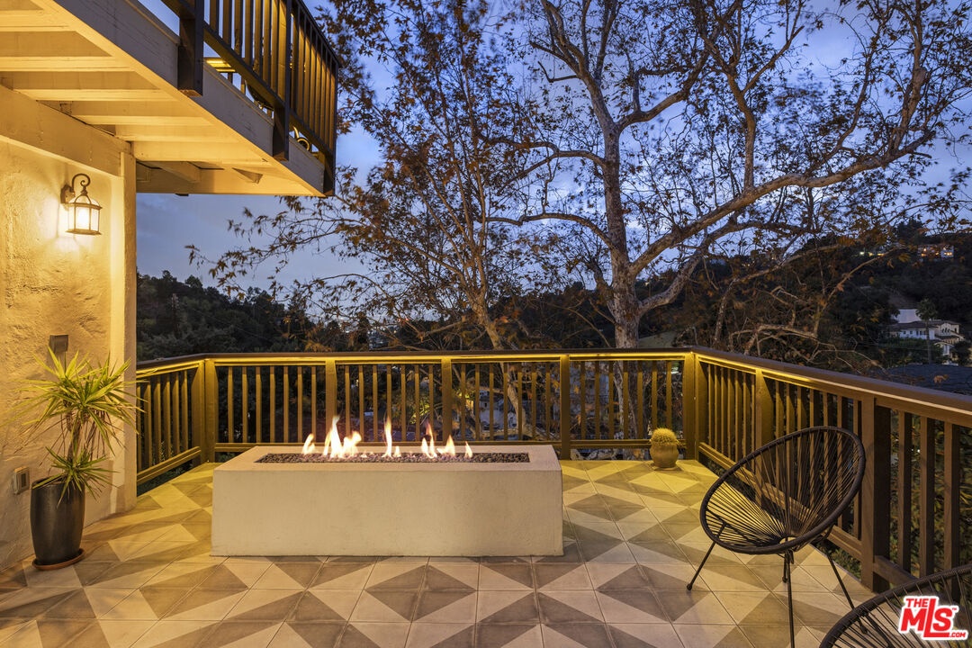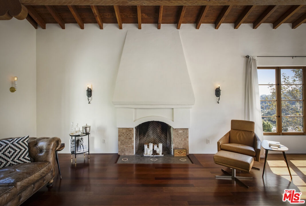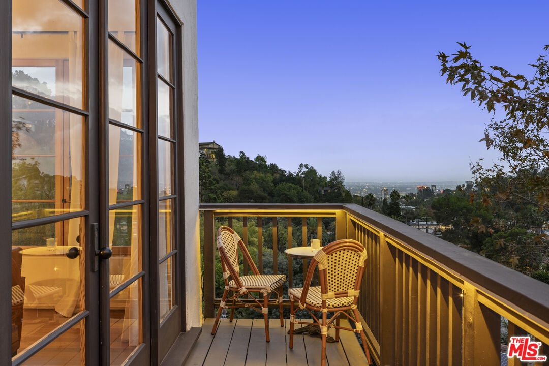 This classic Hollywoodland Spanish Colonial Estate circa 1928 is sited with privacy and bathed in natural sunlight offering stunning original character, sensational views of the canyon and city lights, spacious bright rooms and a full separate parcel landscaped as a private park with meandering paths and a myriad of fruit and flowering specimens. The gated courtyard at street level leads to tiled grand formal entry and dramatic living room with towering wood beamed ceiling, authentic stone fireplace, and original casement windows and French doors leading to a romantic balcony to take in the view. Unique pentagonal dining room opens to balcony and spacious eat-in cooks' kitchen, with vaulted wood beamed ceiling, chef's appliances, large breakfast area plus butler's pantry. Stunning tiled staircase leads to middle level with an office and three bedrooms including a luxurious primary suite; with large bedroom and gorgeous vintage style black-and-white en suite bath with floor to ceiling tiles, double sink and separate tub and shower. The third level features flex space with three spacious bright original rooms with high ceilings and natural light: including an office/library with exterior entrance, a second living room opening to a large patio; and separate family room/4th bedroom with oversized tiled bath. All three levels feature flow to outdoor covered and open balconies. This property includes a second parcel with its own APN that has been transformed to an outdoor wonderland navigated on foot through dozens of varieties of fruit, rosemary, lavender and wild sage. Entertain large groups outdoors in the lower area of the lot featuring a huge tiled patio with built-in grill. Original hardwood floors, unpainted casement doors and windows, vintage Spanish tile, built-ins, hand crafted wrought iron, and clay tile roof are some of the classic hallmarks of this historic home. Additional bonus room w/half bath. A short walk to the village offers a neighborhood cafe and grocery. An impeccable original offering beauty, ease and comfort.