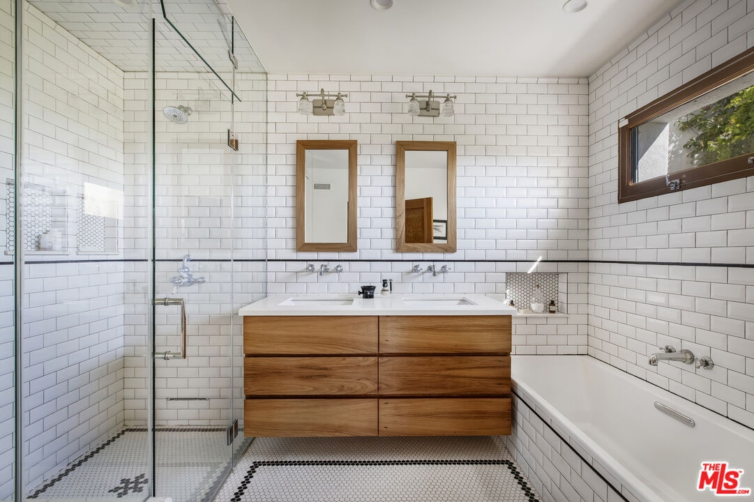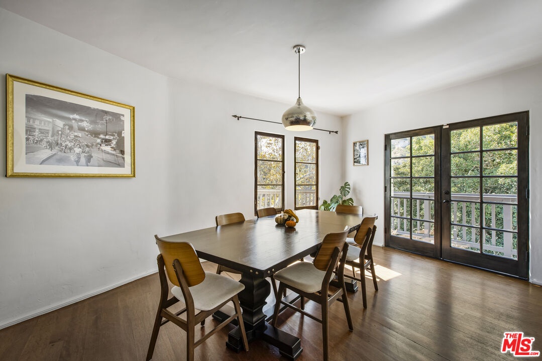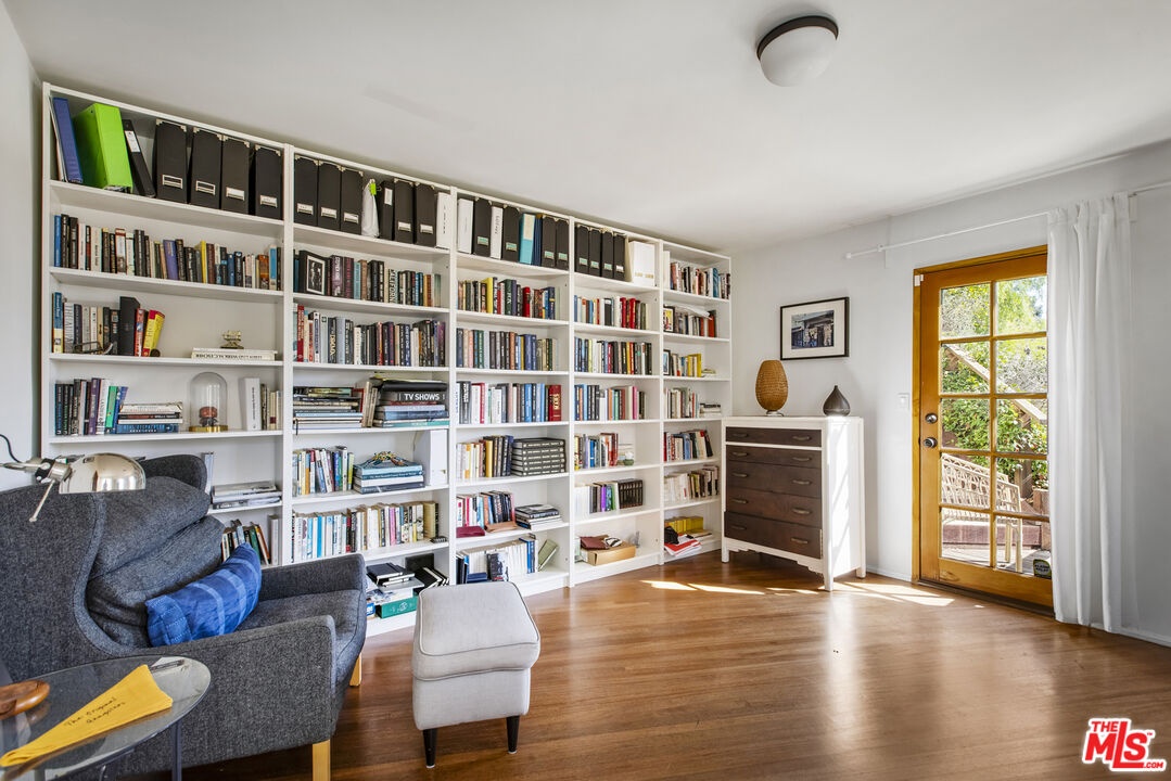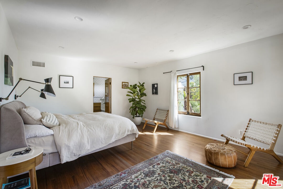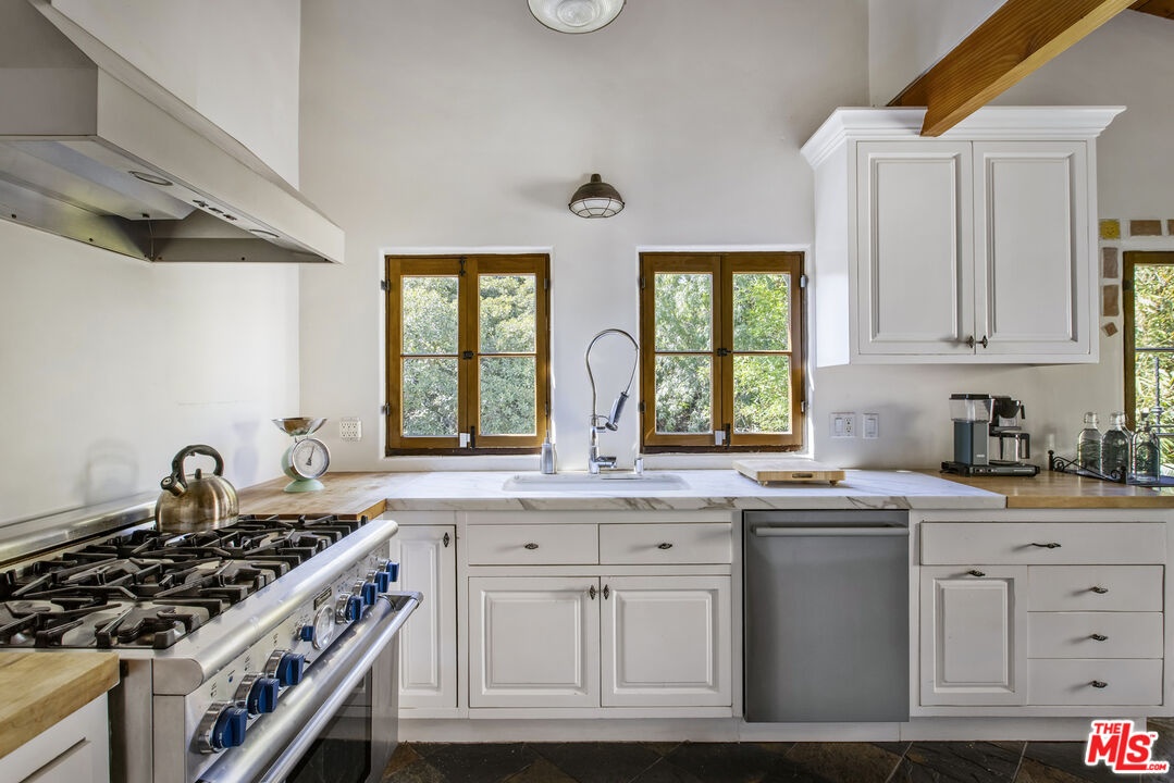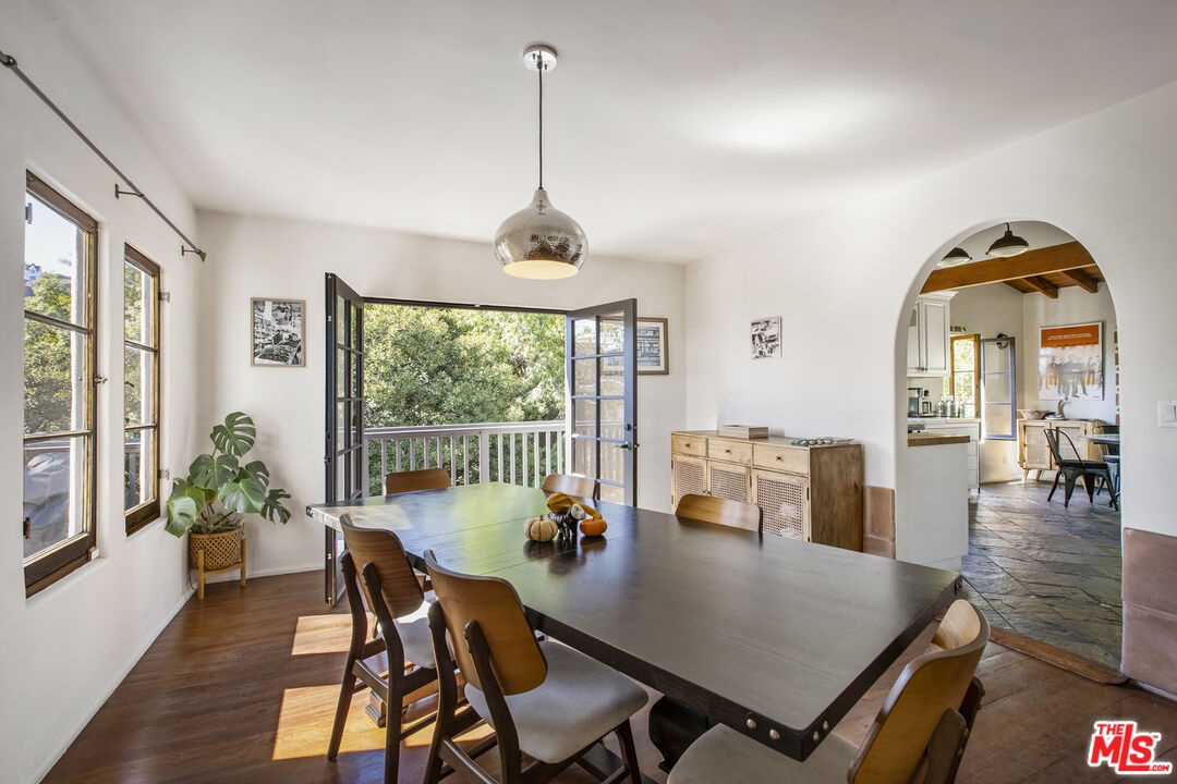 This classic Hollywoodland Spanish Colonial Estate circa 1928 is sited with privacy and bathed in natural sunlight offering stunning original character, sensational views of the canyon and city lights, spacious bright rooms and a full separate parcel landscaped as a private park with meandering paths and a myriad of fruit and flowering specimens. The gated courtyard at street level leads to tiled grand formal entry and dramatic living room with towering wood beamed ceiling, authentic stone fireplace, and original casement windows and French doors leading to a romantic balcony to take in the view. Unique pentagonal dining room opens to balcony and spacious eat-in cooks' kitchen, with vaulted wood beamed ceiling, chef's appliances, large breakfast area plus butler's pantry. Stunning tiled staircase leads to middle level with an office and three bedrooms including a luxurious primary suite; with large bedroom and gorgeous vintage style black-and-white en suite bath with floor to ceiling tiles, double sink and separate tub and shower. The third level features flex space with three spacious bright original rooms with high ceilings and natural light: including an office/library with exterior entrance, a second living room opening to a large patio; and separate family room/4th bedroom with oversized tiled bath. All three levels feature flow to outdoor covered and open balconies. This property includes a second parcel with its own APN that has been transformed to an outdoor wonderland navigated on foot through dozens of varieties of fruit, rosemary, lavender and wild sage. Entertain large groups outdoors in the lower area of the lot featuring a huge tiled patio with built-in grill. Original hardwood floors, unpainted casement doors and windows, vintage Spanish tile, built-ins, hand crafted wrought iron, and clay tile roof are some of the classic hallmarks of this historic home. Additional bonus room w/half bath. A short walk to the village offers a neighborhood cafe and grocery. An impeccable original offering beauty, ease and comfort.