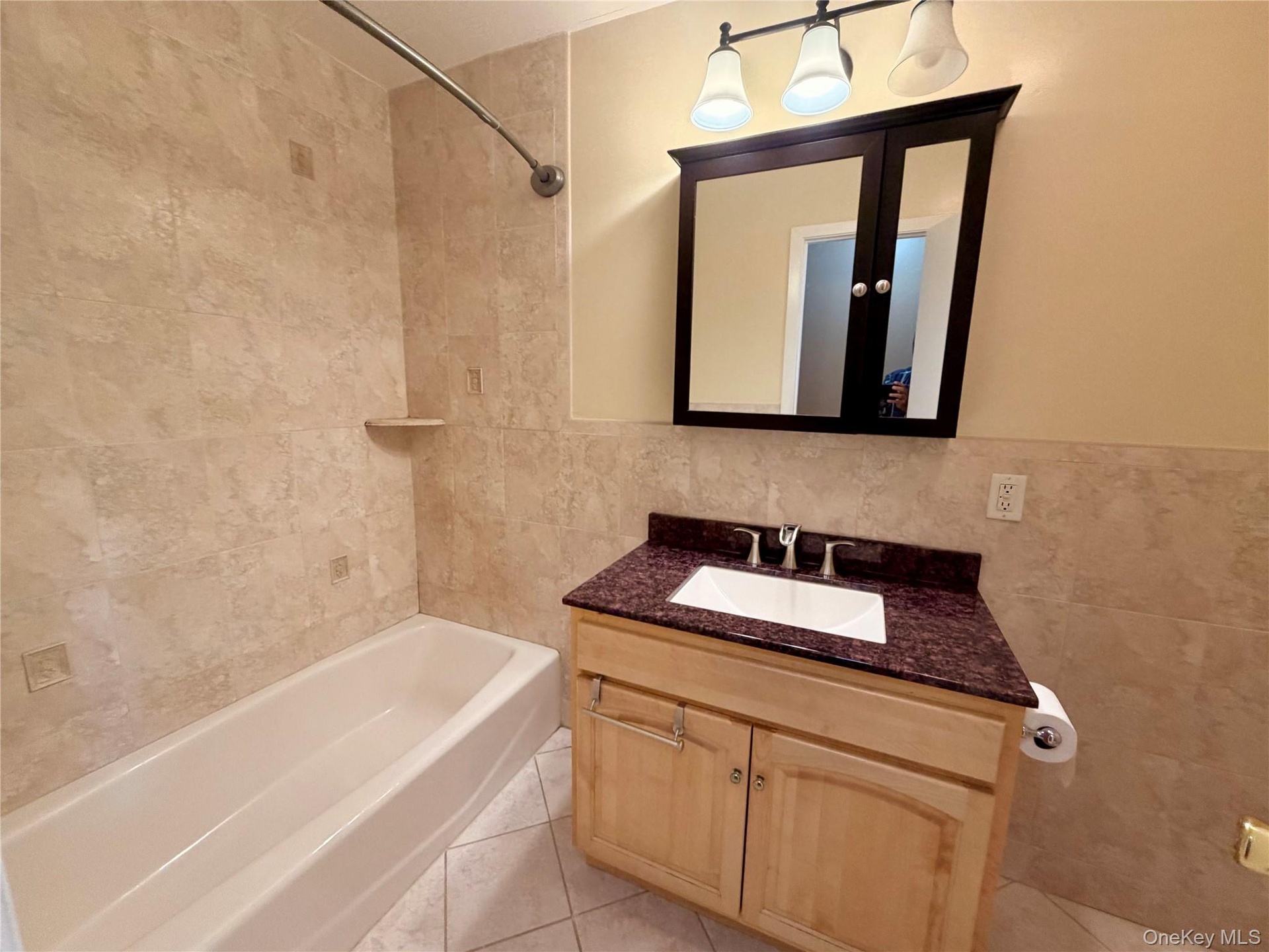 - Bathroom featuring tile walls, tub / shower combination, vanity, and light tile patterned floors