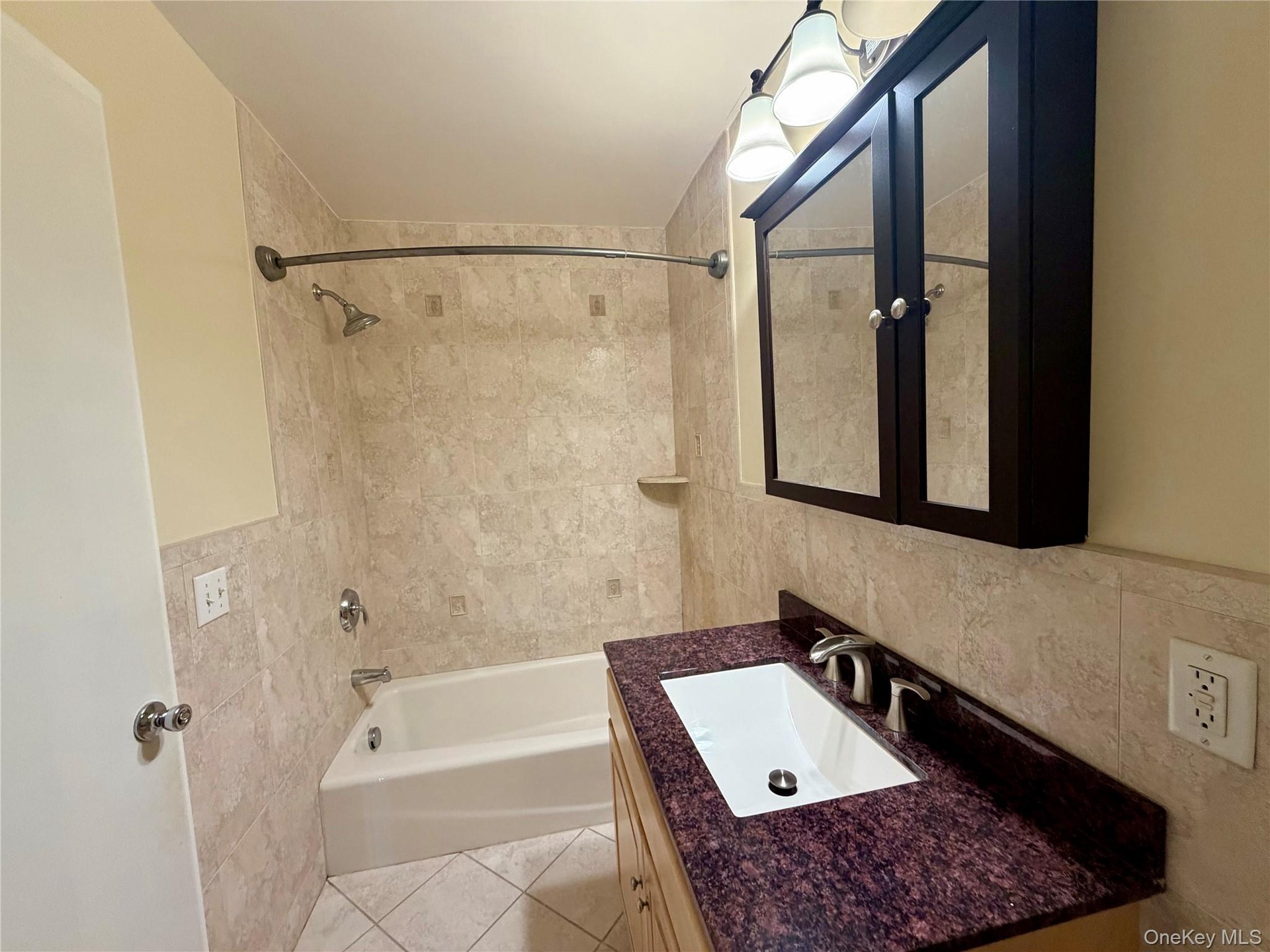 - Bathroom featuring vanity, tile walls, washtub / shower combination, and light tile patterned floors