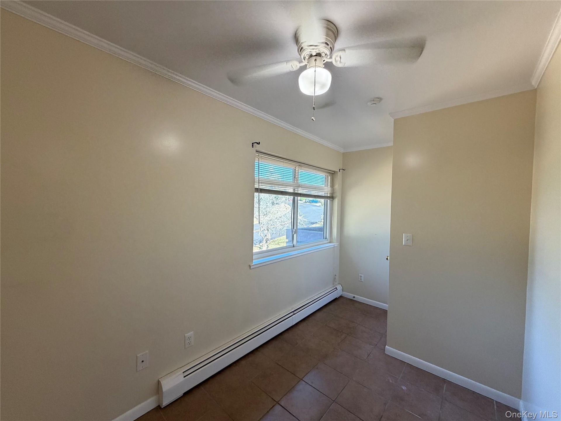 - Spare room with a baseboard radiator, ornamental molding, dark tile patterned flooring, and a ceiling fan