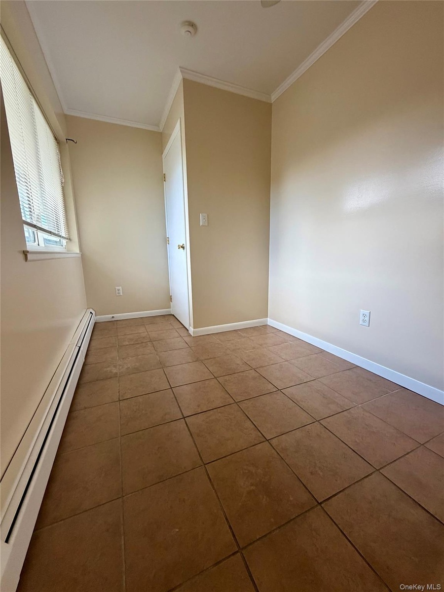- Empty room with baseboard heating, crown molding, and tile patterned floors