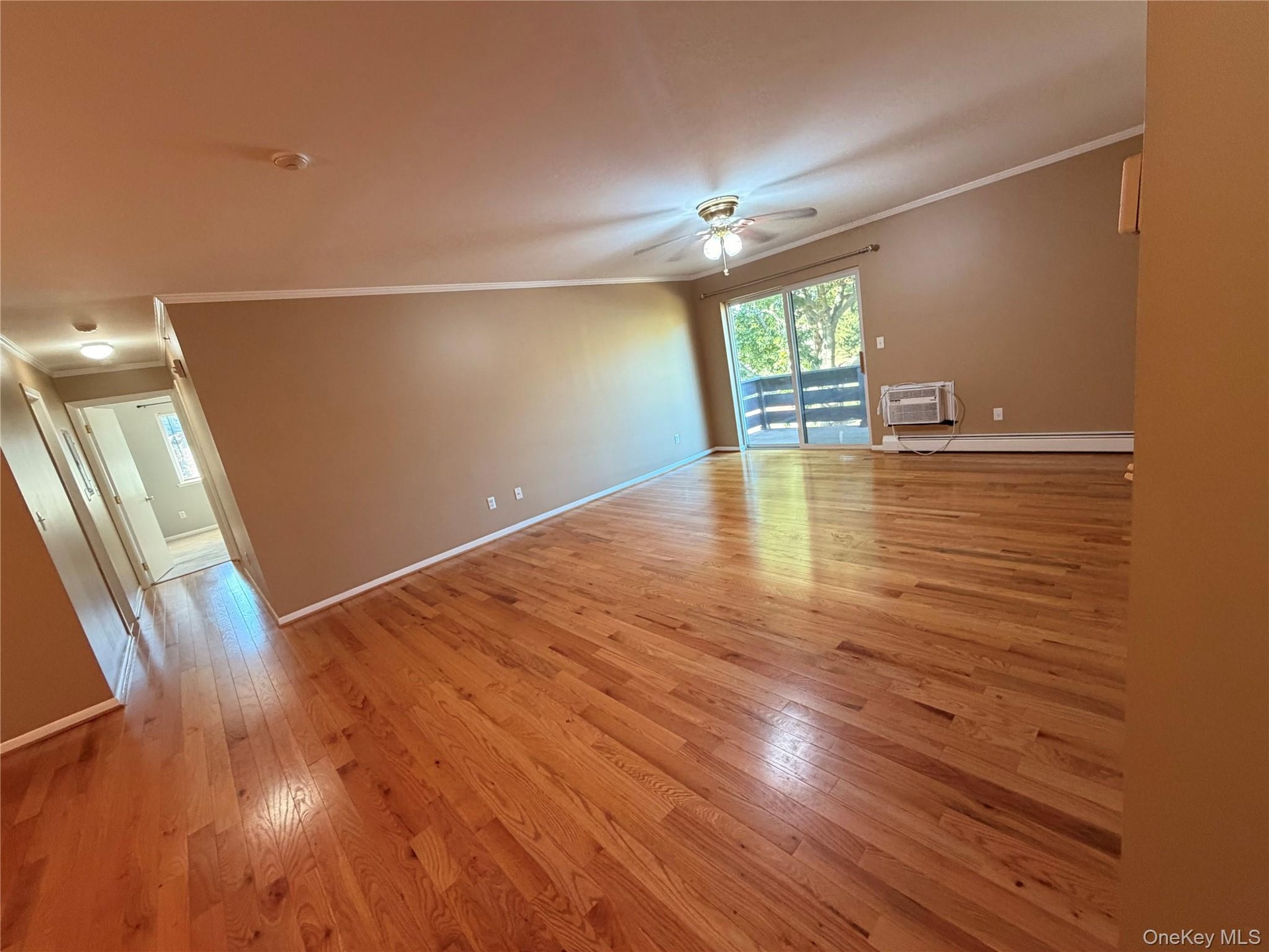 - Spare room featuring crown molding, light wood-type flooring, a ceiling fan, a wall unit AC, and baseboard heating