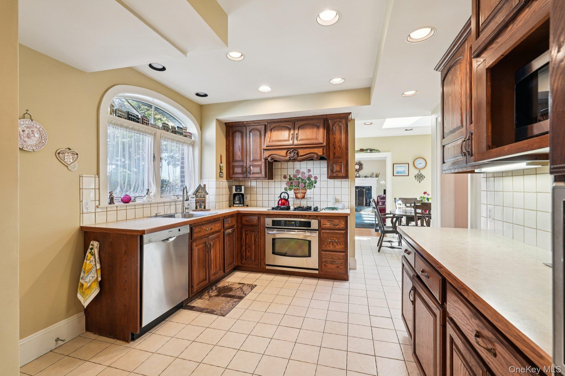 The formal living room features a stately fireplace and opens to a bright sunroom, perfect for relaxing or entertaining. The formal dining room is enhanced with decorative molding and wall sconces, while the kitchen offers recessed lighting, a skylit breakfast nook, and a door leading to the deck for easy indoor-outdoor living. A spacious family room showcases a second fireplace, a stunning Palladian window, and French doors that open to the deck—ideal for gatherings and quiet evenings alike.