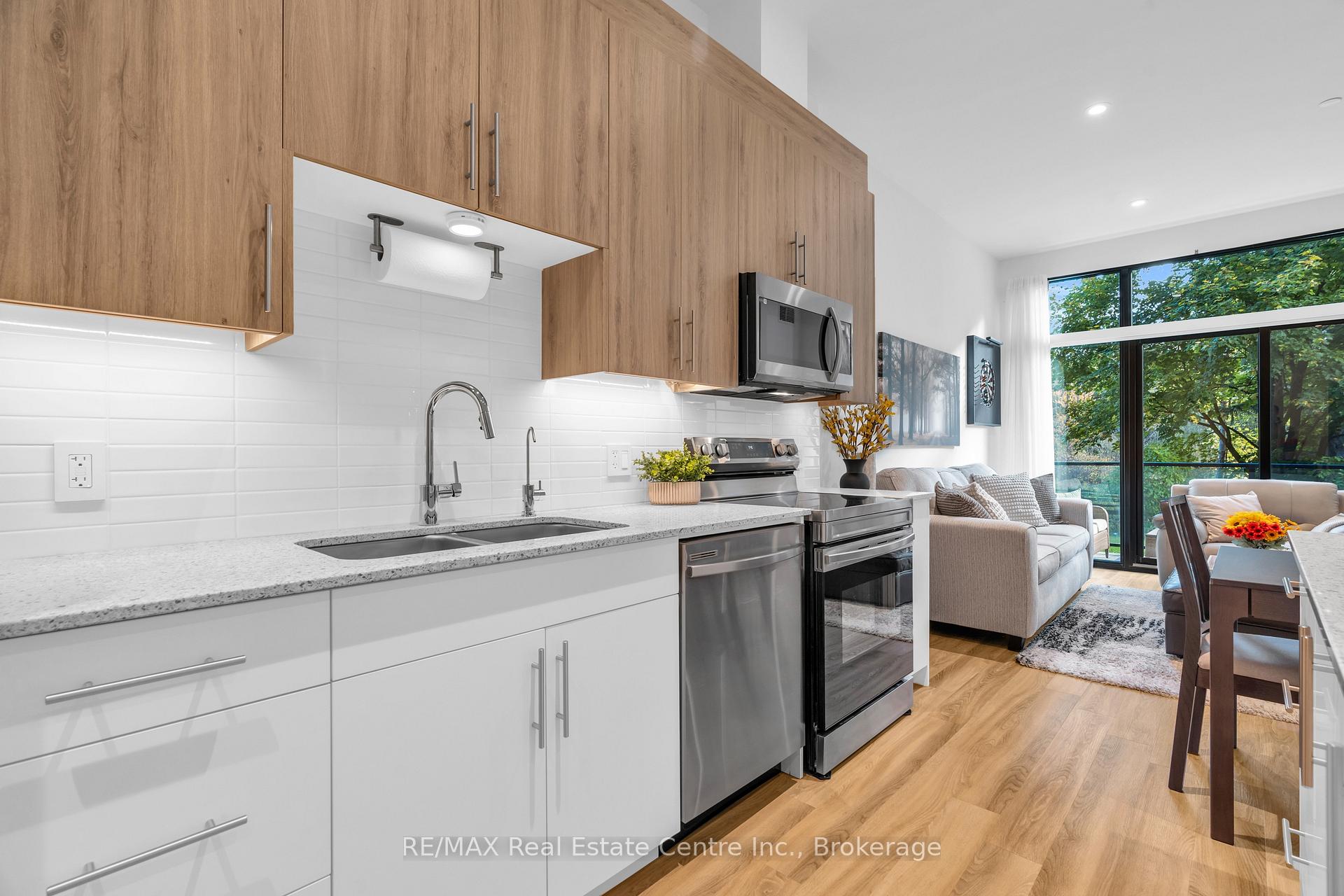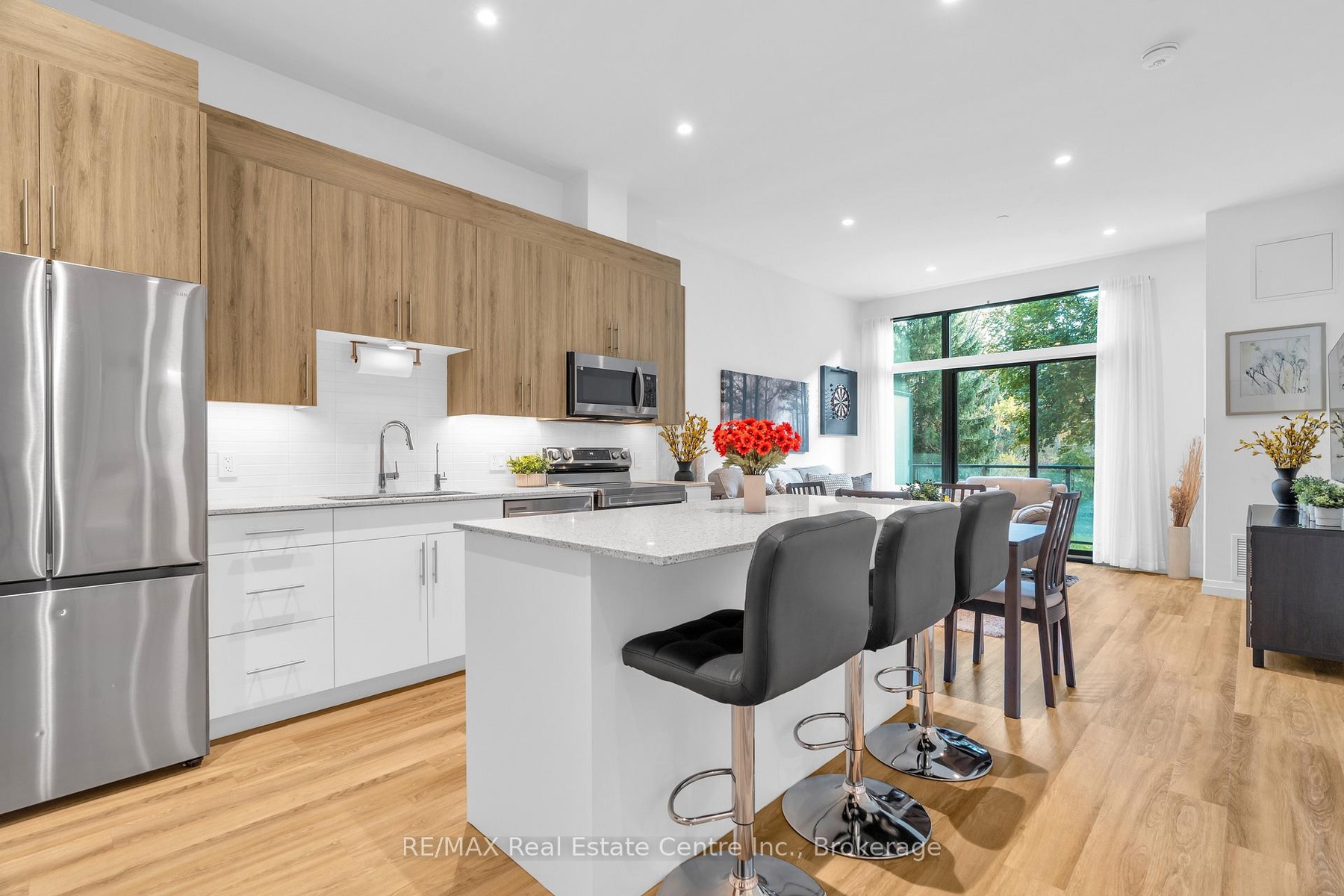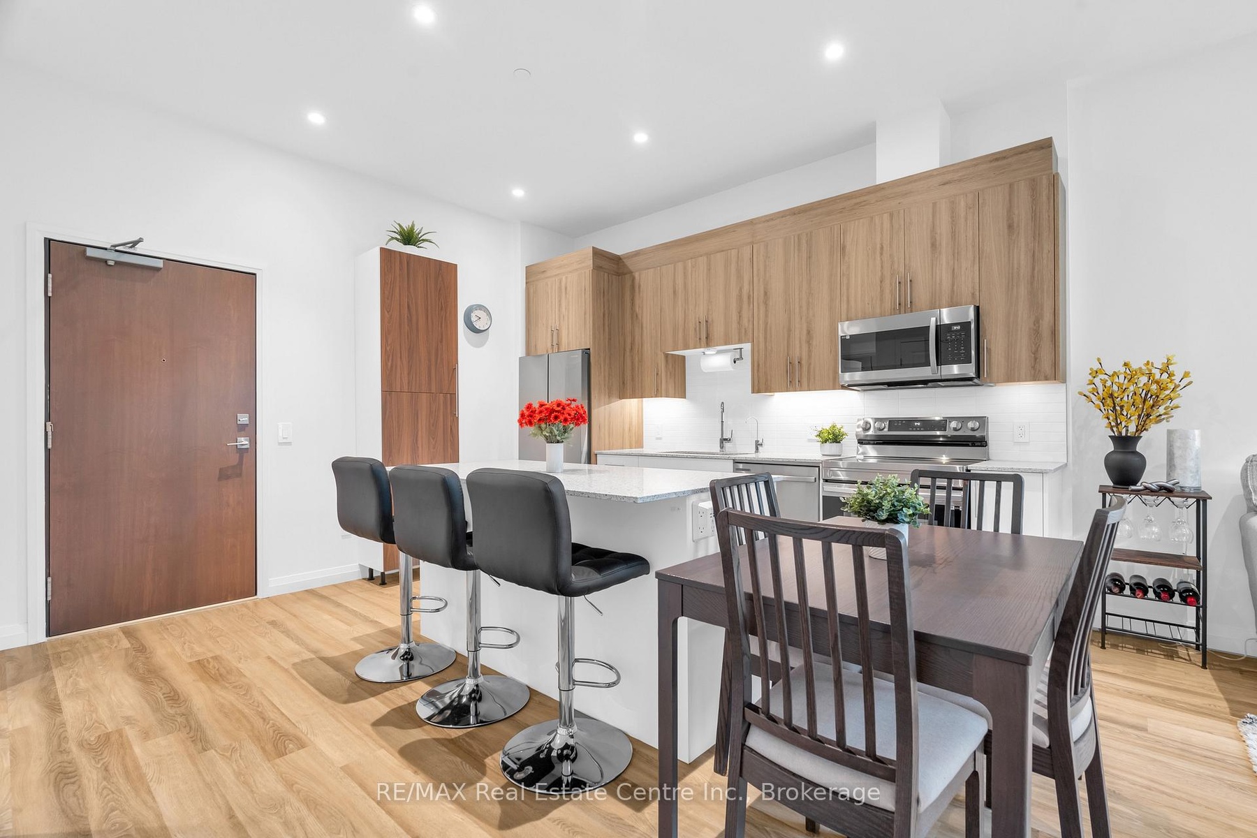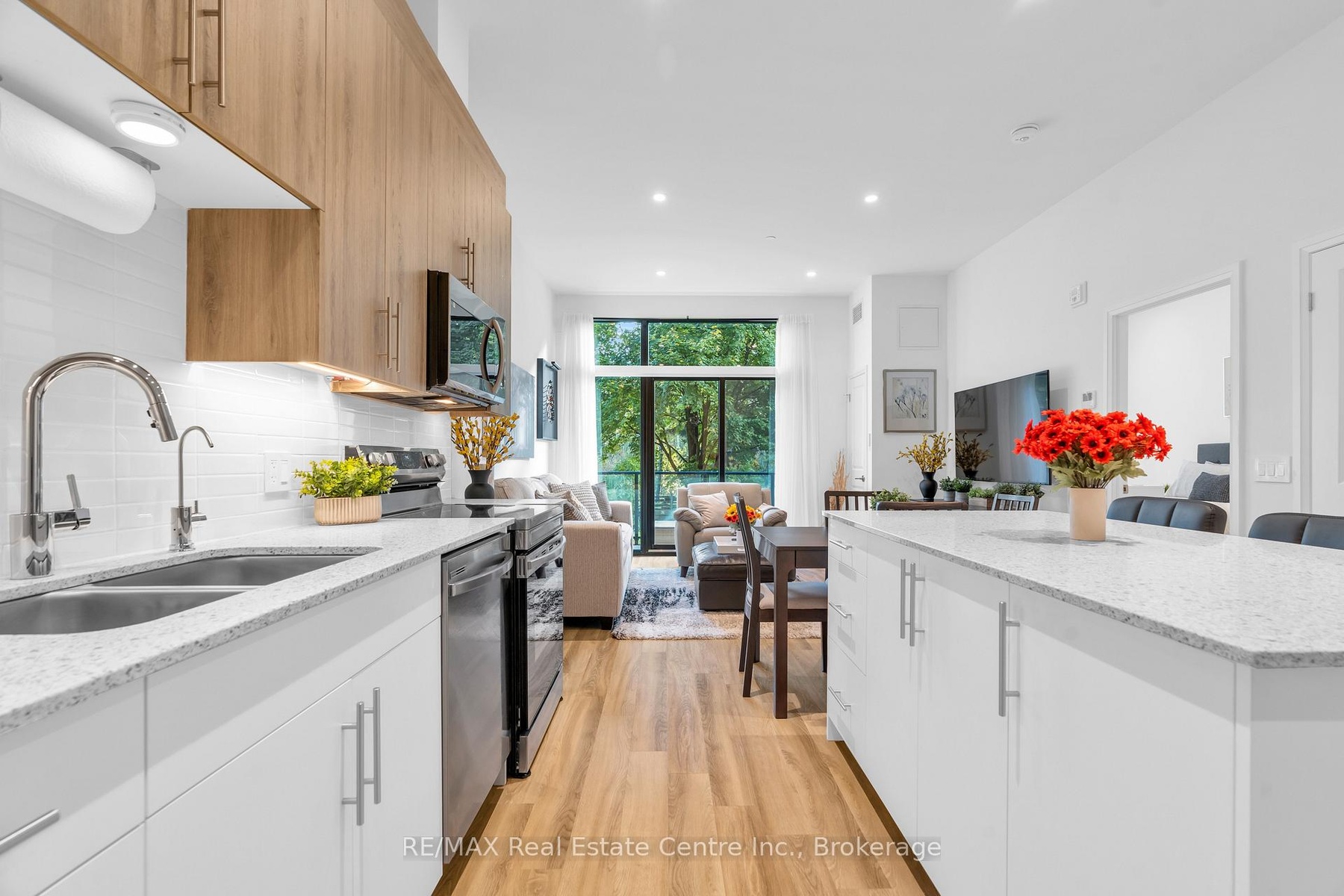 OPEN HOUSE THIS SATURDAY, OCTOBER 25TH AND SUNDAY, OCTOBER 26TH FROM 2-4PM. AN AGENT WILL KINDLY GREET YOU IN THE LOBBY. Welcome to 525 New Dundee Road, Unit 101 - a modern and bright one-bedroom condo located on the main floor of a one-year-old building. This spacious unit features 10-foot ceilings, an open-concept layout, and a private balcony with serene views of the forest and walking trail behind. The kitchen offers stainless steel appliances, sleek cabinetry, and a reverse osmosis water system, while the living area is enhanced with convenient power remote-control blinds for added comfort and ease. Enjoy the convenience of in-suite laundry, ample storage, and modern finishes throughout. The building offers exceptional amenities including a fitness centre, sauna, party room, library, a Pet Wash Station and a beautiful outdoor patio with BBQs - perfect for entertaining or relaxing. Ideally located just minutes from Highway 401, Conestoga College, shopping, restaurants, and walking trails, this home offers a perfect balance of comfort, nature, and accessibility. A great opportunity for first-time buyers, downsizers, or investors seeking low-maintenance living in a growing community.