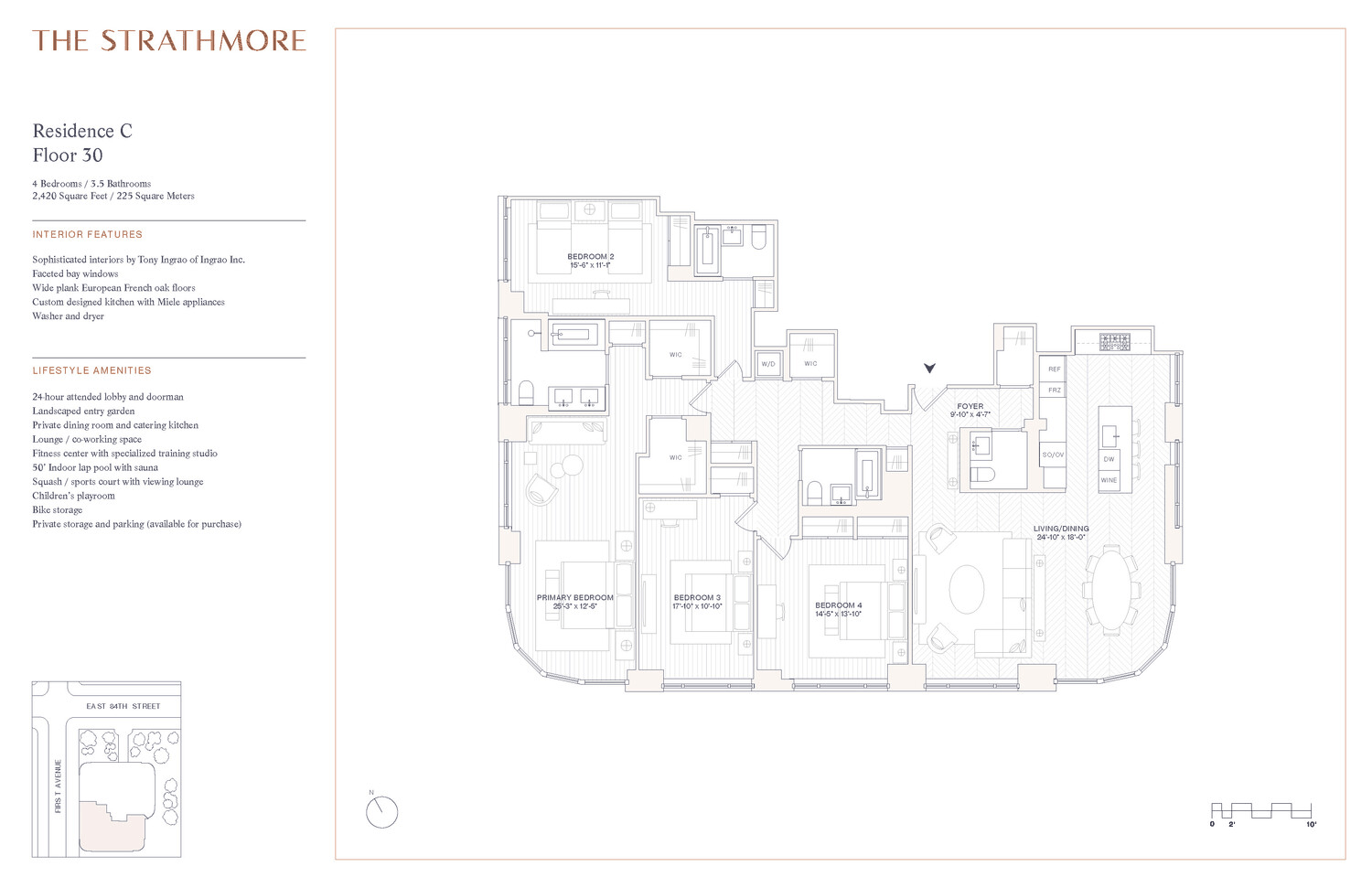 Residence 30C is an oversized 2,420 SF four-bedroom, 3.5-bath home with south, east and west exposures creating unforgettable panoramas of the NYC cityscape. This home features 7-inch- wide European French oak flooring in a chevron pattern, foyer with four closets, powder room, and elegant bay windows that frame the unobstructed city views spanning from the East River to Central Park. The gracious corner living room leads to the separate chef's kitchen featuring Miele appliances and wine fridge, an oversized Imperial Danby marble island - perfect for barstools, custom Italian cabinetry accented by polished nickel fixtures, and stainless-steel sink with garbage disposal. The graciously sized corner primary bedroom suite includes a sitting area, dual walk-in closets and linen closet, and features iconic city views. The windowed ensuite 5-fixture bathroom features custom vanities with Volaka marble countertops and undermount sinks, accented by polished nickel fixtures. Greek Volaka marble flooring with a Grigio Niccola border finishes the elegant design. The secondary bedroom has two closets and ensuite bathroom with soaking tub featuring a custom vanity with Turkish Bianco Dolomite marble countertop, walls and flooring. The two additional secondary bedrooms and shared bathroom with tub complete the home. Residence 30C comes with smart thermostats and vented washer and dryer.