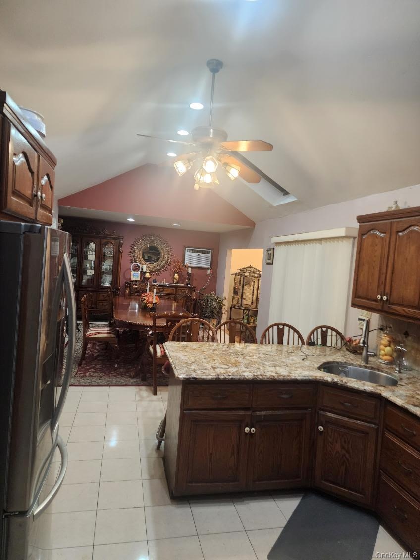 - Kitchen with lofted ceiling, appliances with stainless steel finishes, light stone countertops, light tile patterned floors, and a breakfast bar area