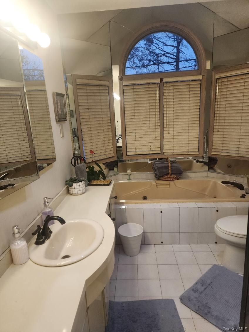 - Full bathroom with vanity, a tub with jets, and light tile patterned floors