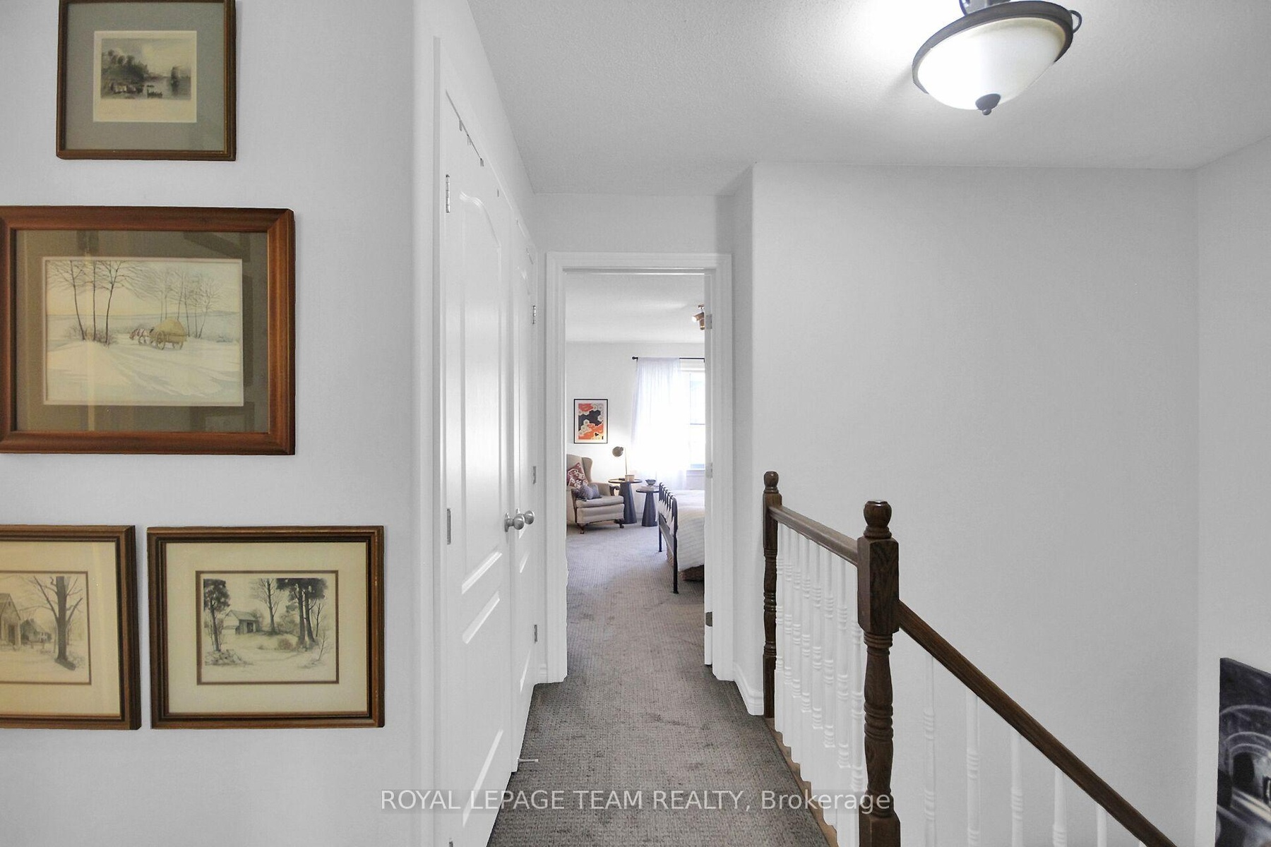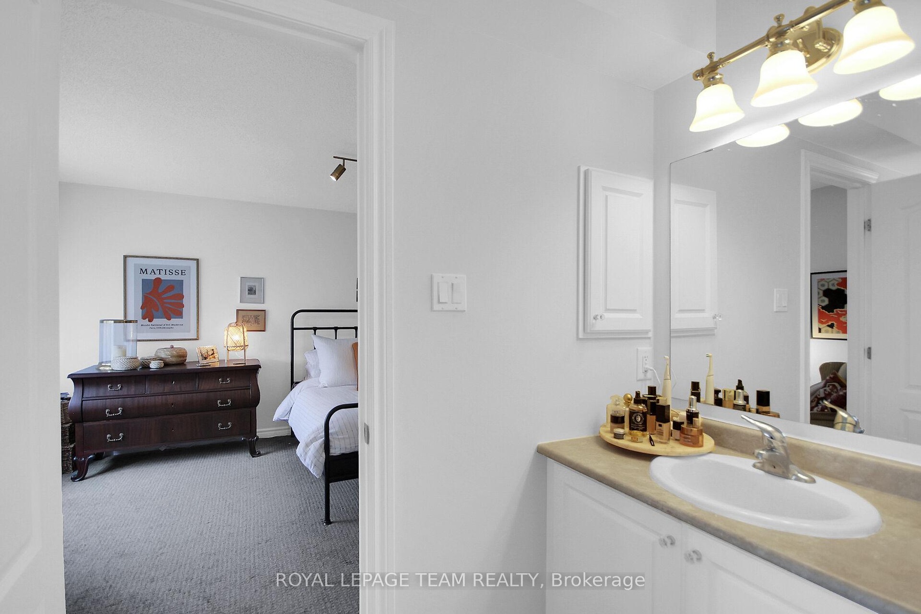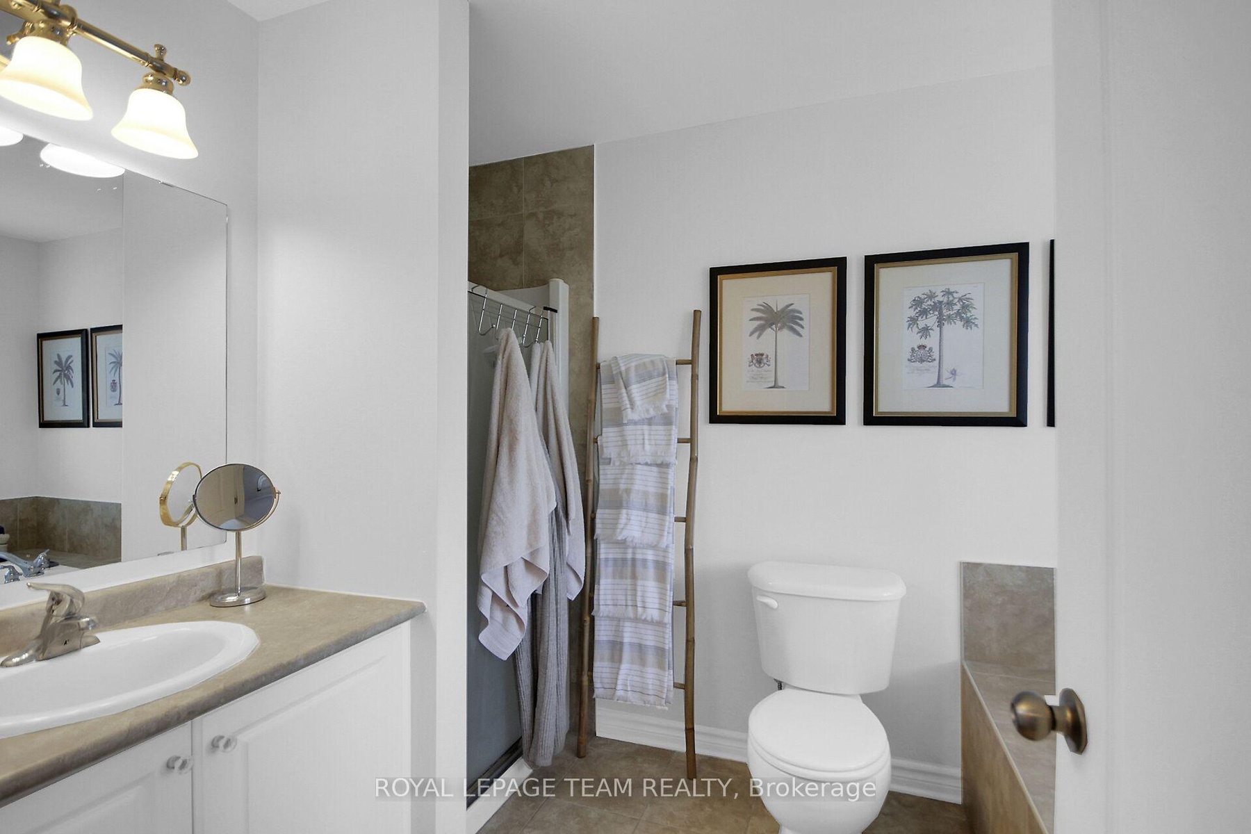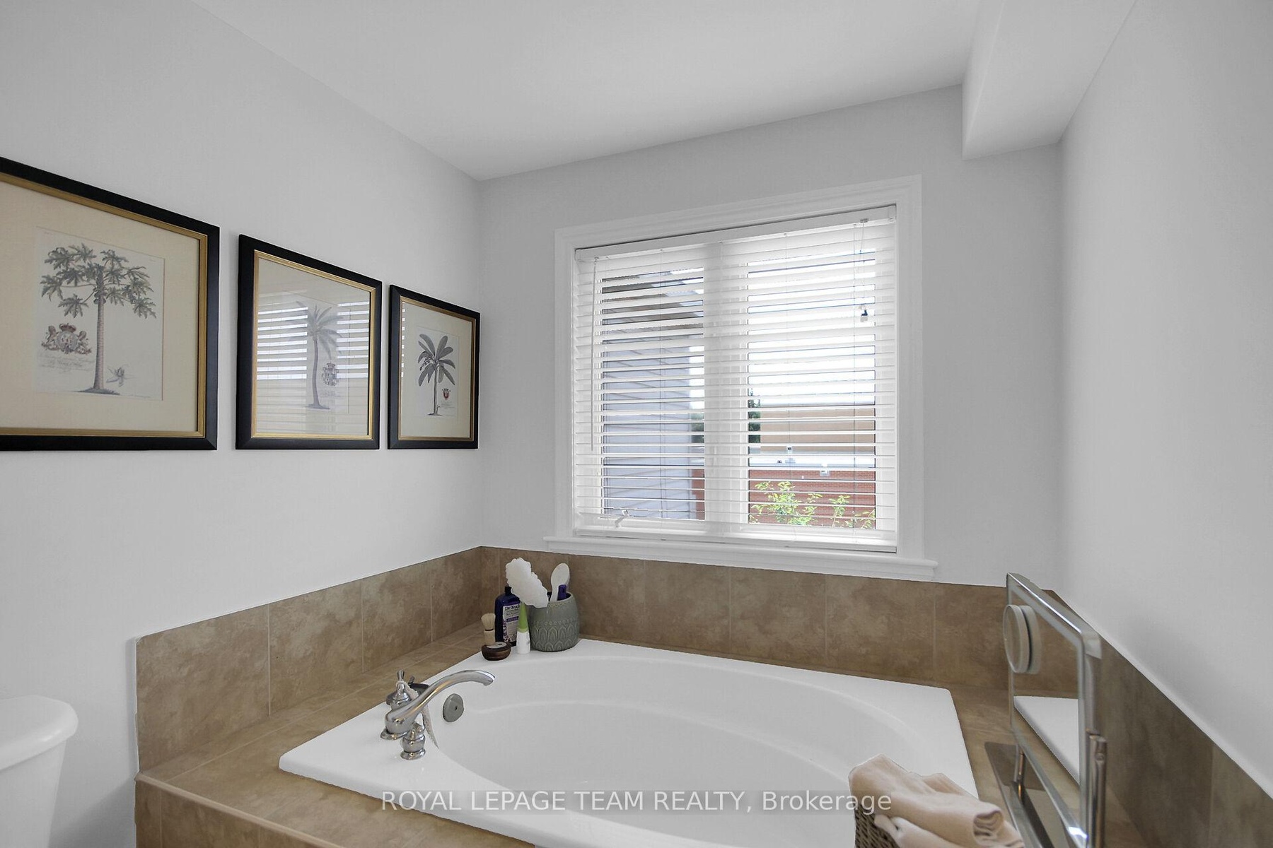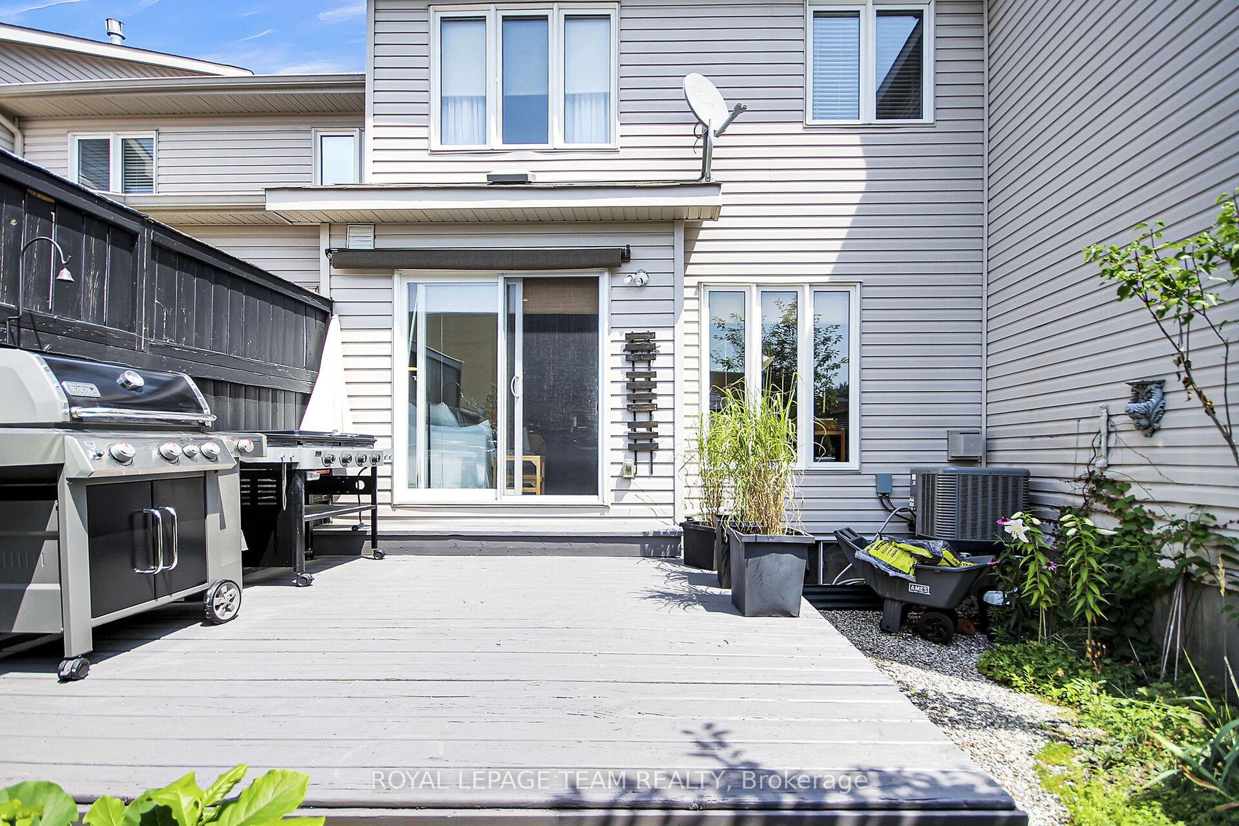 Gorgeous townhome in Stittsville. This beautifully updated family home is located on a private crescent, near schools, parks, transit and shopping. The backyard is a tranquil oasis with a large deck, an oversize gazebo and amazing plants. There are no overlooking neighbours to the rear as this unit backs on to the quiet side of an elementary school. The ground floor is an expansive open plan and has hardwood and pot lights throughout. Entering the contemporary tiled foyer from the garage or front porch, one passes a convenient powder room into a sweeping living/dining room with gas fireplace and tall windows. This is paralleled by the show-stopping modern kitchen with dramatic custom cabinets, white quartz counters, a coveted farmhouse sink and high-end appliances. The bright adjoining breakfast/sitting area leads to the deck through tall patio doors. Upstairs features three generous bedrooms. The principal bedroom overlooks the private back yard. It boasts a walk-in closet and updated ensuite with separate shower and inviting soaking tub. The other two bright bedrooms at the front of the house share a family bath. The washer and dryer are conveniently placed on this level. The basement has been furnished with another complete modern bathroom. There is a large family room and two generous storage areas. This home has all that a family needs.