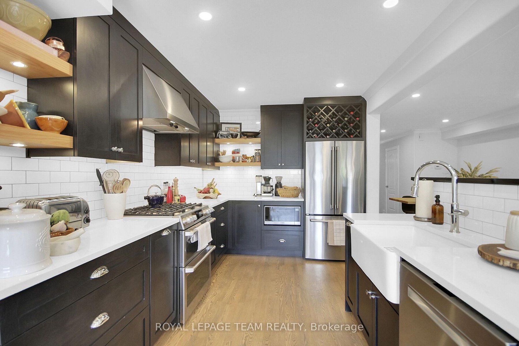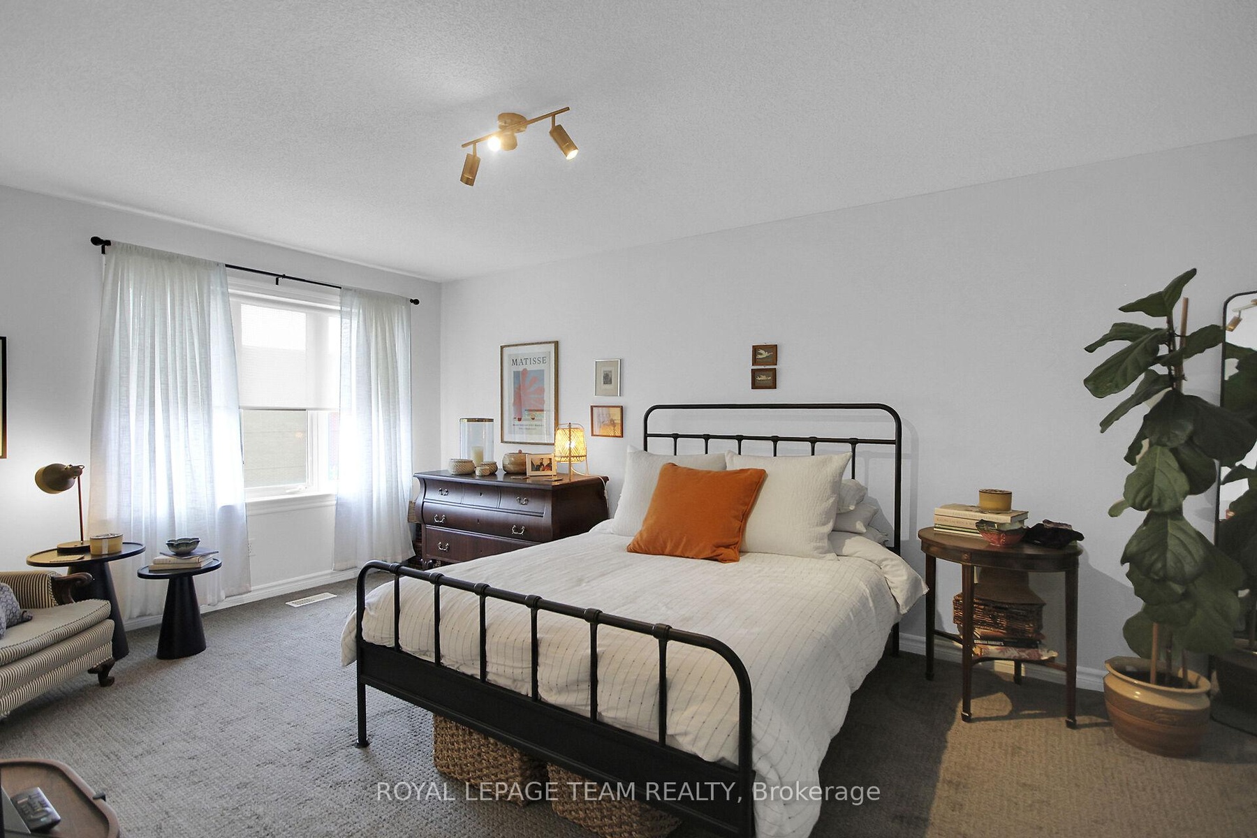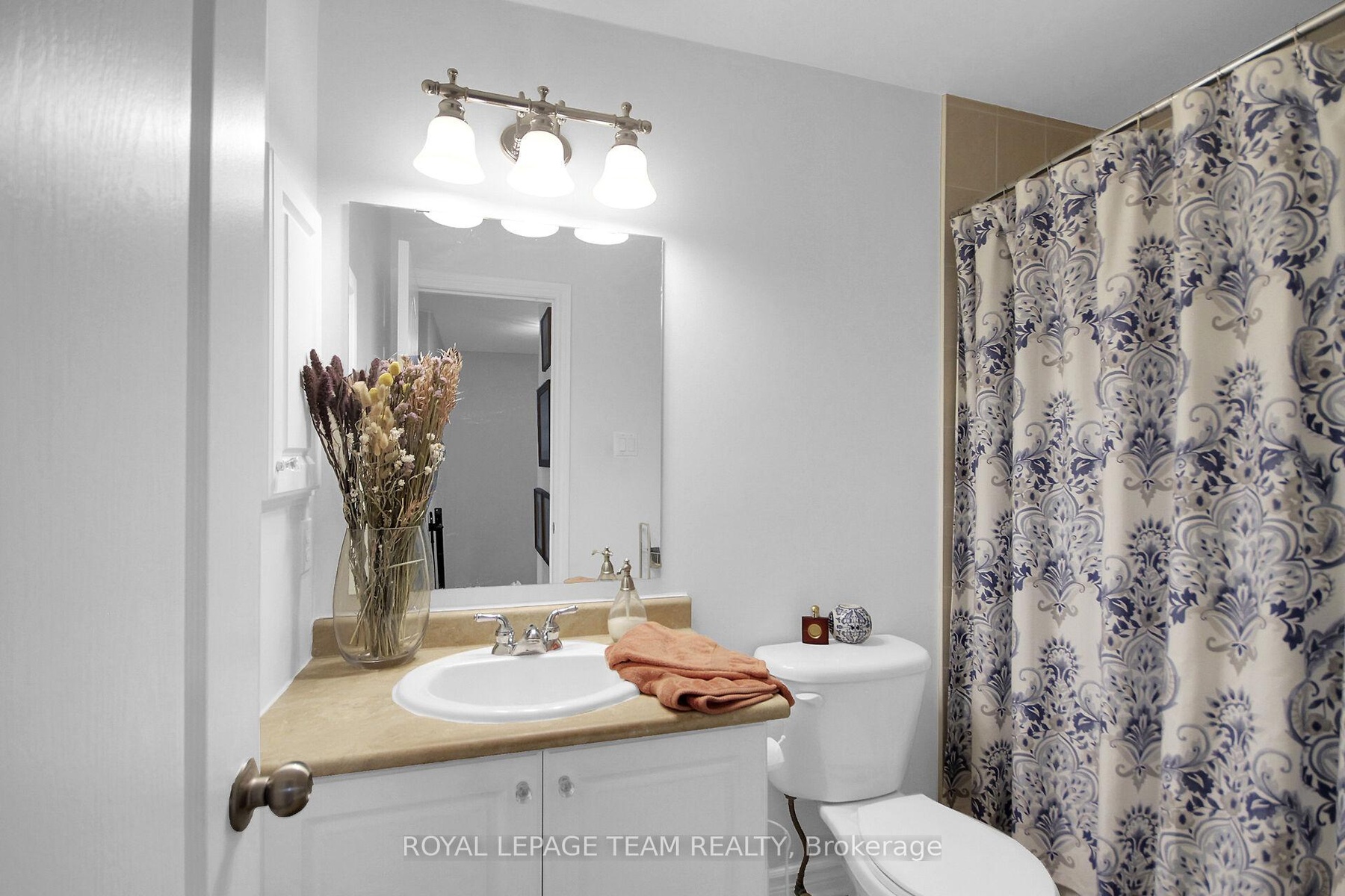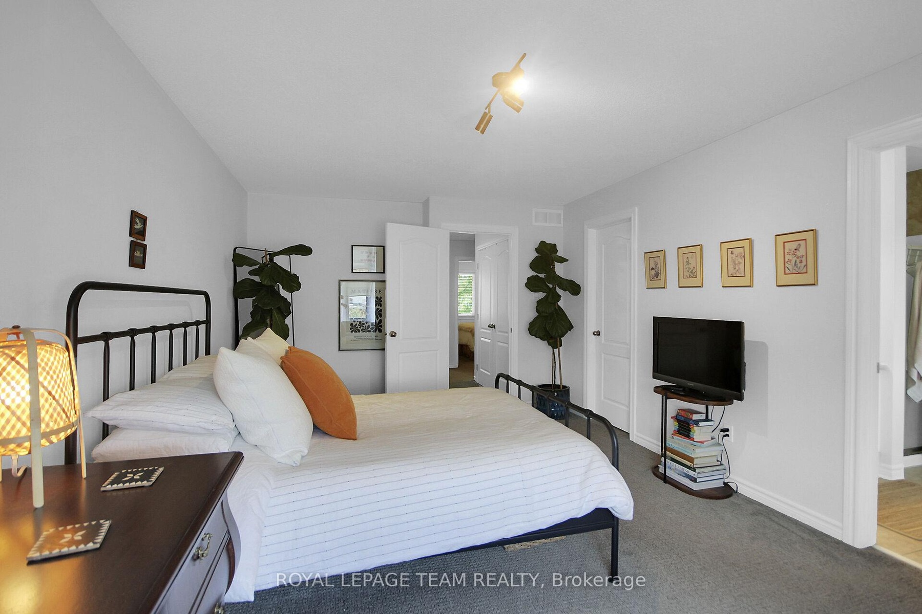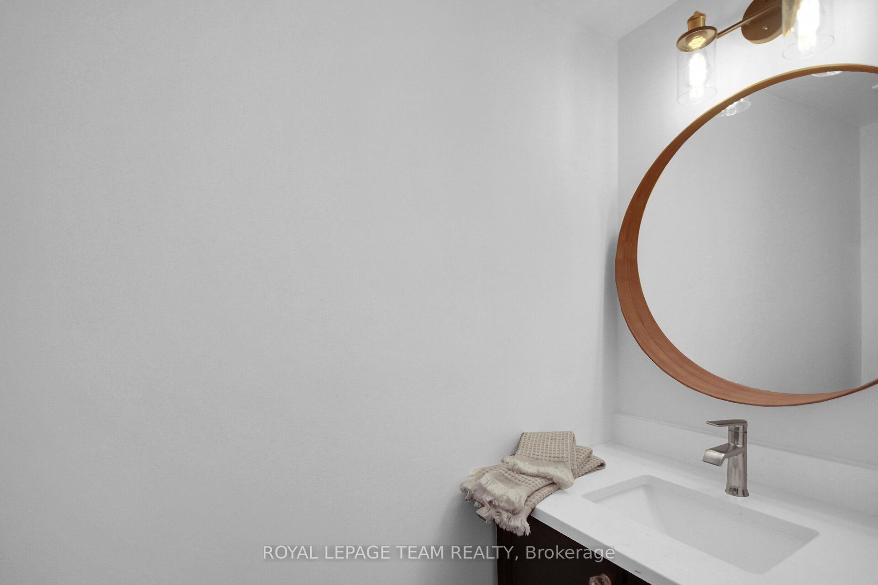 Gorgeous townhome in Stittsville. This beautifully updated family home is located on a private crescent, near schools, parks, transit and shopping. The backyard is a tranquil oasis with a large deck, an oversize gazebo and amazing plants. There are no overlooking neighbours to the rear as this unit backs on to the quiet side of an elementary school. The ground floor is an expansive open plan and has hardwood and pot lights throughout. Entering the contemporary tiled foyer from the garage or front porch, one passes a convenient powder room into a sweeping living/dining room with gas fireplace and tall windows. This is paralleled by the show-stopping modern kitchen with dramatic custom cabinets, white quartz counters, a coveted farmhouse sink and high-end appliances. The bright adjoining breakfast/sitting area leads to the deck through tall patio doors. Upstairs features three generous bedrooms. The principal bedroom overlooks the private back yard. It boasts a walk-in closet and updated ensuite with separate shower and inviting soaking tub. The other two bright bedrooms at the front of the house share a family bath. The washer and dryer are conveniently placed on this level. The basement has been furnished with another complete modern bathroom. There is a large family room and two generous storage areas. This home has all that a family needs.