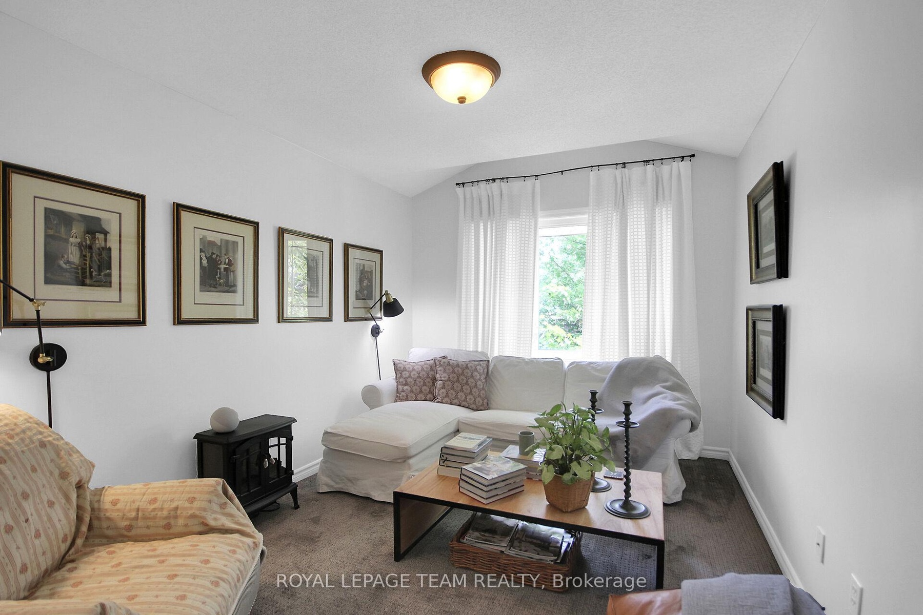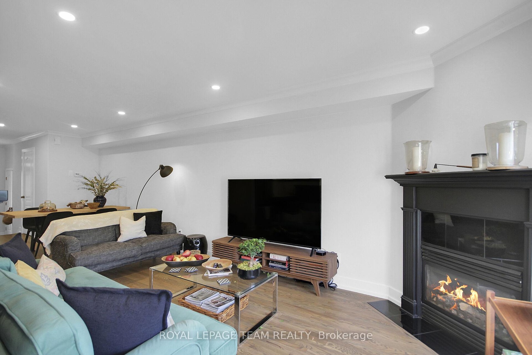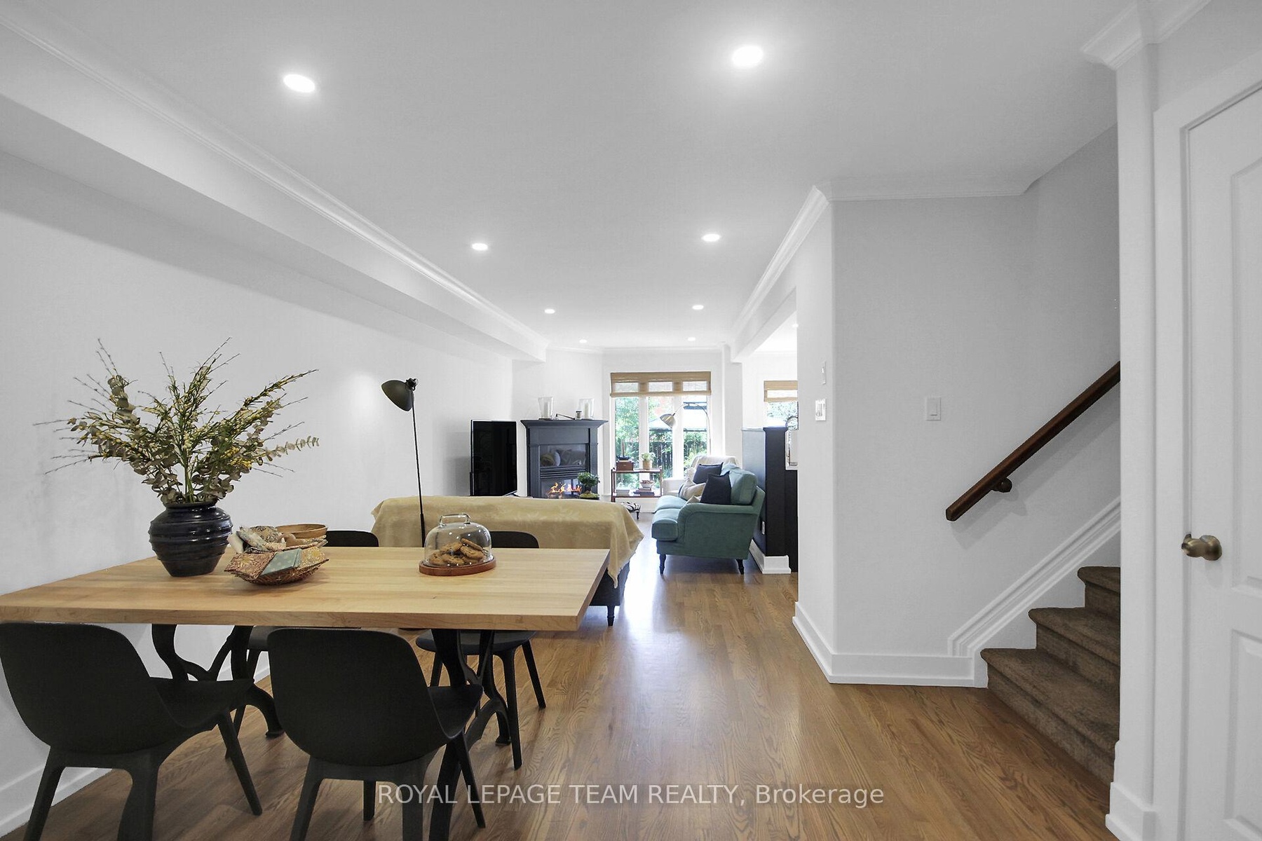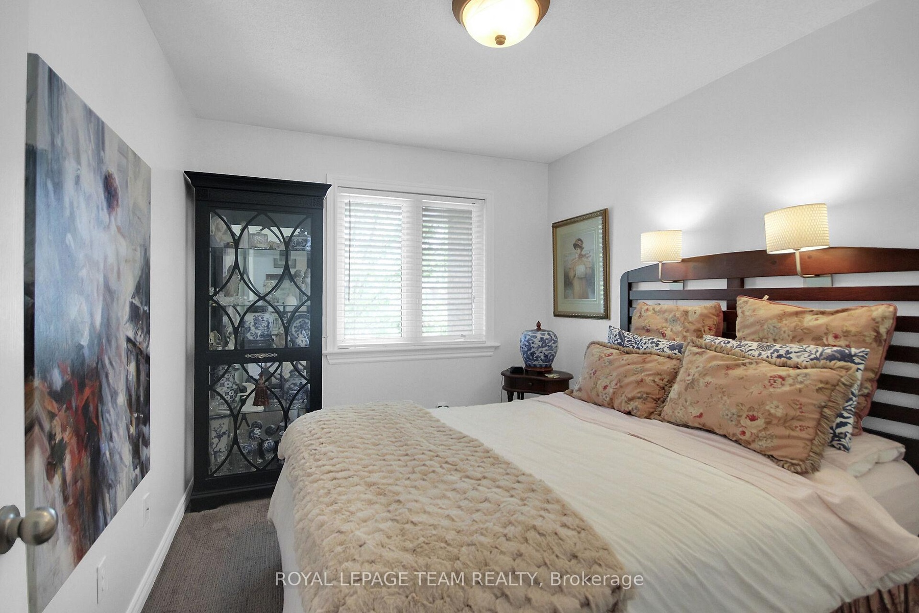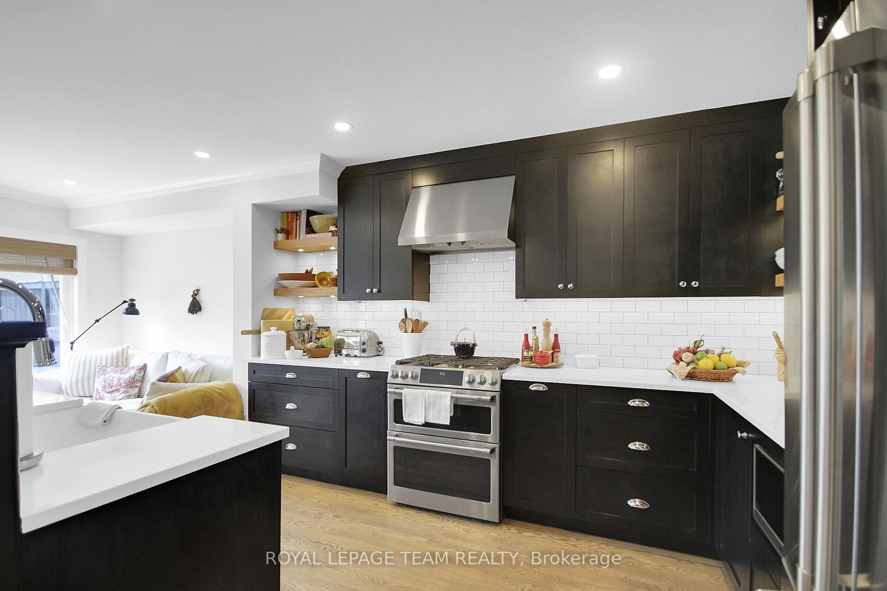 Gorgeous townhome in Stittsville. This beautifully updated family home is located on a private crescent, near schools, parks, transit and shopping. The backyard is a tranquil oasis with a large deck, an oversize gazebo and amazing plants. There are no overlooking neighbours to the rear as this unit backs on to the quiet side of an elementary school. The ground floor is an expansive open plan and has hardwood and pot lights throughout. Entering the contemporary tiled foyer from the garage or front porch, one passes a convenient powder room into a sweeping living/dining room with gas fireplace and tall windows. This is paralleled by the show-stopping modern kitchen with dramatic custom cabinets, white quartz counters, a coveted farmhouse sink and high-end appliances. The bright adjoining breakfast/sitting area leads to the deck through tall patio doors. Upstairs features three generous bedrooms. The principal bedroom overlooks the private back yard. It boasts a walk-in closet and updated ensuite with separate shower and inviting soaking tub. The other two bright bedrooms at the front of the house share a family bath. The washer and dryer are conveniently placed on this level. The basement has been furnished with another complete modern bathroom. There is a large family room and two generous storage areas. This home has all that a family needs.