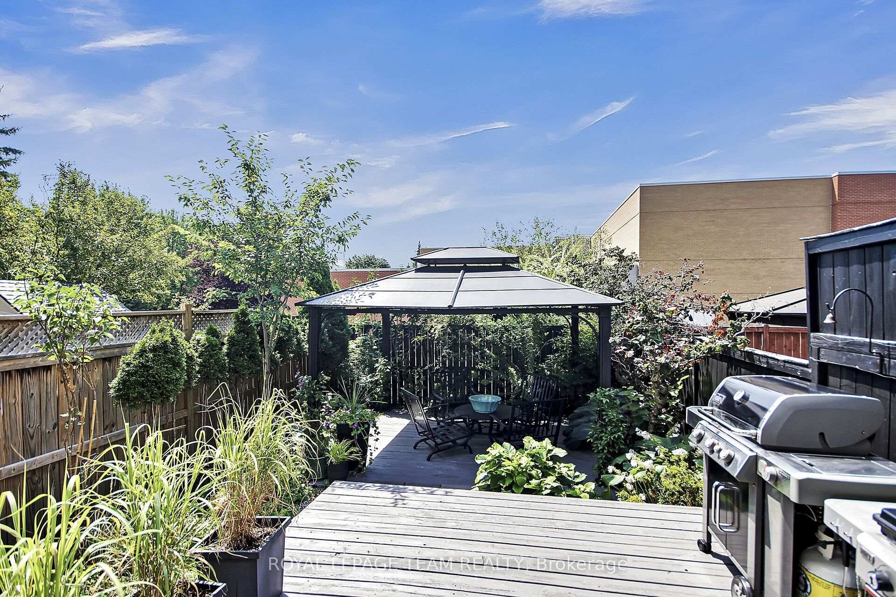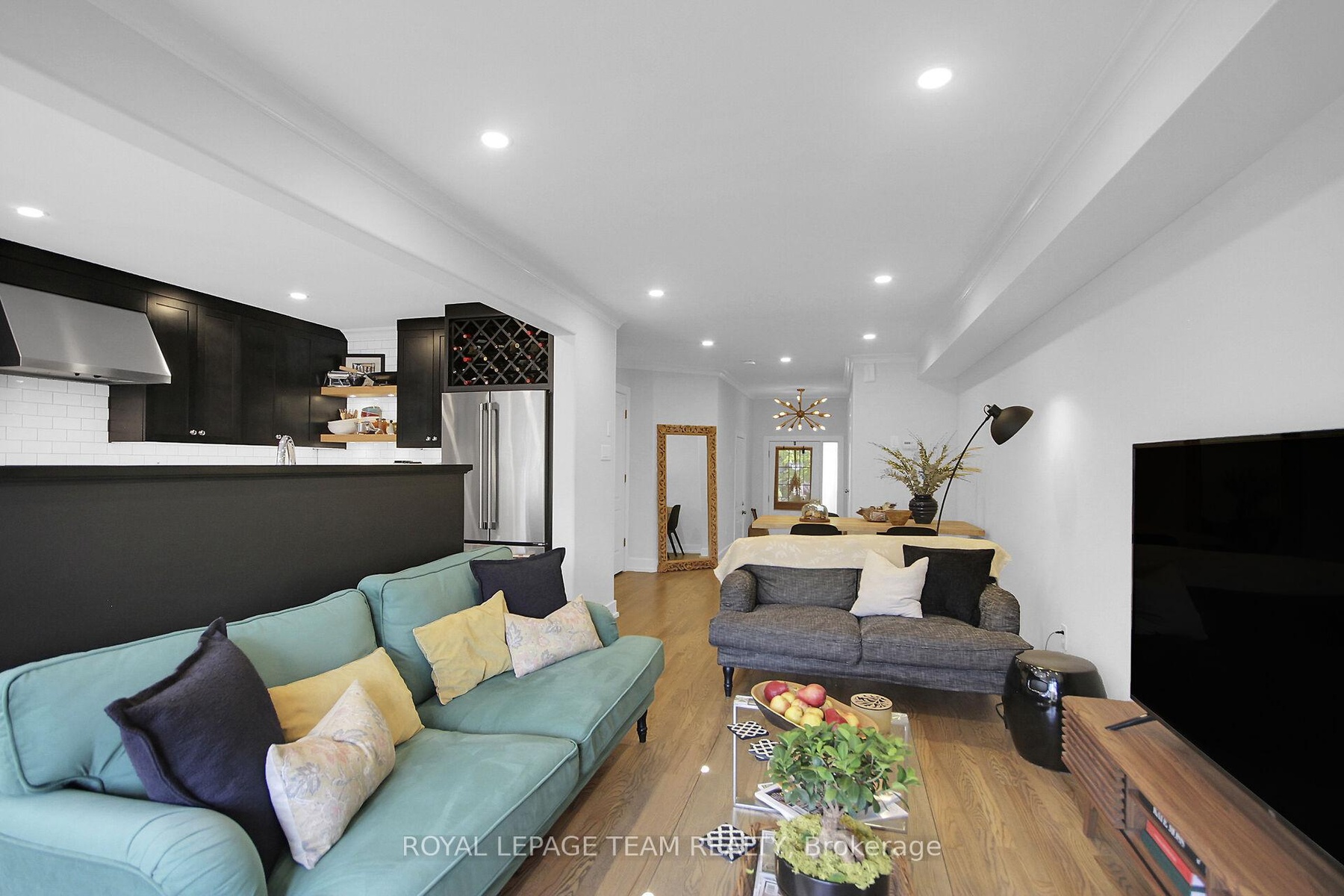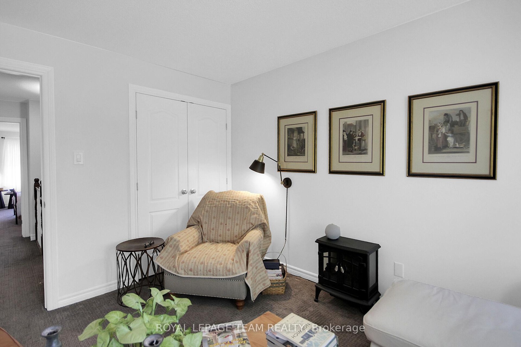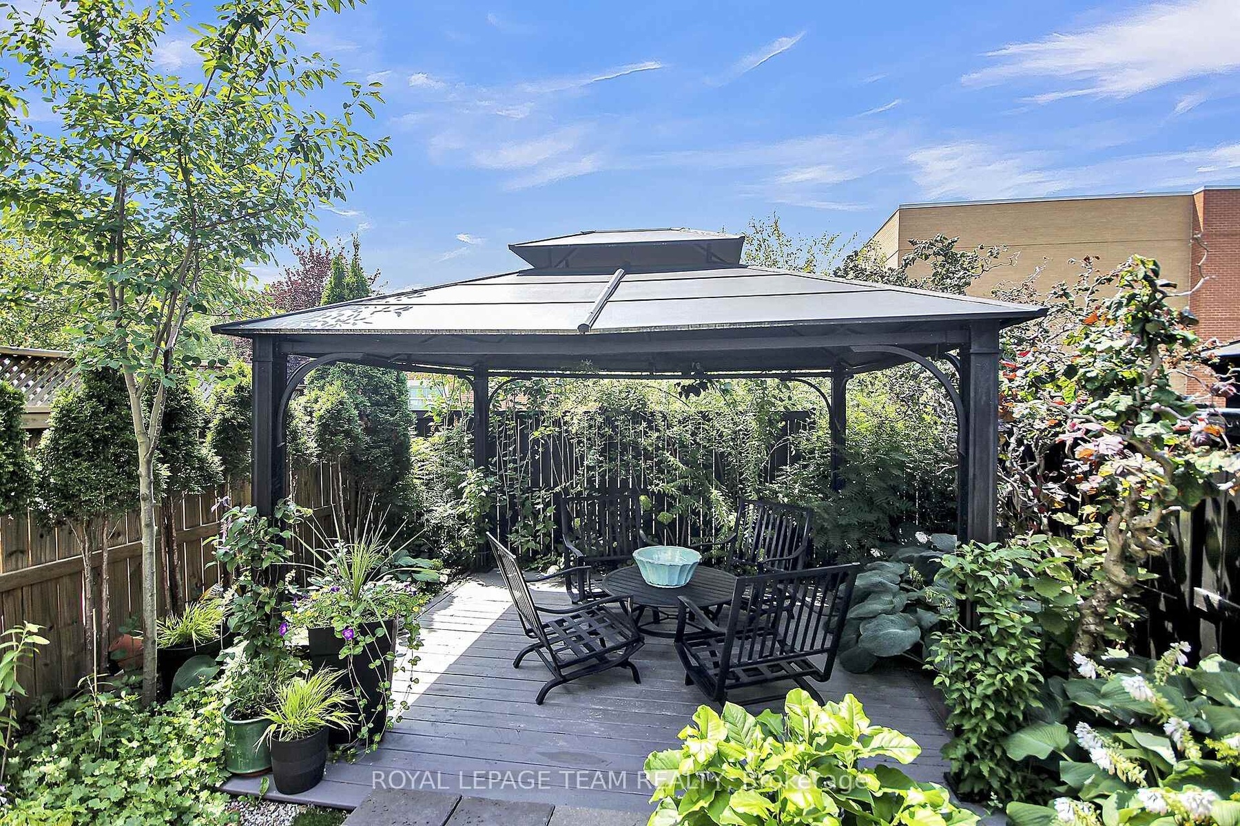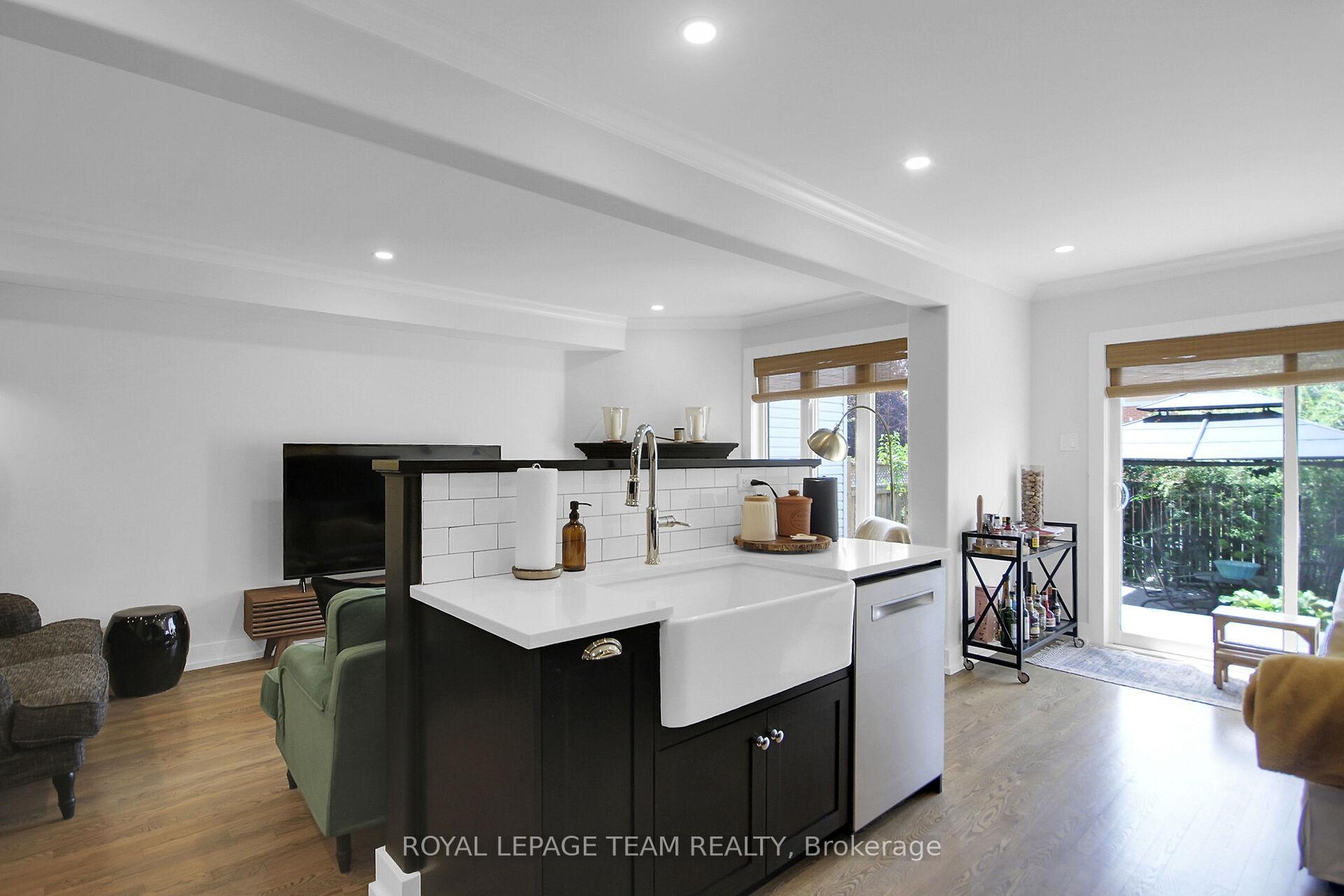 Gorgeous townhome in Stittsville. This beautifully updated family home is located on a private crescent, near schools, parks, transit and shopping. The backyard is a tranquil oasis with a large deck, an oversize gazebo and amazing plants. There are no overlooking neighbours to the rear as this unit backs on to the quiet side of an elementary school. The ground floor is an expansive open plan and has hardwood and pot lights throughout. Entering the contemporary tiled foyer from the garage or front porch, one passes a convenient powder room into a sweeping living/dining room with gas fireplace and tall windows. This is paralleled by the show-stopping modern kitchen with dramatic custom cabinets, white quartz counters, a coveted farmhouse sink and high-end appliances. The bright adjoining breakfast/sitting area leads to the deck through tall patio doors. Upstairs features three generous bedrooms. The principal bedroom overlooks the private back yard. It boasts a walk-in closet and updated ensuite with separate shower and inviting soaking tub. The other two bright bedrooms at the front of the house share a family bath. The washer and dryer are conveniently placed on this level. The basement has been furnished with another complete modern bathroom. There is a large family room and two generous storage areas. This home has all that a family needs.
