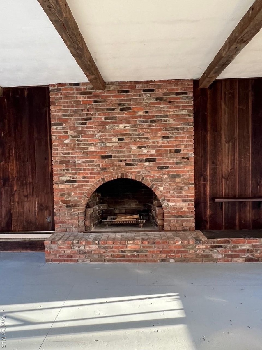 - Unfurnished living room featuring wooden walls, a fireplace, beam ceiling, concrete flooring, and a baseboard radiator