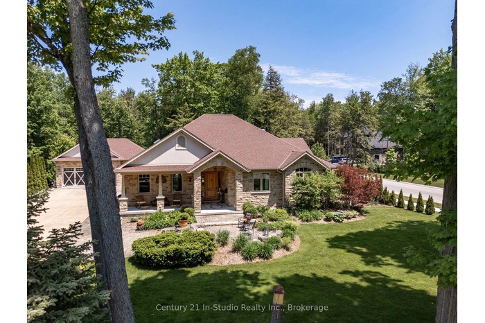 Nestled on a half-acre lot surrounded by mature trees, this exquisite Craftsman-inspired executive residence-custom built by Seaman-offers a blend of timeless design and modern luxury. A spacious covered porch leads to a welcoming foyer that opens to the home office, dining room, gourmet kitchen, and expansive living room. At the heart of this stands a majestic stone fireplace soaring to meet the 18-foot cathedral ceiling. The dedicated office, with built-in bookcases and a picturesque view of the front yard, provides an ideal setting for remote work or a home-based business. The chef's kitchen is a culinary dream, featuring a generous central island with a six-burner Viking cooktop, range hood, B/I Ovens and an oversized fridge/freezer. A walk-in pantry adds both convenience and charm. French garden doors in the living room lead to a private patio-perfect for al fresco dining and enjoying tranquil summer evenings. The primary suite is a true retreat, offering direct patio access, a tray ceiling with recessed lighting, a cozy window seat, and abundant natural light. The spa-inspired ensuite boasts a walk-in tiled shower, elegant dressing table, and a generously sized basin, complemented by a custom-organized walk-in closet. A second bedroom features wall-to-wall closet and full bath with a tub/shower combination. The family entry includes a spacious secondary foyer, a large mudroom with laundry, a tiled dog wash station, and direct access to the oversized triple garage and patio. The lower level is equally impressive, offering a family room sized for a pool table, two additional bedrooms, and a full bath with shower. Additional amenities include a cold room, storage, and utility. The unfinished portion is roughed-in and ready for a fully equipped in-law suite, providing flexibility for multi-generational living. Professionally landscaped with an irrigation system, this masterpiece was crafted for family and friends! Easy stroll to Lake Huron. Certified R2000.