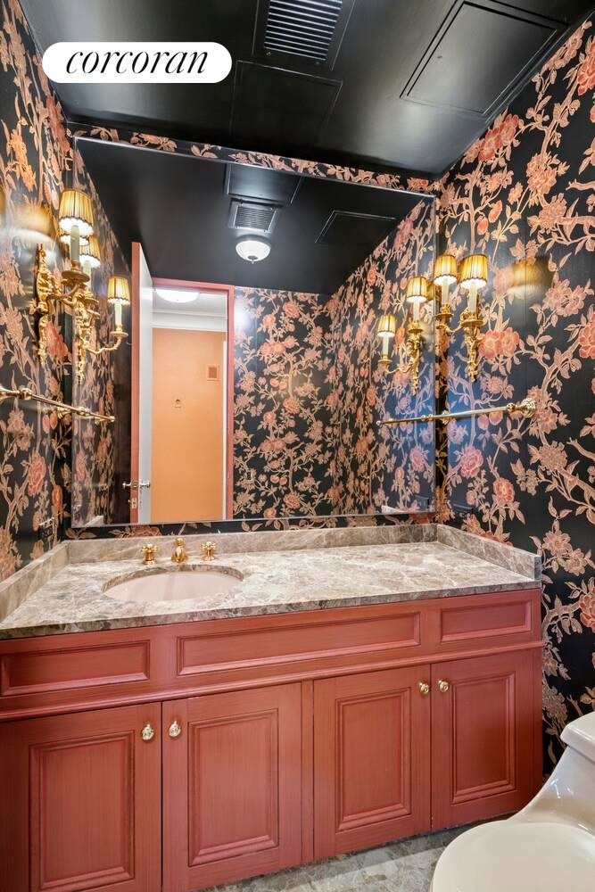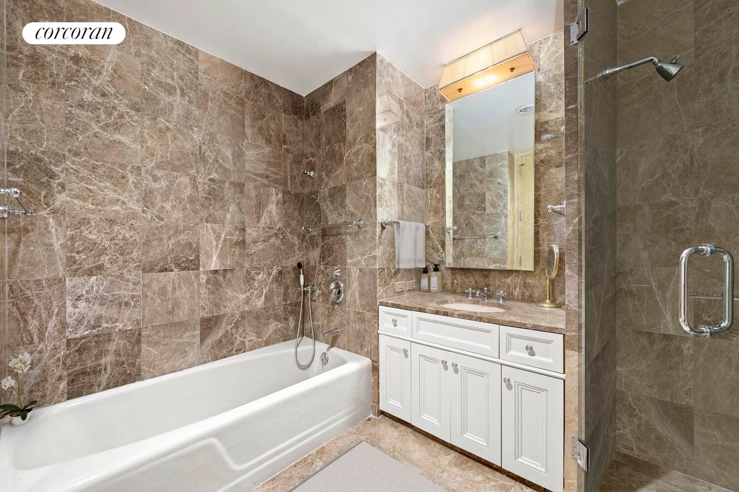 A private bedroom corridor leads to the expansive primary suite, a serene sanctuary with dramatic park and skyline views. Two walk-in closets, a dressing area with custom built-ins, and a spa-like marble bath with soaking tub, glass shower, and dual vanity complete this luxurious retreat. The secondary bedroom, equally impressive, also overlooks Central Park and offers abundant storage and a refined en-suite bath. Additional features include new central air conditioning, a powder room, and generous closet space throughout.