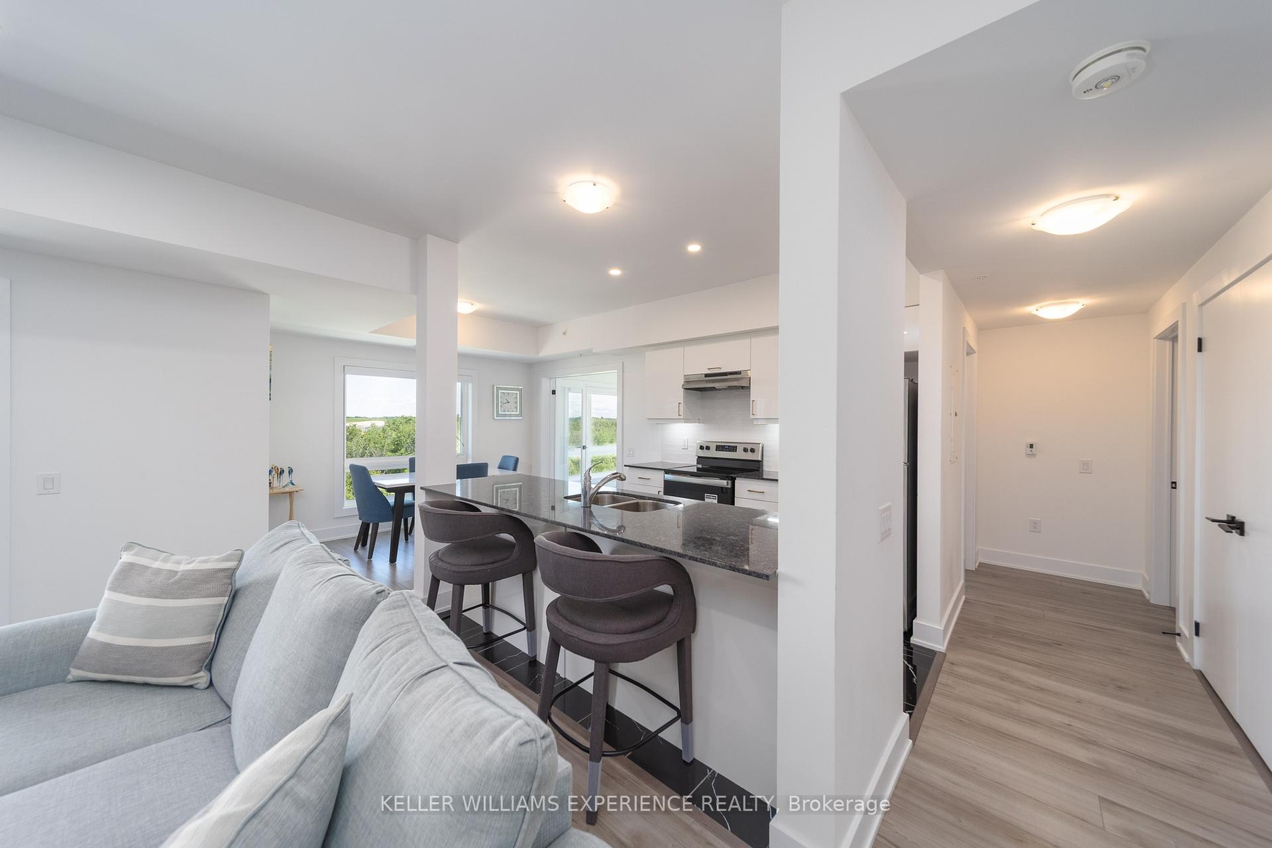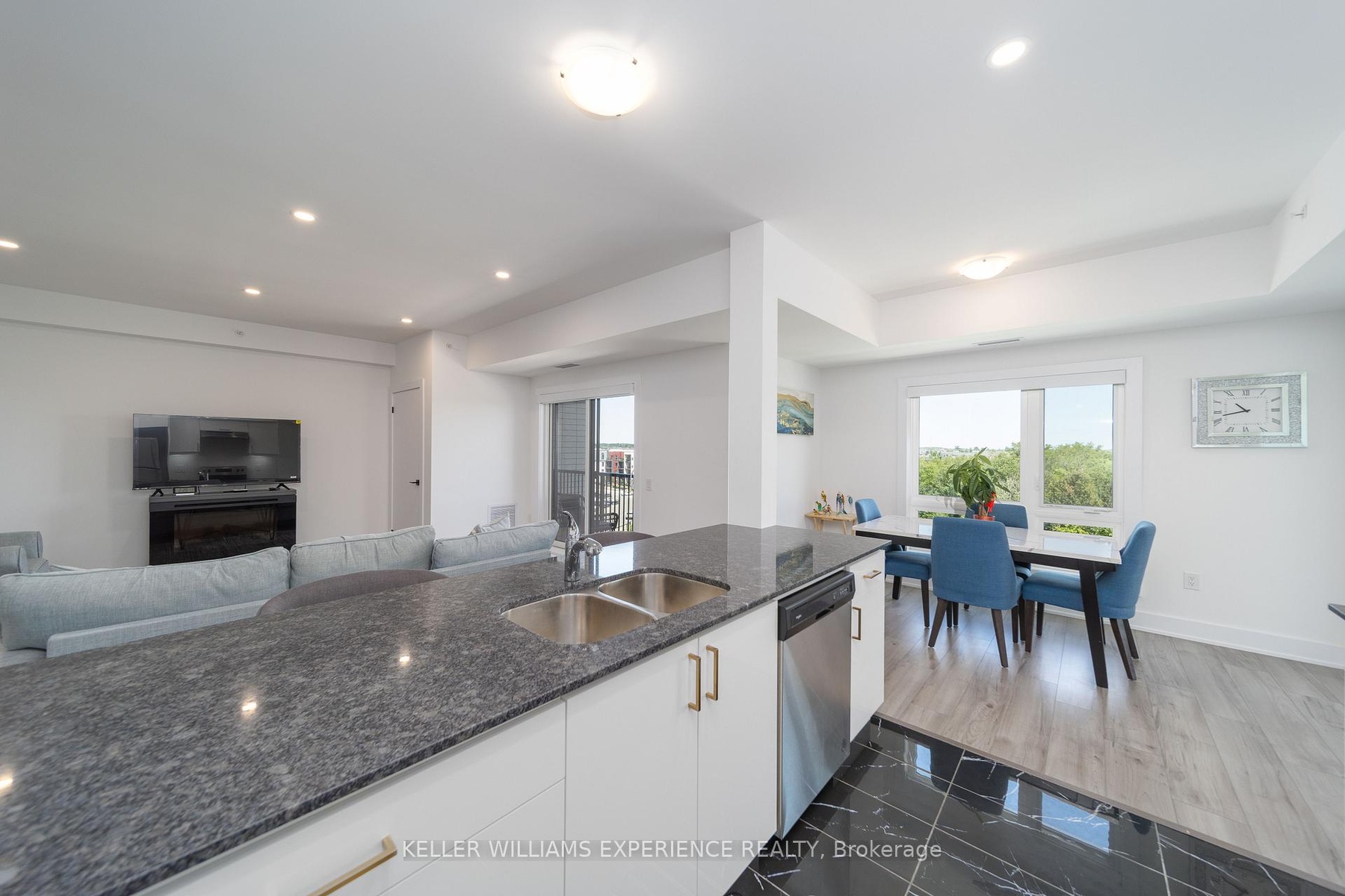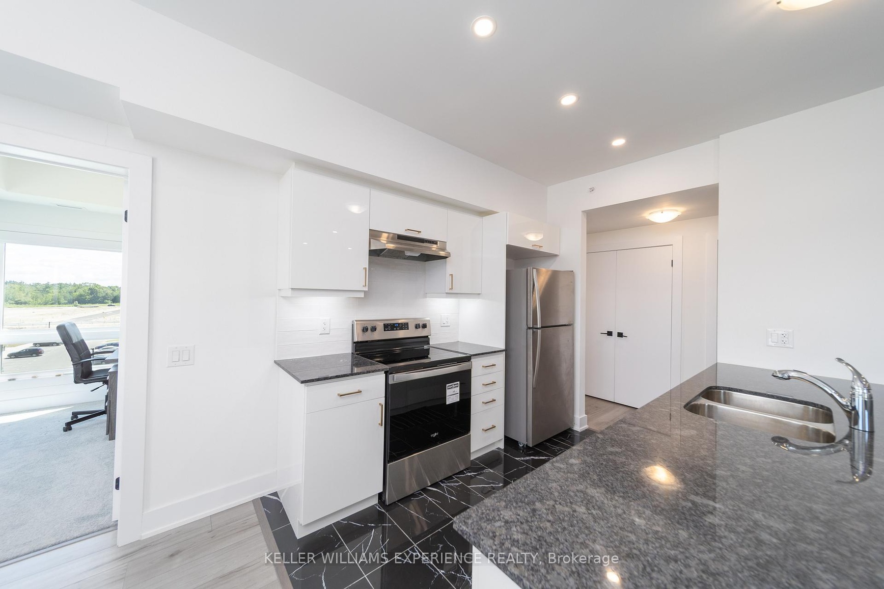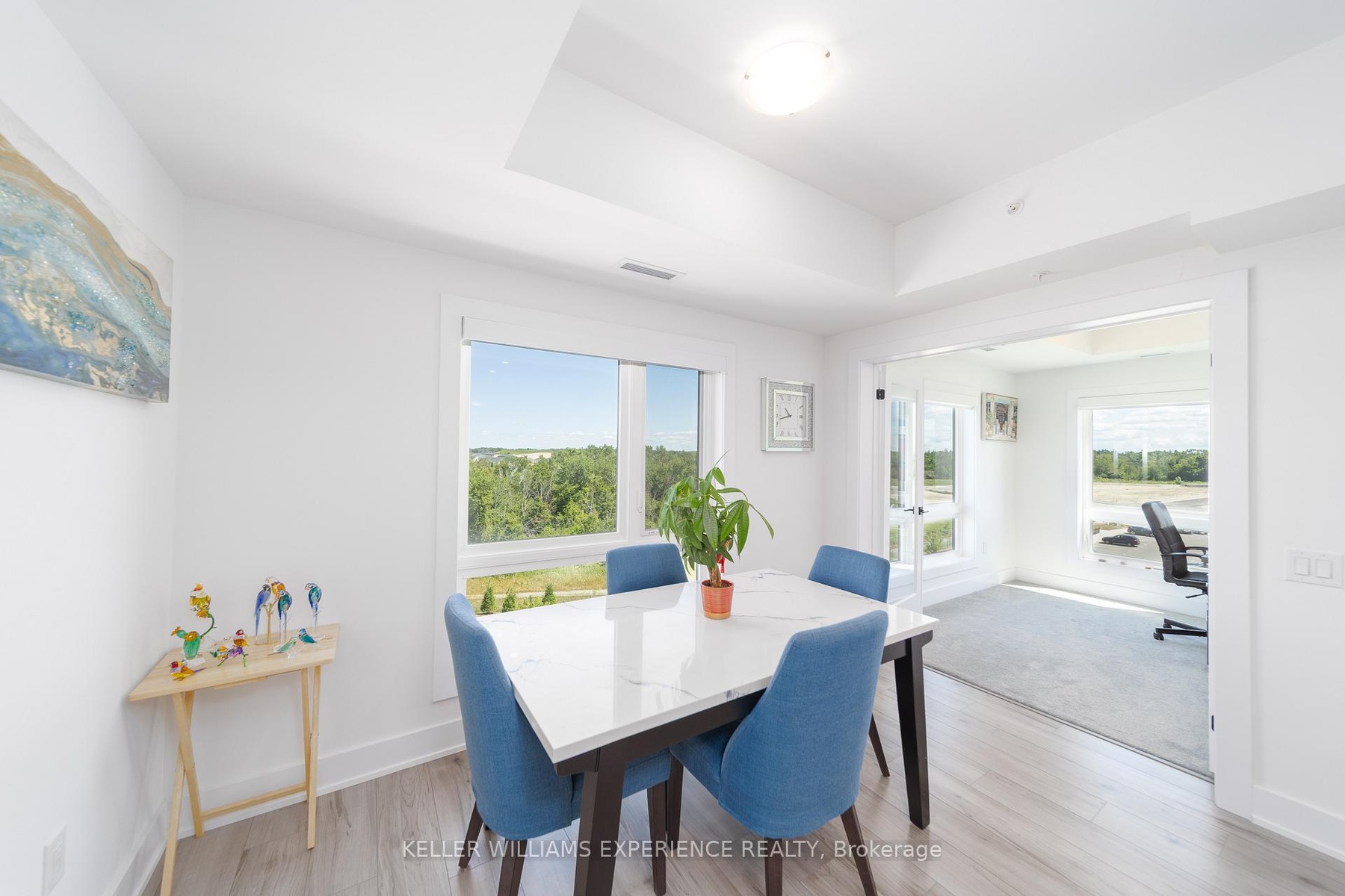 This stunning 3-bedroom, 2-bathroom corner unit offers 1,265 sq. ft. of modern living, with wraparound corner windows and a balcony facing southeast perfect for enjoying breathtaking sunrises every morning. Featuring $33,000 in upgrades, the home showcases an upgraded kitchen with stainless-steel appliances, under-cabinet lighting, pot lights, granite countertops, and a stylish tile backsplash. Porcelain tile flooring flows through the foyer, kitchen, and bathrooms, while the spacious living room opens to a balcony equipped with a gas barbeque hookup and overlooks lush green space. The primary suite boasts a walk-in closet and a private ensuite, complemented by custom blinds throughout. Accessible features, including wider door frames and hallways as well as accessible light switches, add both comfort and convenience. Ideally located just minutes from the South Barrie GO Station, restaurants, shopping, and more, this nearly new condo is still covered under Tarion Warranty