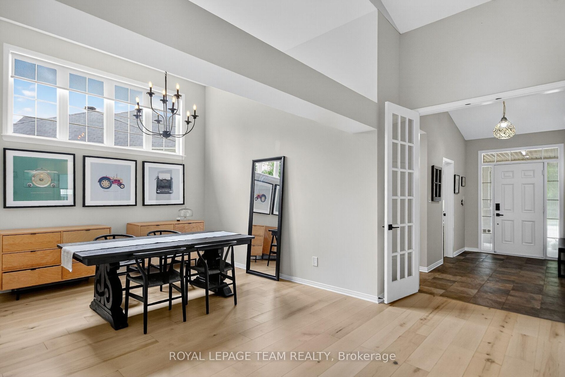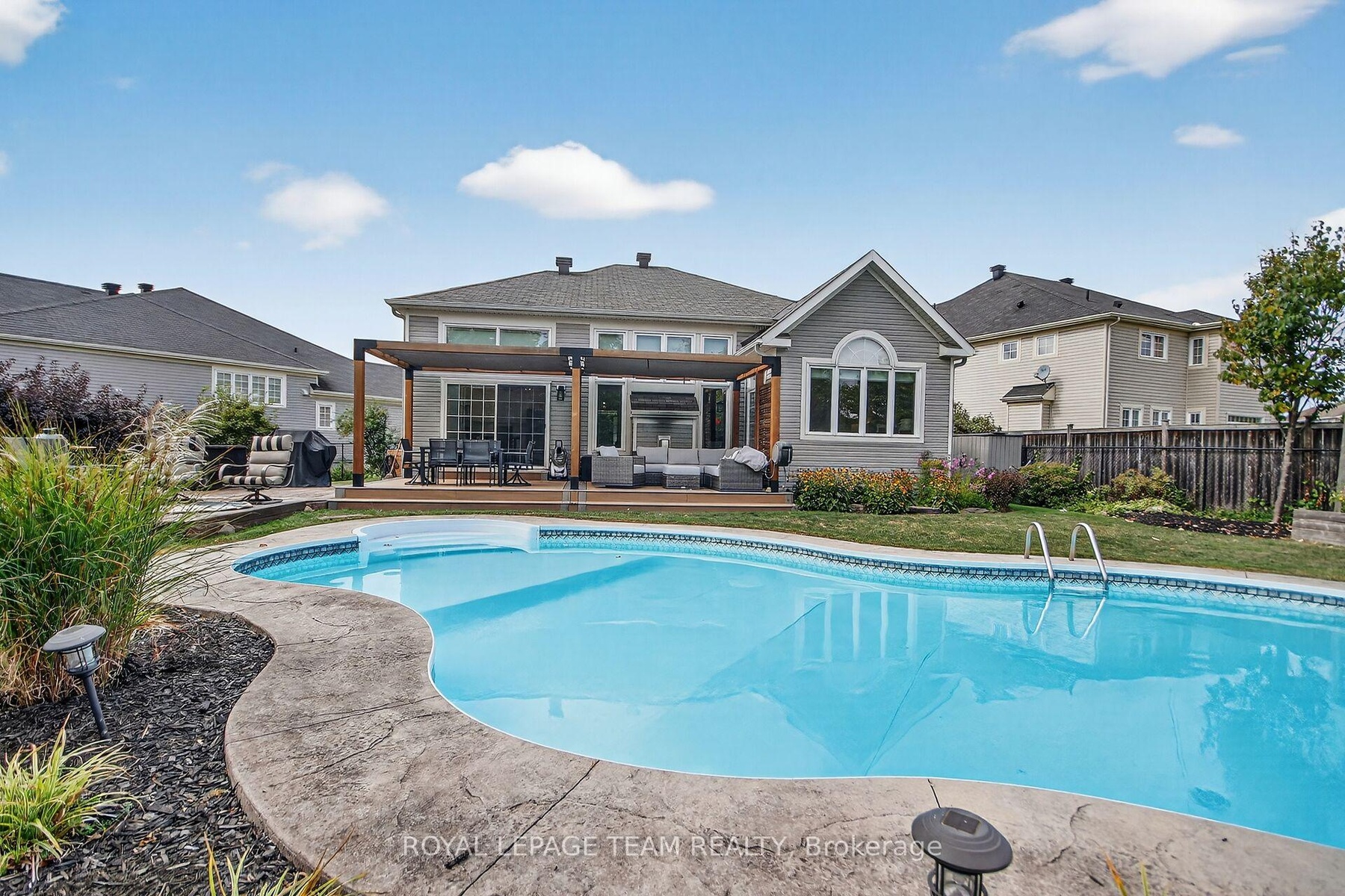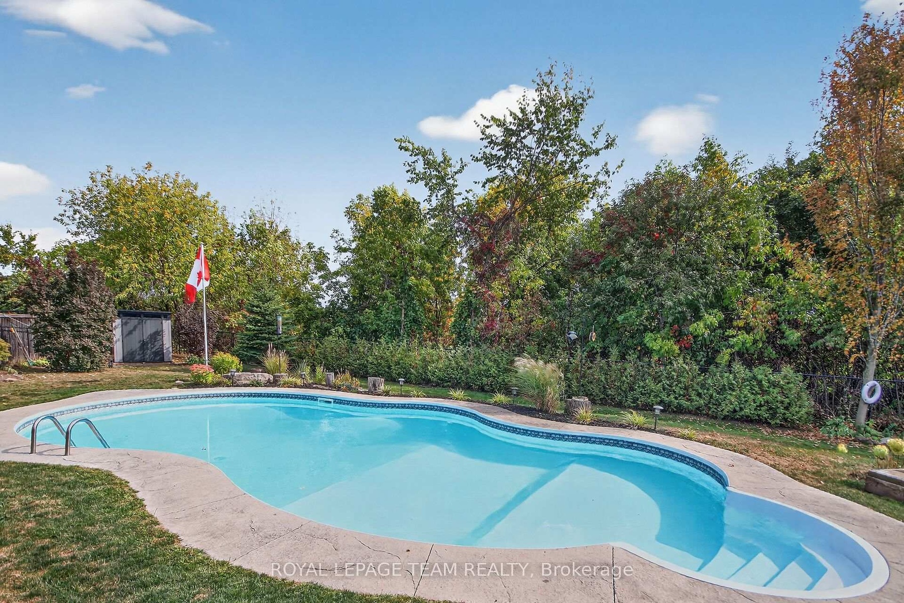 A UNICORN in Stonebridge. This property features a large pie shape lot, sits proudly on a mature & quiet street, backs onto trees not rear neighbours, a fenced, landscaped yard with an inground pool. The updated, cared for bungalow is the sought after Mahogany model ( MPAC 2034 sq ft ) built by Monarch & includes a finished lower level. The spacious open floor plan features high, vaulted or cathedral ceilings through out the main floor. A clever floor plan that offers Bed 3 to be used as an office while separating Bed 2 from the main living areas. A generous formal dining area for family celebrations/entertaining & an amazing updated kitchen featuring a 4' x 9'2" breakfast island, Quartz counters & back splash, updated Black Stainless Steel appliances contrasting beautifully to the white custom millwork. Enjoy casual meals at the island bar or eating area with patio door providing access to the rear yard decks & inground pool. The open family room space is centred around a tile faced gas fireplace, large windows & features a cathedral ceiling. The Pbed has a walk in closet, access to the pool deck via its own patio door & a beautifully updated ensuite bath. An oversized ceramic/glass shower, custom millwork, dual sink vanity & sleek lighting all recently completed in this ensuite. The lower level will not disappoint with its generous sized games area, a conforming 4th bedroom, full bath & a True Theatre Room. The seller's workshop/storage area is in the furnace room & includes repurposed millwork storage from the updated kitchen, a work bench & utility tub. Be sure to check out the many updates/upgrades done over the past couple years. Book your showing soon & be ready to start packing. Sellers can be flexible to accommodate the new owners occupancy needs.