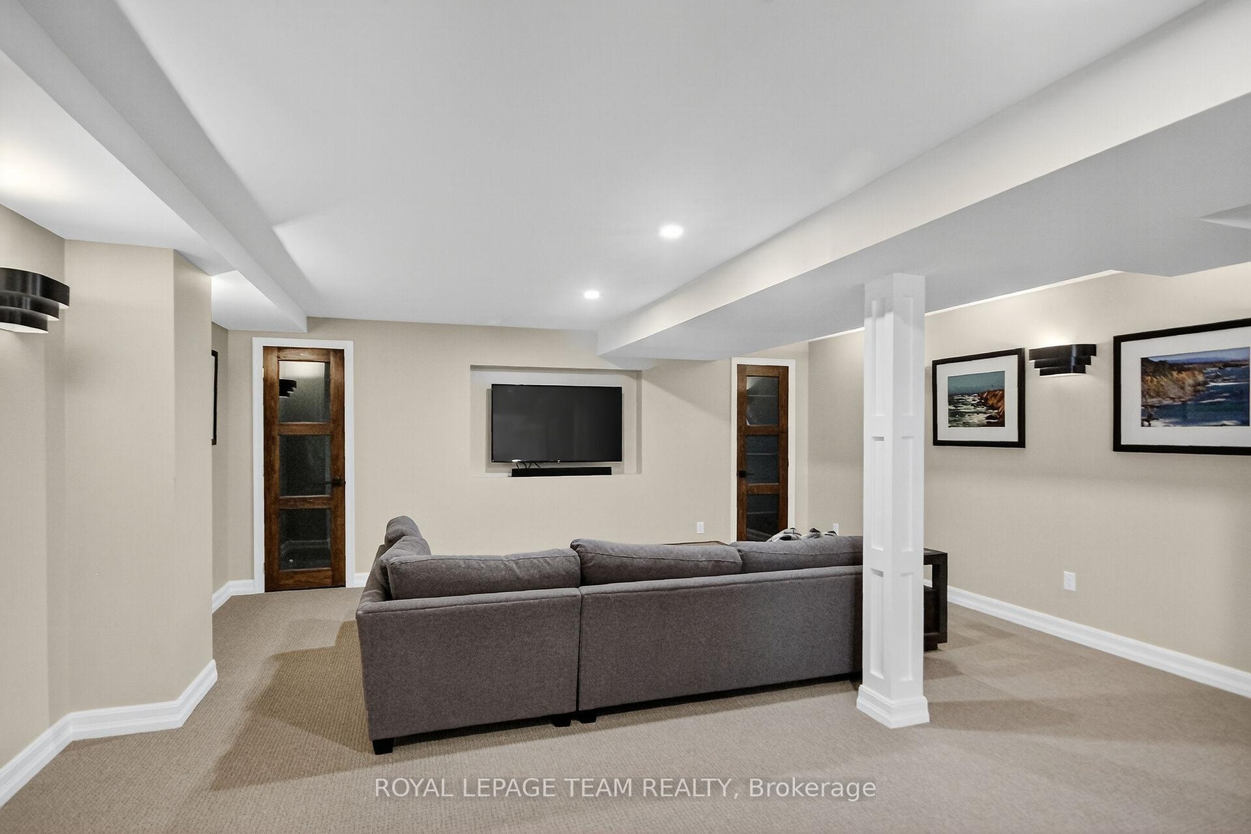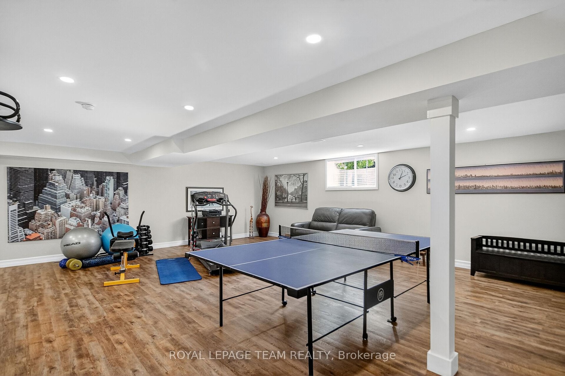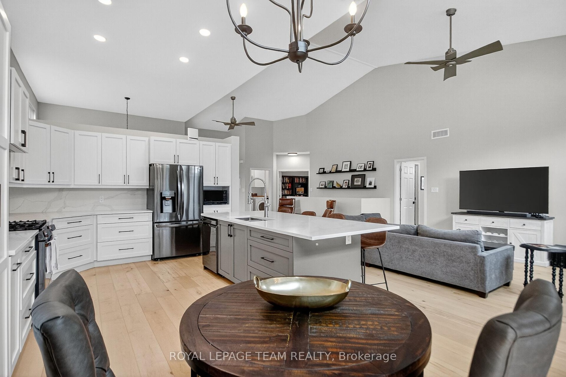 A UNICORN in Stonebridge. This property features a large pie shape lot, sits proudly on a mature & quiet street, backs onto trees not rear neighbours, a fenced, landscaped yard with an inground pool. The updated, cared for bungalow is the sought after Mahogany model ( MPAC 2034 sq ft ) built by Monarch & includes a finished lower level. The spacious open floor plan features high, vaulted or cathedral ceilings through out the main floor. A clever floor plan that offers Bed 3 to be used as an office while separating Bed 2 from the main living areas. A generous formal dining area for family celebrations/entertaining & an amazing updated kitchen featuring a 4' x 9'2" breakfast island, Quartz counters & back splash, updated Black Stainless Steel appliances contrasting beautifully to the white custom millwork. Enjoy casual meals at the island bar or eating area with patio door providing access to the rear yard decks & inground pool. The open family room space is centred around a tile faced gas fireplace, large windows & features a cathedral ceiling. The Pbed has a walk in closet, access to the pool deck via its own patio door & a beautifully updated ensuite bath. An oversized ceramic/glass shower, custom millwork, dual sink vanity & sleek lighting all recently completed in this ensuite. The lower level will not disappoint with its generous sized games area, a conforming 4th bedroom, full bath & a True Theatre Room. The seller's workshop/storage area is in the furnace room & includes repurposed millwork storage from the updated kitchen, a work bench & utility tub. Be sure to check out the many updates/upgrades done over the past couple years. Book your showing soon & be ready to start packing. Sellers can be flexible to accommodate the new owners occupancy needs.