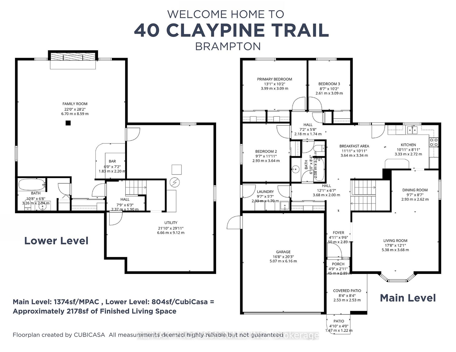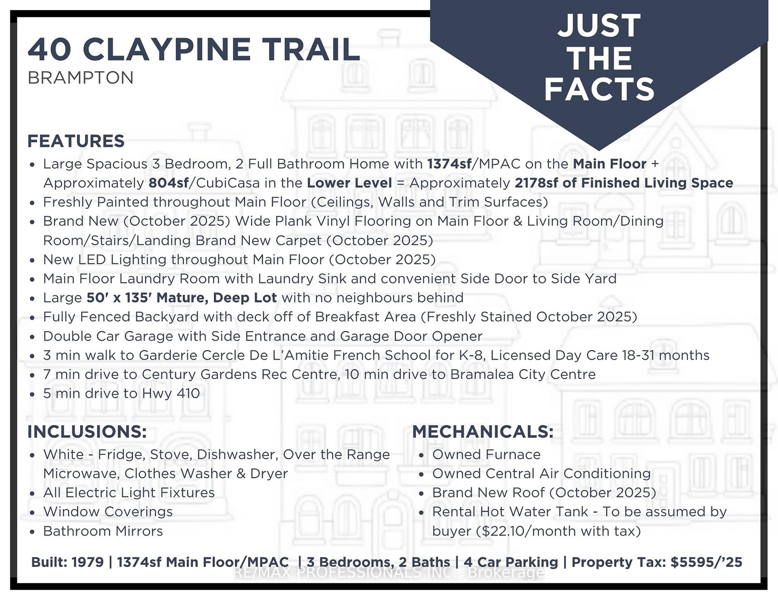 ***SEE VIRTUAL TOUR!!! Welcome to this bright and well-maintained 3-bedroom, 2 full bathroom home in the highly desired heart of Brampton North. Featuring approximately 1400sf/MPAC on the main floor and sf/CubiCasa of finished living space in the Basement. This property offers generous space inside and out on a rare 50' x 135' lot with no rear neighbours - a private, fenced backyard with deck offering a retreat perfect for relaxing or entertaining. Inside, the main floor has brand new baseboards (October '25) and freshly painted throughout the main floor (ceilings, walls, trim - October '25)) and brand new wide-plank vinyl flooring, brand new carpet (October '25) in the Living and Dining Room. Brand new LED lighting was added (October '25) throughout the main floor to enhance the bright, modern feel. The home flows well, with spacious living areas, a functional kitchen, and a partially finished basement for extra living, office, or play space. The Basement offers a 2nd full 4-piece Bathroom as well as a huge Family Room with a Built-In Bar. On the Main Floor, all three bedrooms are well-sized, and both bathrooms are full-sized for family convenience. Mechanical updates include owned Furnace, owned Central Air Conditioning, owned Furnace Mounted Whole Home Humidifier, New Roof (October '25) Double Car Garage features Garage Door Opener and side entrance door. Location highlights: 3-min walk to Garderie Cercle de l'Amitié French School (K-8) with licensed daycare (18-31 months) 5-min drive to Hwy 410 for easy commuting 7-min to Century Gardens Rec Centre (fitness, pool, programs) 10-min to Bramalea City Centre for shopping, dining & services. Recent upgrades and a large, mature lot make this home a smart choice for families, first-time buyers, or investors looking for value in a well-connected area. Move-in ready and located in a quiet, established neighbourhood with schools, parks, and transit nearby. Don't miss your chance to call 40 Claypine Trail home.