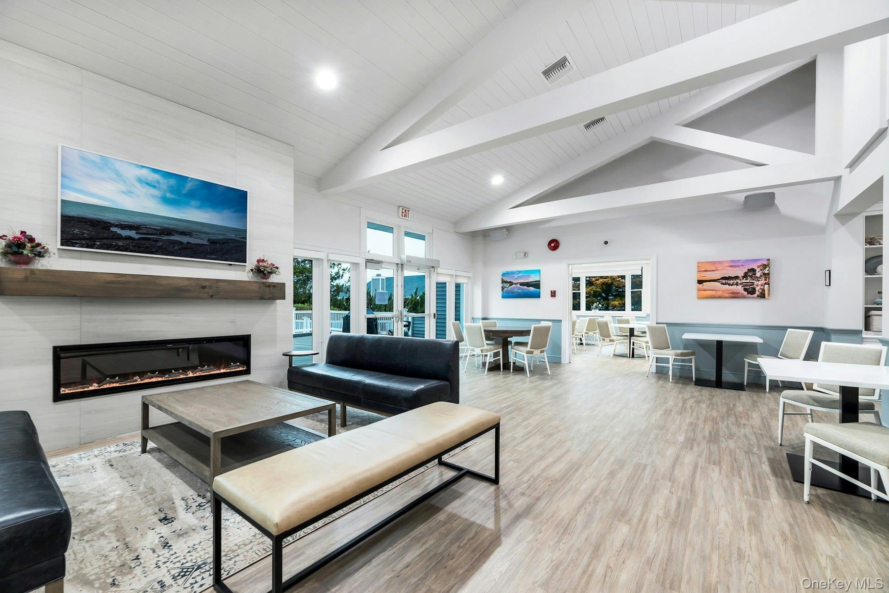 Step inside through a welcoming foyer with a large closet, thoughtfully designed to accommodate a future elevator installation. The spacious living room features a cozy fireplace and soaring vaulted ceilings, creating a light and airy ambiance that flows seamlessly into the dining area and kitchen with beautiful, direct water views from the living room/ dining room area as well as the master bedroom. In addition, there is a spacious balcony (with room for a dining table and lounge chairs) with direct water views which can be accessed directly from the living/dining area as well as the master bedroom.