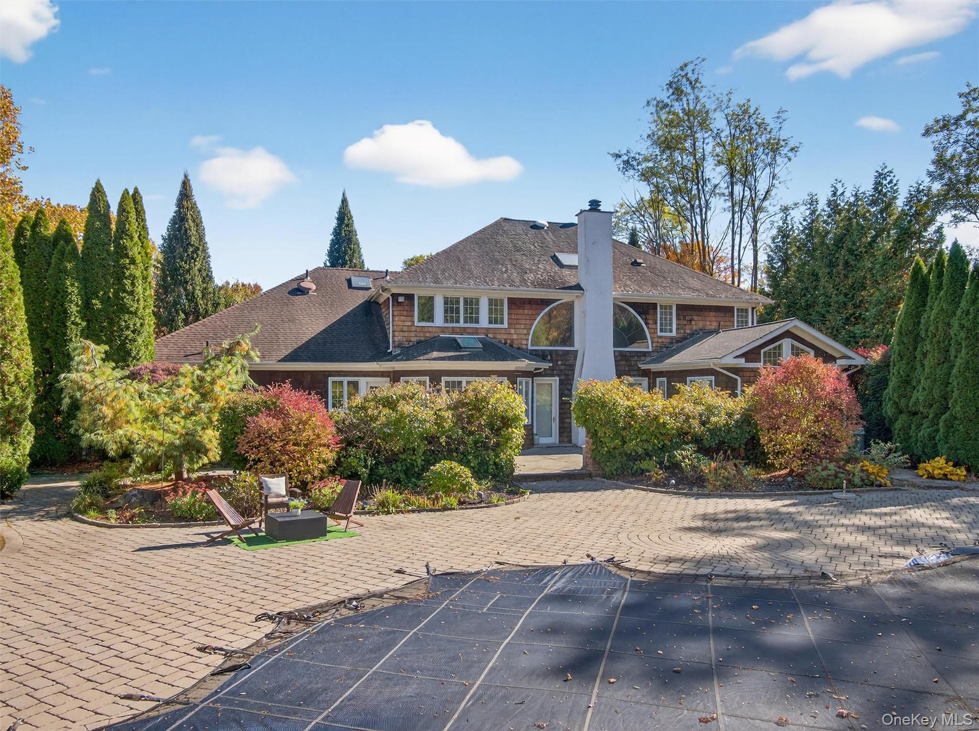 Experience timeless elegance in this custom-built Nantucket shingle-style colonial, privately set on a cul-de-sac in prestigious Village of Wesley Hills. Enveloped by nature on 1.15 acres of wooded grounds, this residence offers exceptional privacy and tranquility while providing over 6,000 sq. ft. of refined living space across three levels, seamlessly blending architectural beauty with modern comfort. The first floor showcases a grand two-story foyer with a sweeping curved staircase and paneled wainscoting. A dramatic living room with a floor-to-ceiling stone fireplace framed by arched windows opens to a chef’s kitchen featuring custom cabinetry, stainless steel appliances, and a large center island that flows into a breakfast nook and formal dining room. The main-level primary suite offers dual walk-in closets and a spa-inspired bath. A private office, powder room, pantry, and three-car garage complete this level. Upstairs boasts four spacious bedrooms, two full baths, and a sitting area with open views below. The 2,000 sq. ft. finished lower level includes a recreation room, wet bar, full bath, and ample storage. Beyond the interior, the home’s natural surroundings enhance its resort-style outdoor living—featuring a pool with waterfalls, a cabana with an outdoor fireplace, and a stone patio embraced by mature trees and manicured landscaping. A perfect balance of Hamptons-inspired elegance, Hudson Valley tranquility, and ultimate privacy.