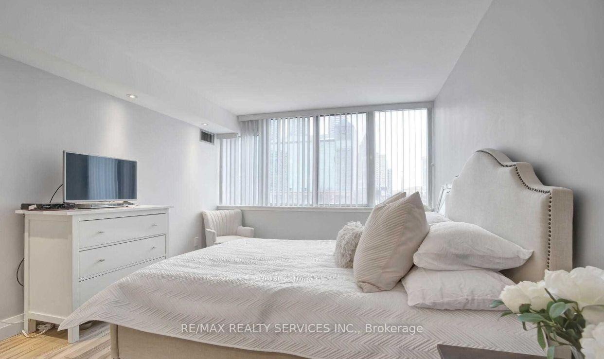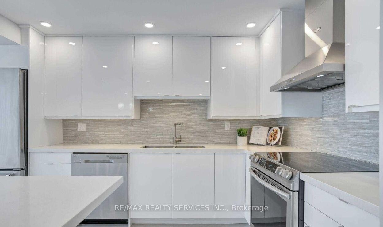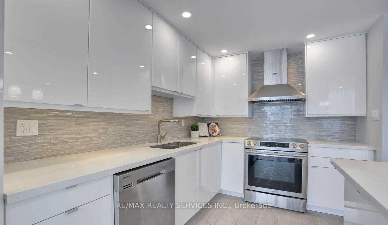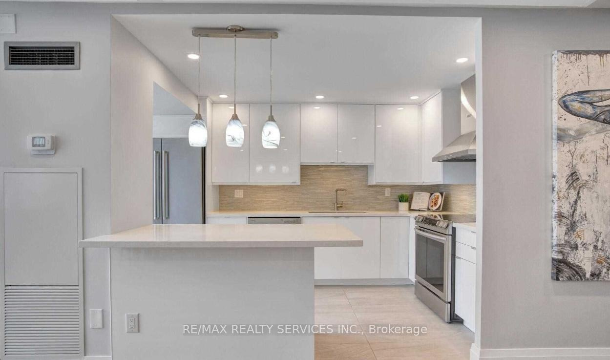 One of the Largest Units in the Building! Move-in ready & completely carpet-free, offering over 1,200 sq. ft. of luxurious living space. Features 2 spacious bedrooms, 2 full bathrooms & 2 parking spots. A bright, open-concept layout with large picture windows and professionally renovated interior. A modern kitchen with quartz countertops, backsplash, island, stainless steel appliances, pot lights & laminate flooring throughout. Walking distance to Square One, YMCA, Central Library, Celebration Square & public transit. A must-see condo - stylish, bright & move-in ready!