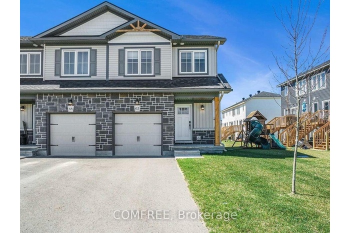 Upgraded end-unit townhome in the Bellamy Farms community. This 3-bedroom, 3-bath home with finished basement offers modern finishes and bright living space across three levels. The main floor features an open-concept living and dining area with large windows providing ample natural light. The kitchen includes stainless steel appliances, a custom stone-tiled backsplash, a center island with built-in outlets, and a pull-down faucet. Upstairs offers a spacious primary suite with walk-in closet and ensuite, plus two additional bedrooms and a laundry room with custom cabinetry and marble folding surface. The finished basement with large windows adds flexible living space and includes a separate storage room. Window coverings, mirrors in all baths, and privacy film on the front door are included. Furnace is owned. Walking distance to shops, trails, eateries, schools, and transit, and just minutes to parks, downtown Smiths Falls, and the Rideau Canal.