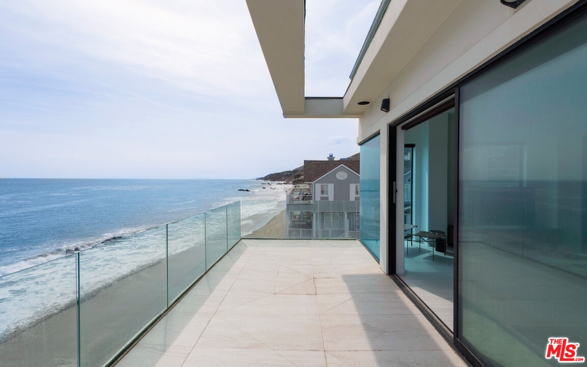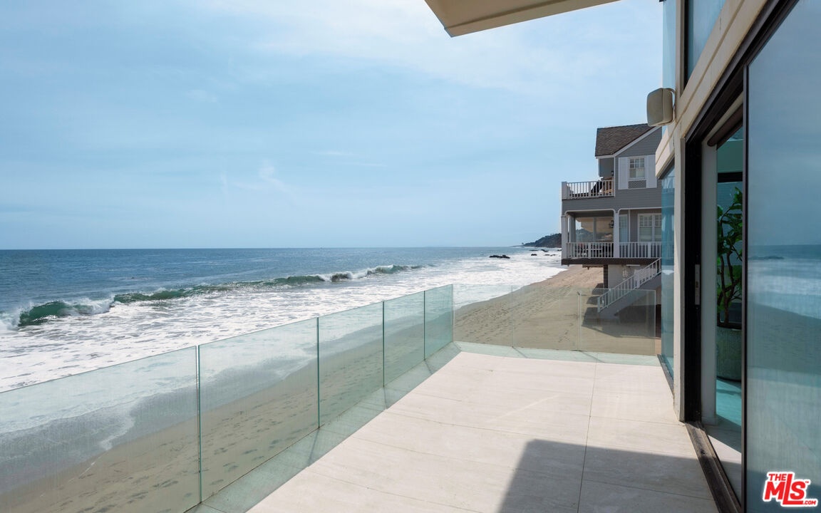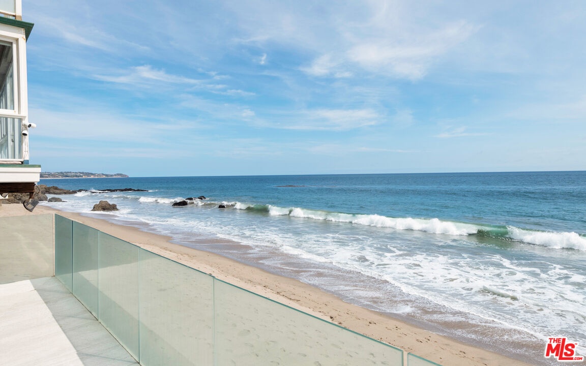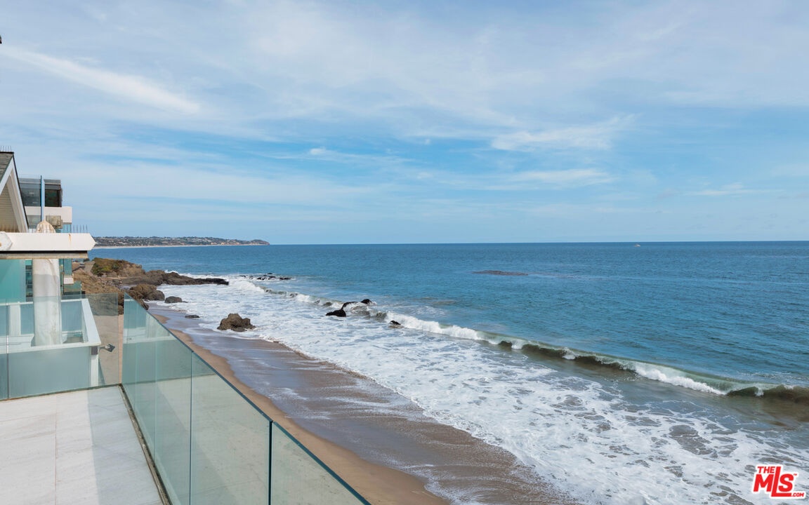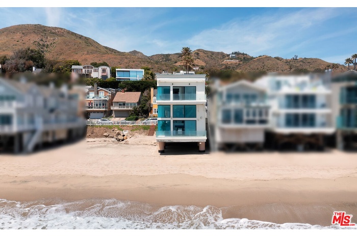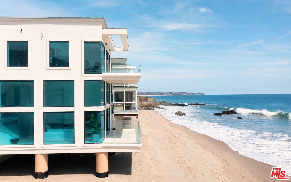 A sleek contemporary with walls of glass and majestic ocean, shoreline, and island views, this sensational home is designed for heavenly relaxation and sophisticated entertaining. Built on three levels for maximum enjoyment of the sunrise-to-sunset panorama, the home's wraparound windows, exceptionally high ceilings, and gorgeous furnishings provide a tranquil setting on the sandy shore of Sea Level beach. The entry, with a huge pivoting glass door, opens onto a mezzanine with a small seating area. Steps lead down to the lower level, where the enormous living room has floor-to-ceiling windows on two sides, a tiled bar, handsome built-ins, and wide glass doors that slide open onto a lighted beachfront balcony with ample room for dining, entertaining, and sea- and star-gazing. Also on this level is a powder room, laundry, and a bedroom. From the foyer, steps lead up to the middle floor, which is home to a beautiful chandelier dining area, chef's kitchen, and the primary suite. The kitchen is equipped with top-quality appliances, an island with bar seating, sleek built-ins, and a walk-in pantry with a beverage cooler. The primary suite is a spacious and private retreat that commands spectacular views and opens onto a large oceanfront deck. The suite has a built-in beverage cooler, walk-in closet, and a lovely spa-style bath. A skylight stairway leads to the top floor, home to a television/reading lounge and three bedrooms, one with a private balcony. The home is also equipped with smart-home features, multizone air conditioning, built-in speakers, a two-car garage, and a stairway to the beach below. This is a stunning new oceanfront residence and the perfect setting for comfortable living and generous entertaining.