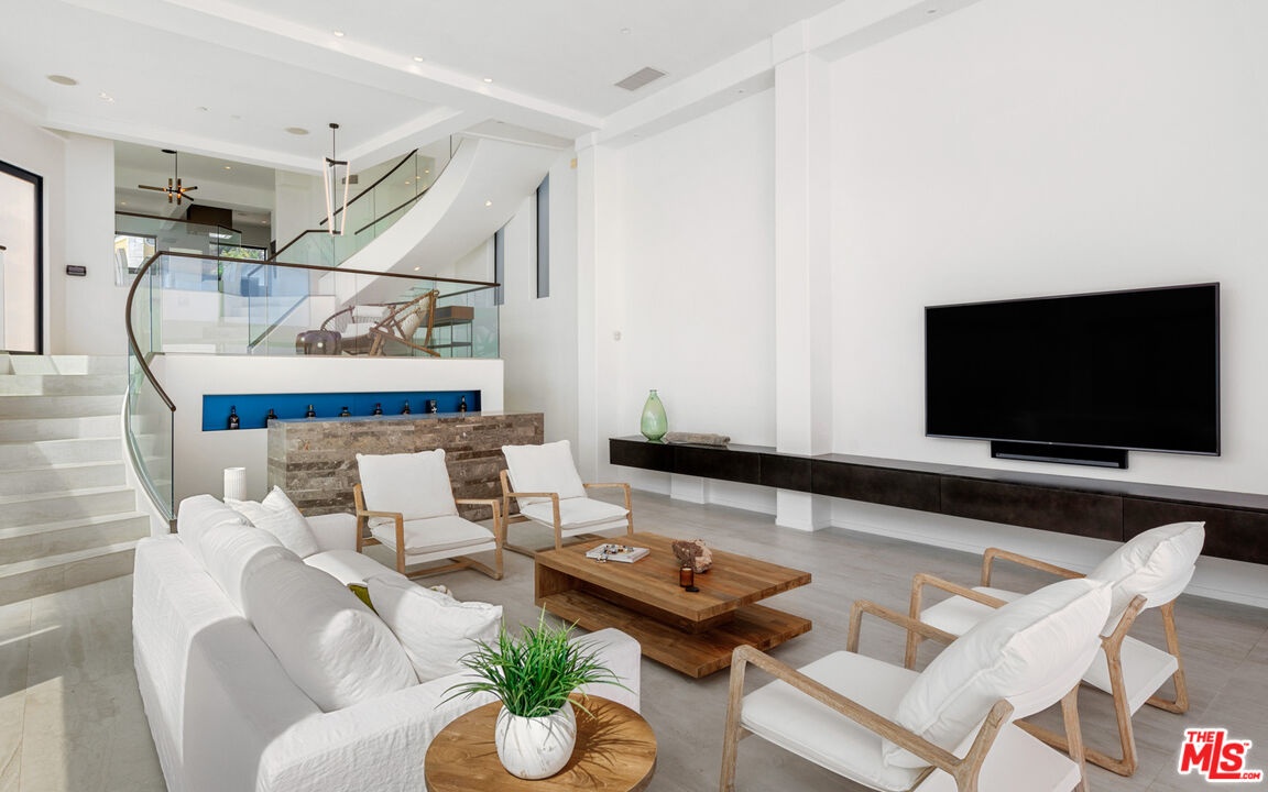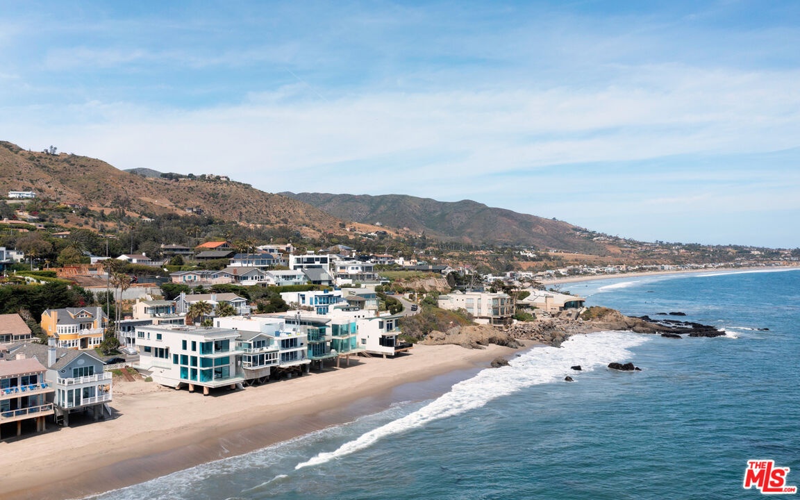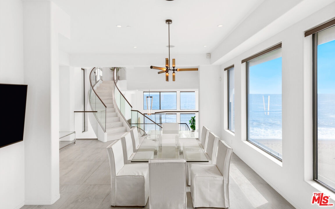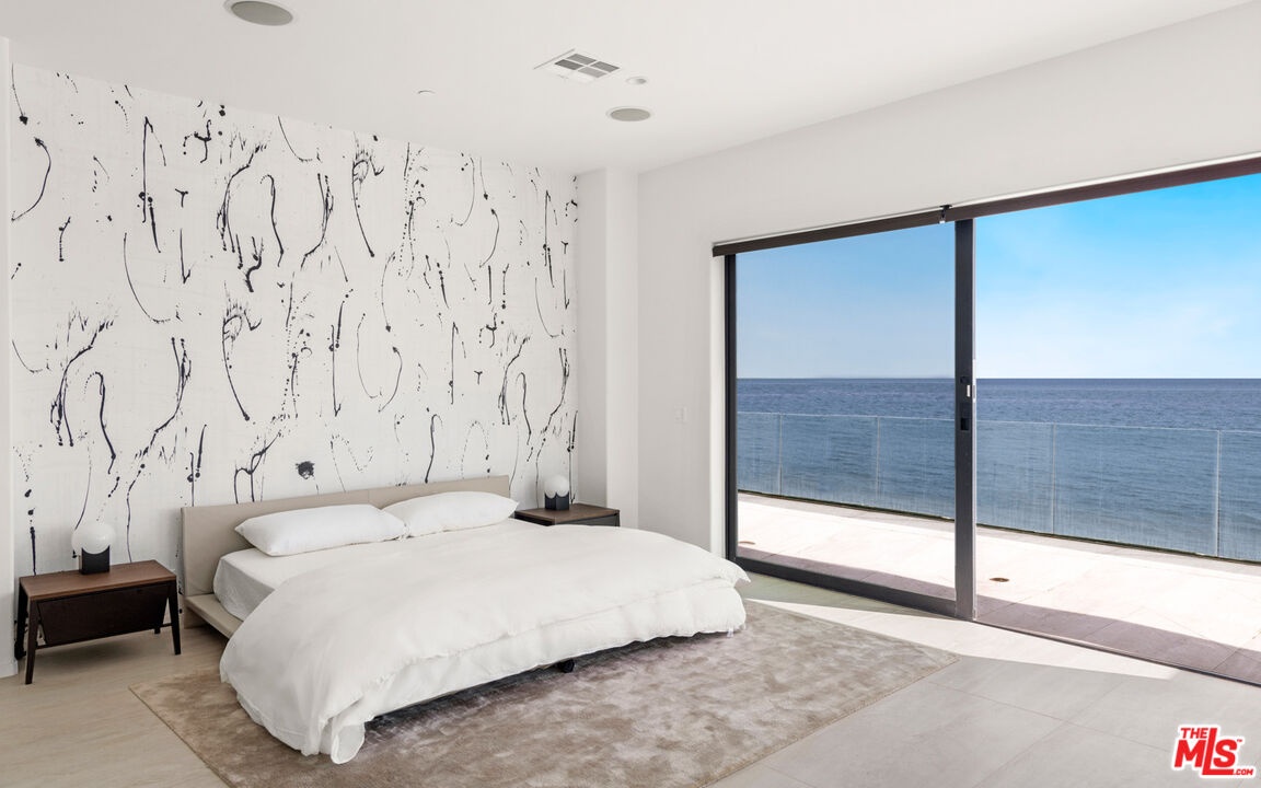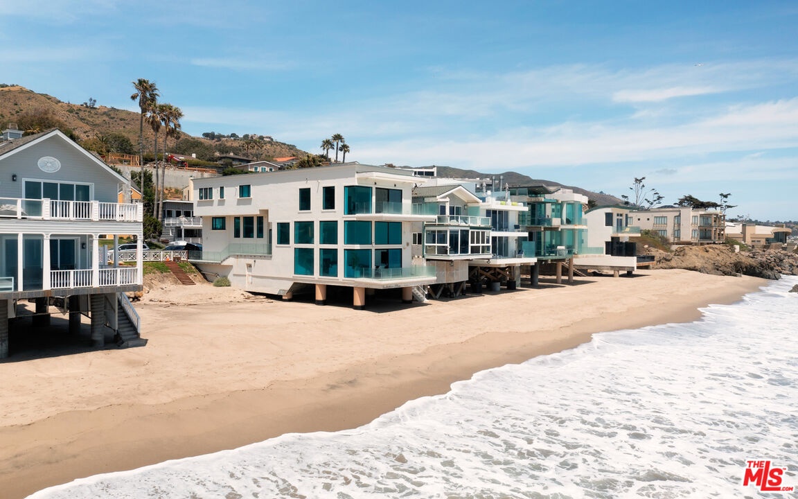 A sleek contemporary with walls of glass and majestic ocean, shoreline, and island views, this sensational home is designed for heavenly relaxation and sophisticated entertaining. Built on three levels for maximum enjoyment of the sunrise-to-sunset panorama, the home's wraparound windows, exceptionally high ceilings, and gorgeous furnishings provide a tranquil setting on the sandy shore of Sea Level beach. The entry, with a huge pivoting glass door, opens onto a mezzanine with a small seating area. Steps lead down to the lower level, where the enormous living room has floor-to-ceiling windows on two sides, a tiled bar, handsome built-ins, and wide glass doors that slide open onto a lighted beachfront balcony with ample room for dining, entertaining, and sea- and star-gazing. Also on this level is a powder room, laundry, and a bedroom. From the foyer, steps lead up to the middle floor, which is home to a beautiful chandelier dining area, chef's kitchen, and the primary suite. The kitchen is equipped with top-quality appliances, an island with bar seating, sleek built-ins, and a walk-in pantry with a beverage cooler. The primary suite is a spacious and private retreat that commands spectacular views and opens onto a large oceanfront deck. The suite has a built-in beverage cooler, walk-in closet, and a lovely spa-style bath. A skylight stairway leads to the top floor, home to a television/reading lounge and three bedrooms, one with a private balcony. The home is also equipped with smart-home features, multizone air conditioning, built-in speakers, a two-car garage, and a stairway to the beach below. This is a stunning new oceanfront residence and the perfect setting for comfortable living and generous entertaining.