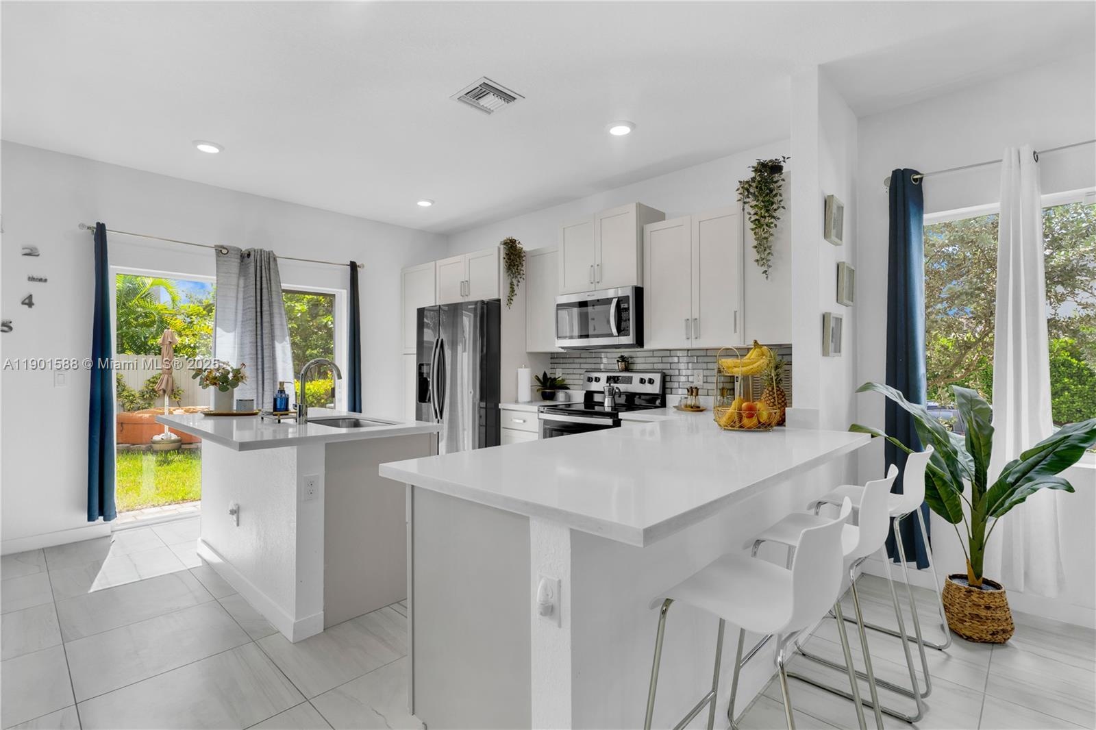 Built in 2021, this modern 3-bedroom, 2-bath home offers open-concept living and a private tropical oasis in your own backyard. Featuring a bright kitchen with quartz countertops, stainless steel appliances, and an oversized island, this home is perfect for entertaining. Natural light fills the living areas, creating a warm and inviting atmosphere. The fully fenced yard is professionally landscaped with mature palms, a covered gazebo, and space to relax or host gatherings. Located in a sought-after community near top-rated schools, shopping, dining, and major highways, this move-in ready home delivers comfort, style, and the Florida lifestyle you’ve been waiting for.