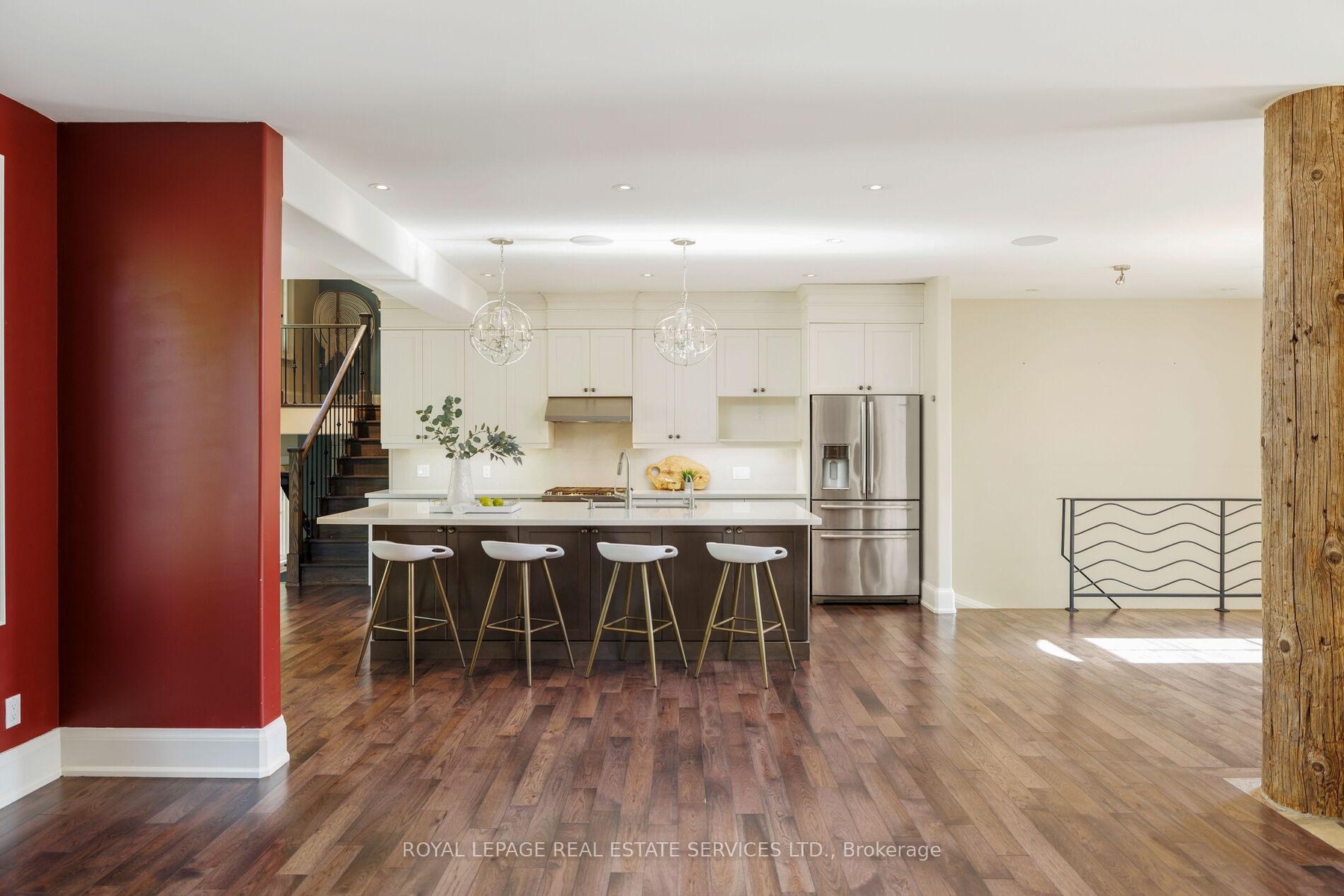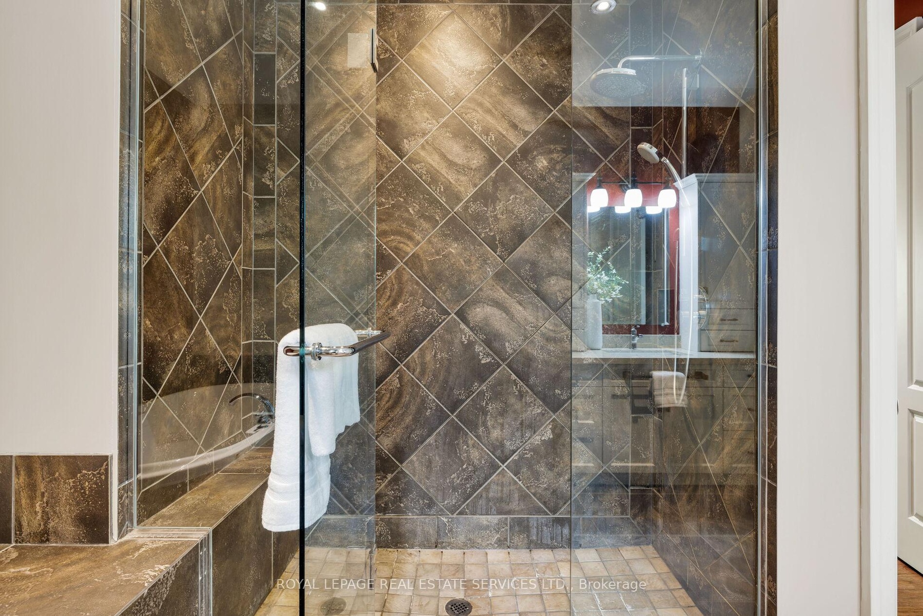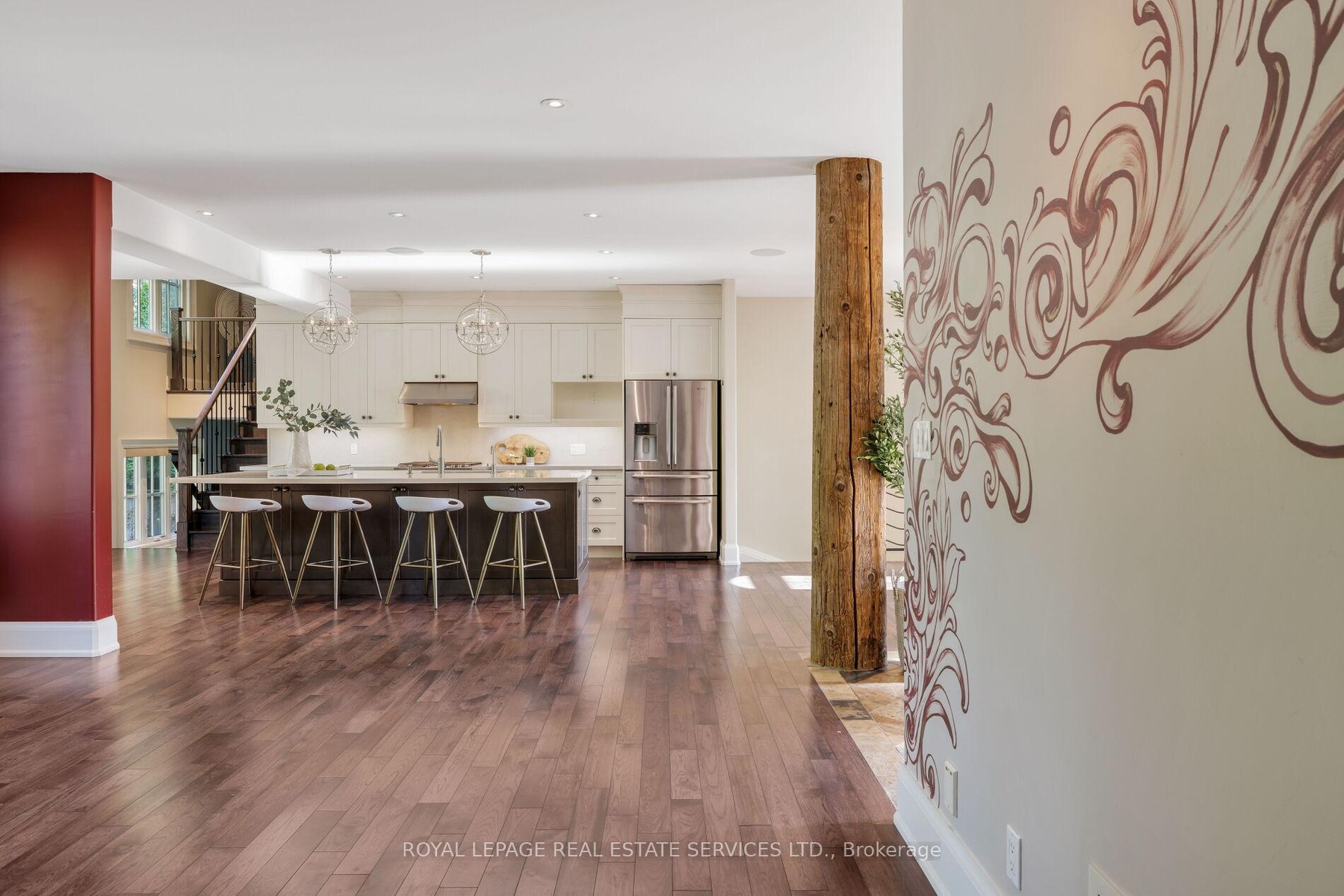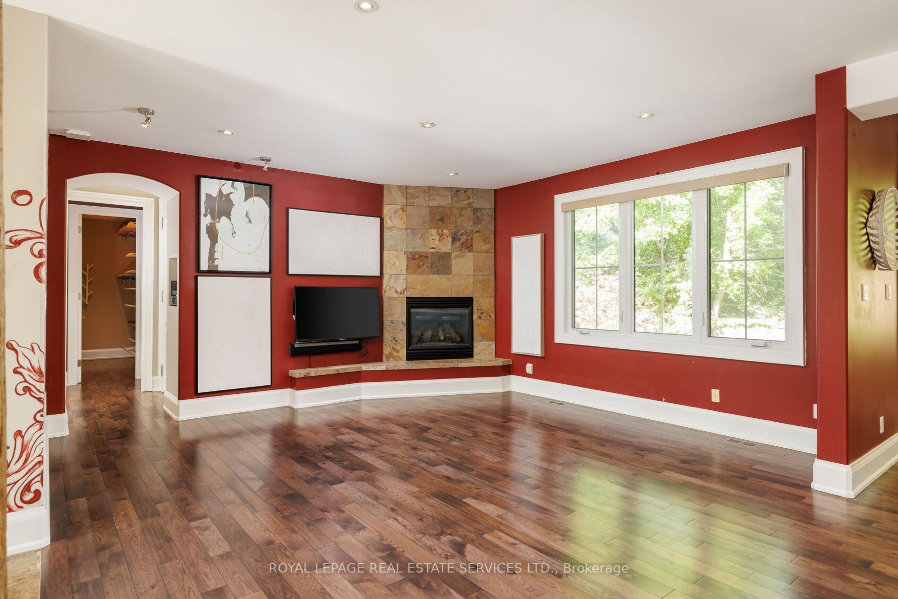 A remarkable lifestyle awaits in Oakvilles highly sought-after West Oakville community, where every convenience is just steps away. This exquisite custom raised bungaloft, redesigned in 2016 by Keeren Designs, backs directly onto the scenic Donovan Bailey Trail & is only a 3-minute walk to the Queen Elizabeth Park Community & Cultural Centre. Enjoy nearby Bronte Harbour, Lake Ontario, waterfront parks, & Bronte Villages shops & restaurants, all just minutes away, with quick commuter access to Bronte GO Station & the QEW/403. Showcasing undeniable curb appeal, this luxury home features a stucco facade with accent shutters, stone steps leading to a covered entry with columns & iron railings, interlocking stone walkways, professional landscaping with mature trees, a 9-zone irrigation system, & exterior cameras. The private backyard retreat offers upper & lower stone patios, gardens with armour stone accents, evergreens, & direct trail access. Inside, the residence boasts 2+3 bedrooms, 2.5 bathrooms, & a versatile loft perfect as a bedroom, home office, or studio. The 2016 transformation added a gourmet kitchen, wide-plank hardwood, designer tiles, custom built-ins, deep trim, built-in speakers, & expandable Control4 smart home automation. Designed for comfort & entertaining, the open-concept main floor offers 9 ceilings, family room with gas fireplace, spacious dining room, & chefs kitchen with custom cabinetry, quartz counters, oversized island with seating for 6, high-end appliances, & a breakfast area with walkout to the backyard. The primary suite showcases 2 walk-in closets & a spa-inspired 4-piece ensuite with soaker tub & oversized glass shower. The finished lower level includes a large recreation room, 3 bright bedrooms, 3-piece bath with heated floor & glass shower, oversized laundry, & abundant storage. Upgrades include furnace, HRV, roof shingles (2016), & recently, some main floor windows updated, & addition of a custom 8 solid wood front entry door.