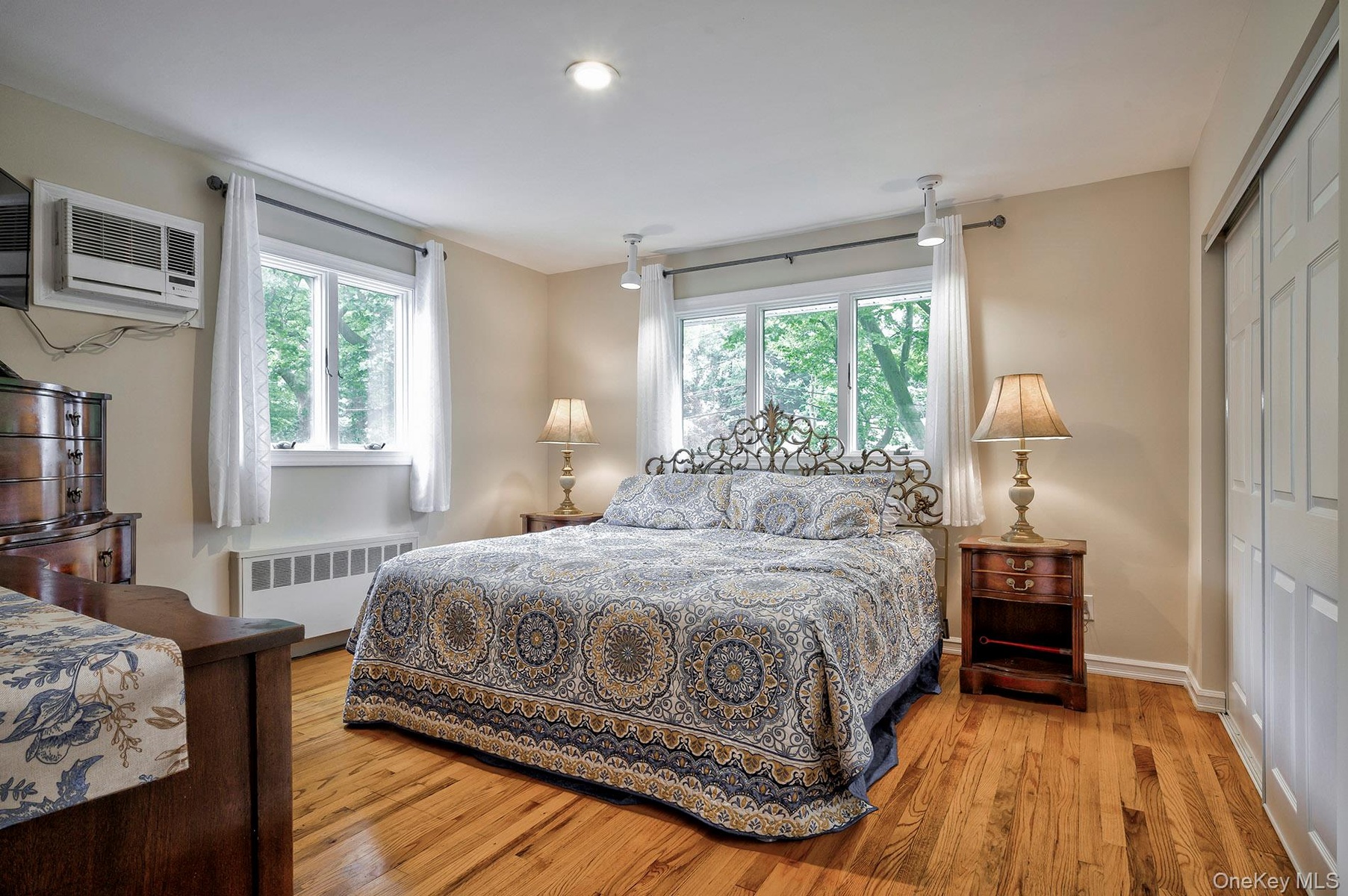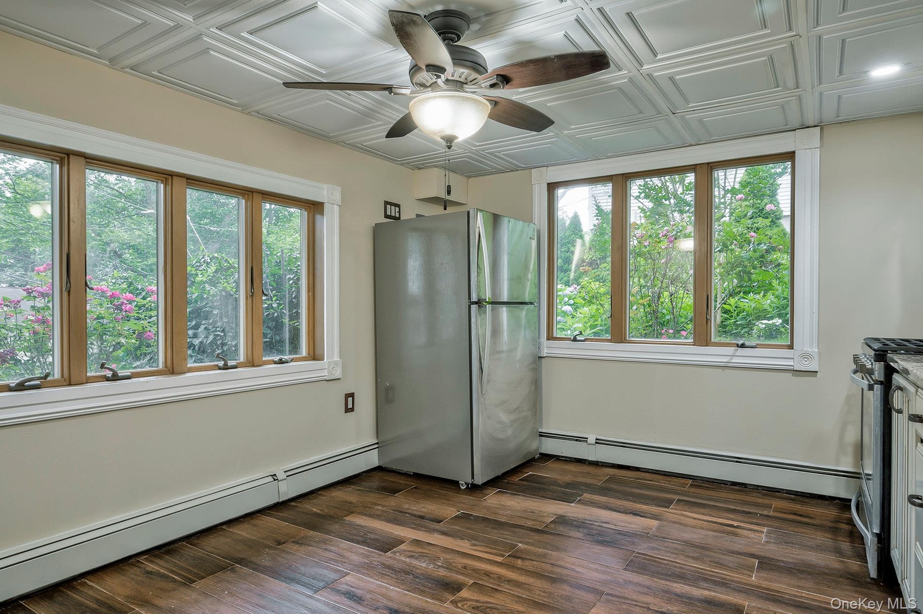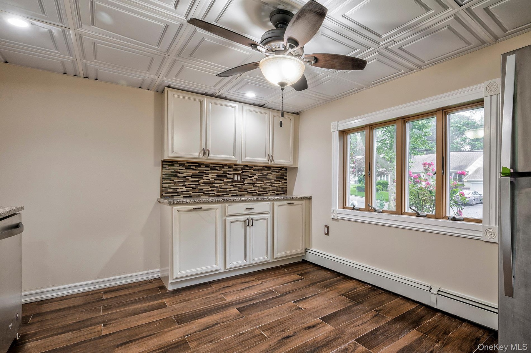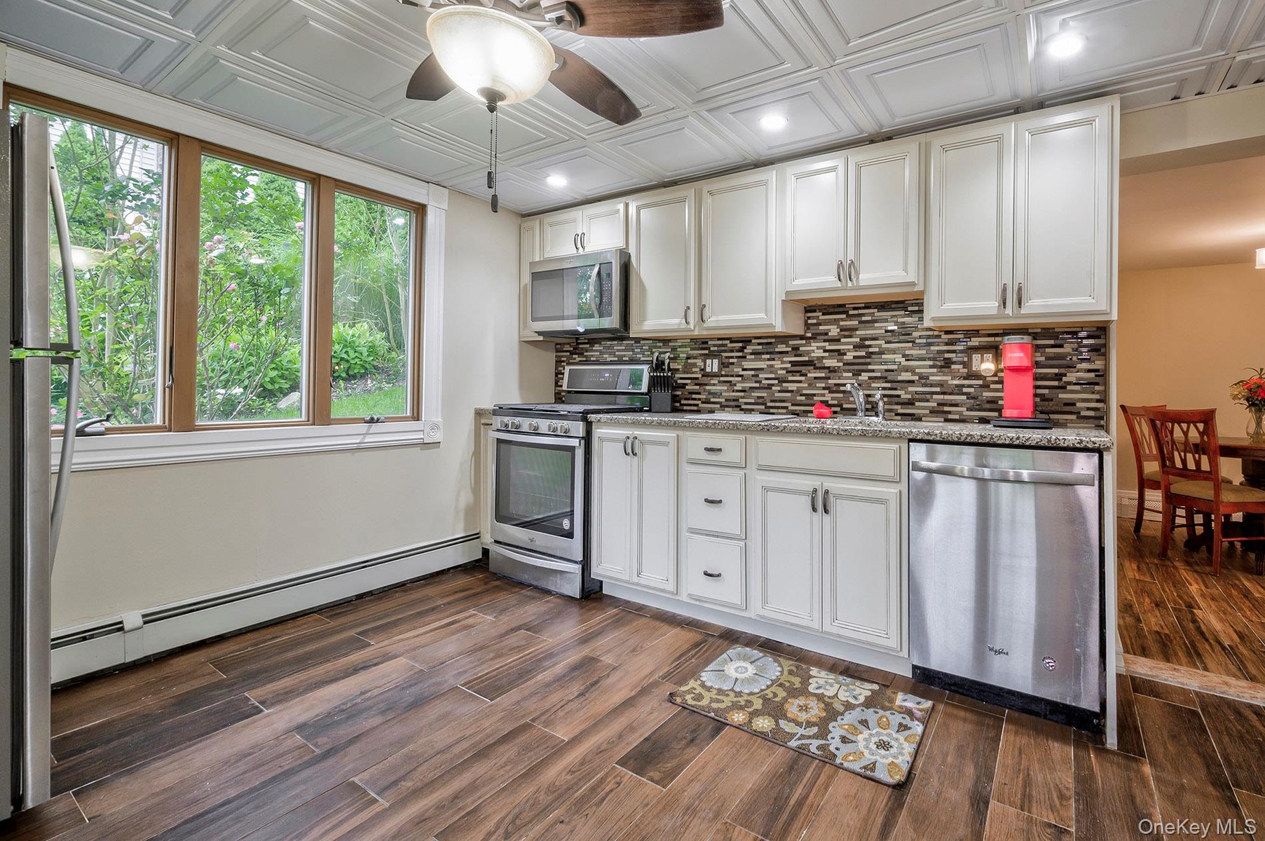 Upstairs there are 3 bedrooms and a third full bath. Hardwood floors throughout. The primary bedroom is large, and has an in-wall ac unit. The living room and dining room spans from front to back of the home. Open and airy with a lofted ceiling, and an in-wall ac unit. The kitchen has stainless steel appliances, gas fuel cooking. And a window out to the lovely back yard from the kitchen sink – love it!