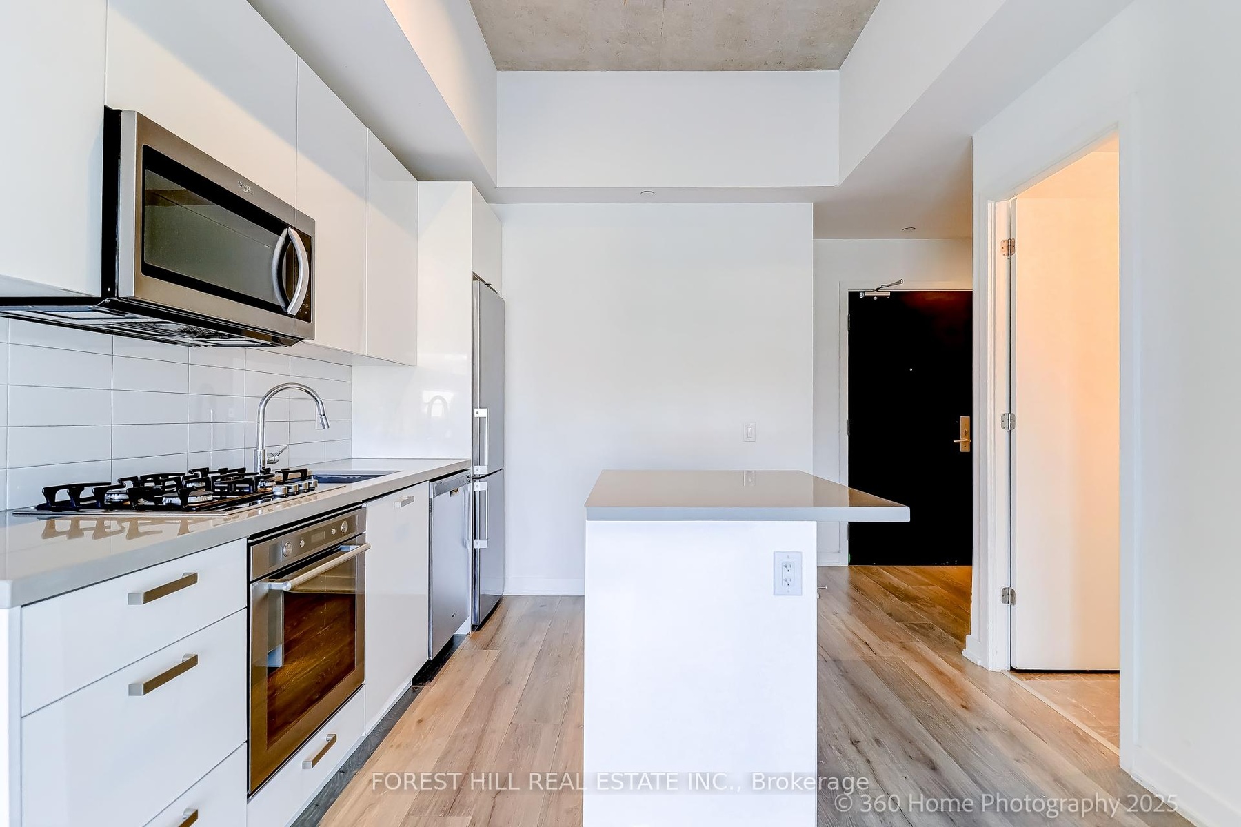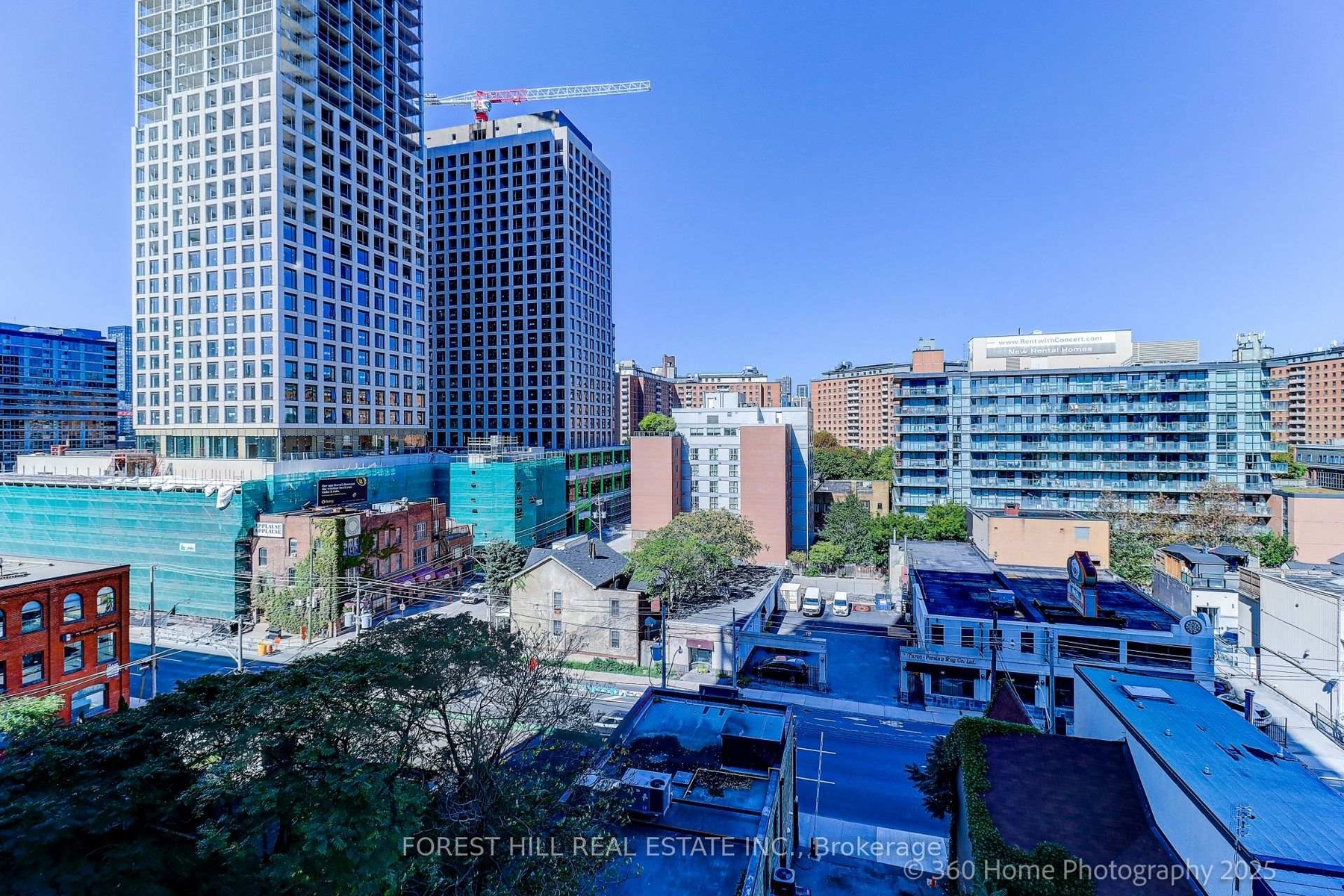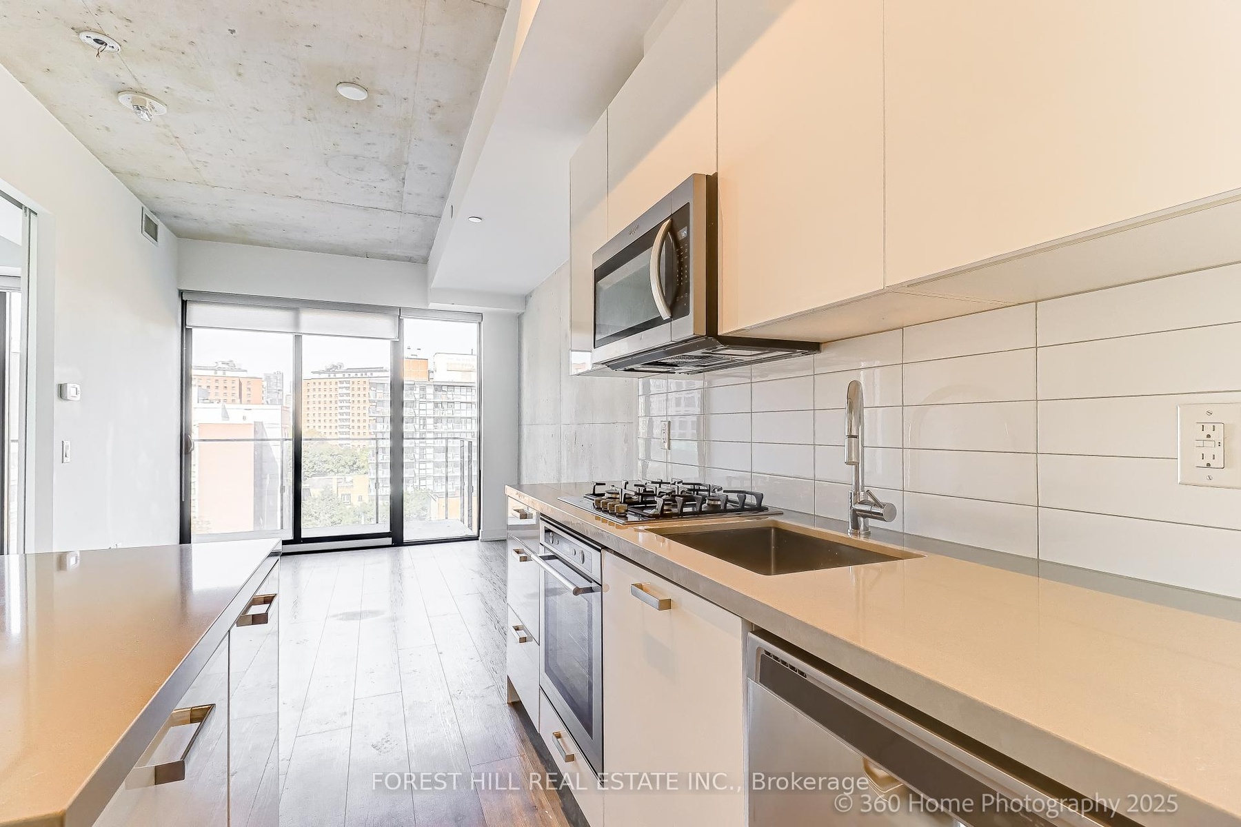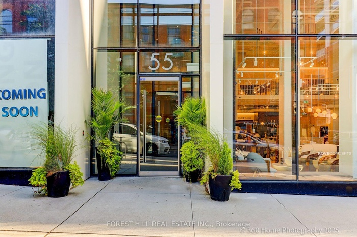 Welcome to EAST 55, Toronto's chic condo located on quiet, leafy Ontario Street. This 1 BR plus Den, HIROSHIMA MODEL is the ideal home for anyone looking for a stylish urban retreat. Bright open concept LR has wall-to-wall glass windows with a walk-out to a huge balcony with an unobstructed view. The soaring 10.5 ft exposed concrete ceiling provides a spacious feel. Freshly painted in a modern color palette. Extended Kitchen cabinets (30"), Drawer under the oven, under-cabinet lighting and a smart quartz Island defines this modern kitchen. The Spa-like bathroom boasts elegant marble flooring and shower walls. Friendly concierges and secure access make this a desirable place to call home. Location is perfect, with proximity to the Distillery district, St.Lawrence market, King street Street cars, George Brown College, and steps to TTC. Excellent walking score. Hurry! This sophisticated condo won't last!!!