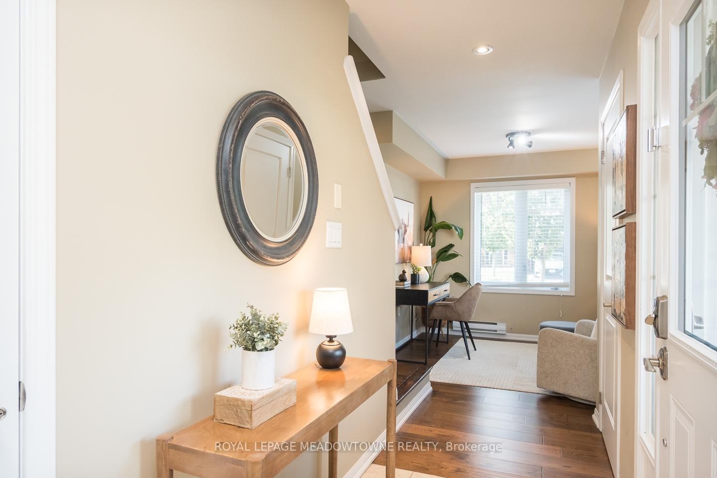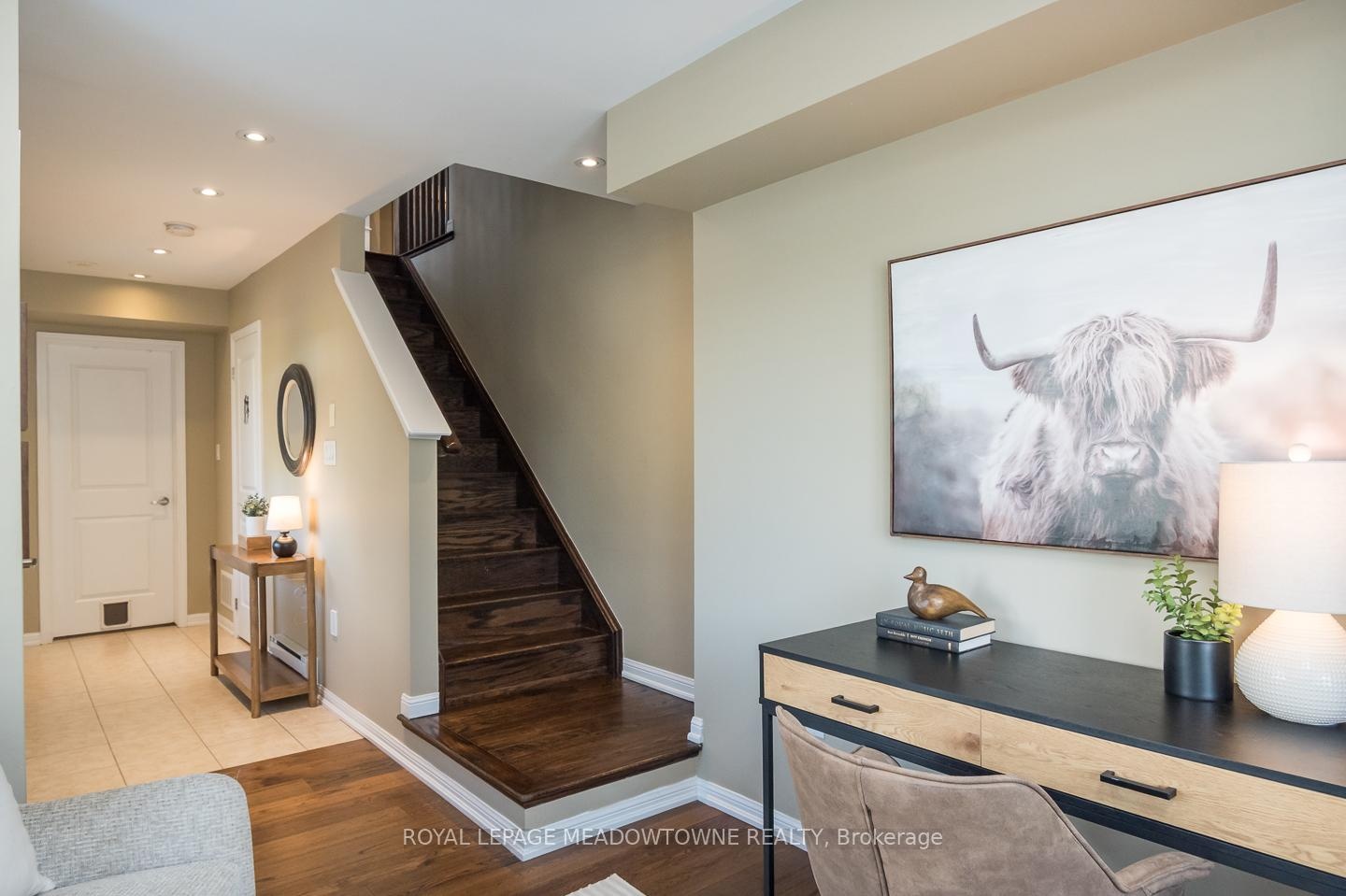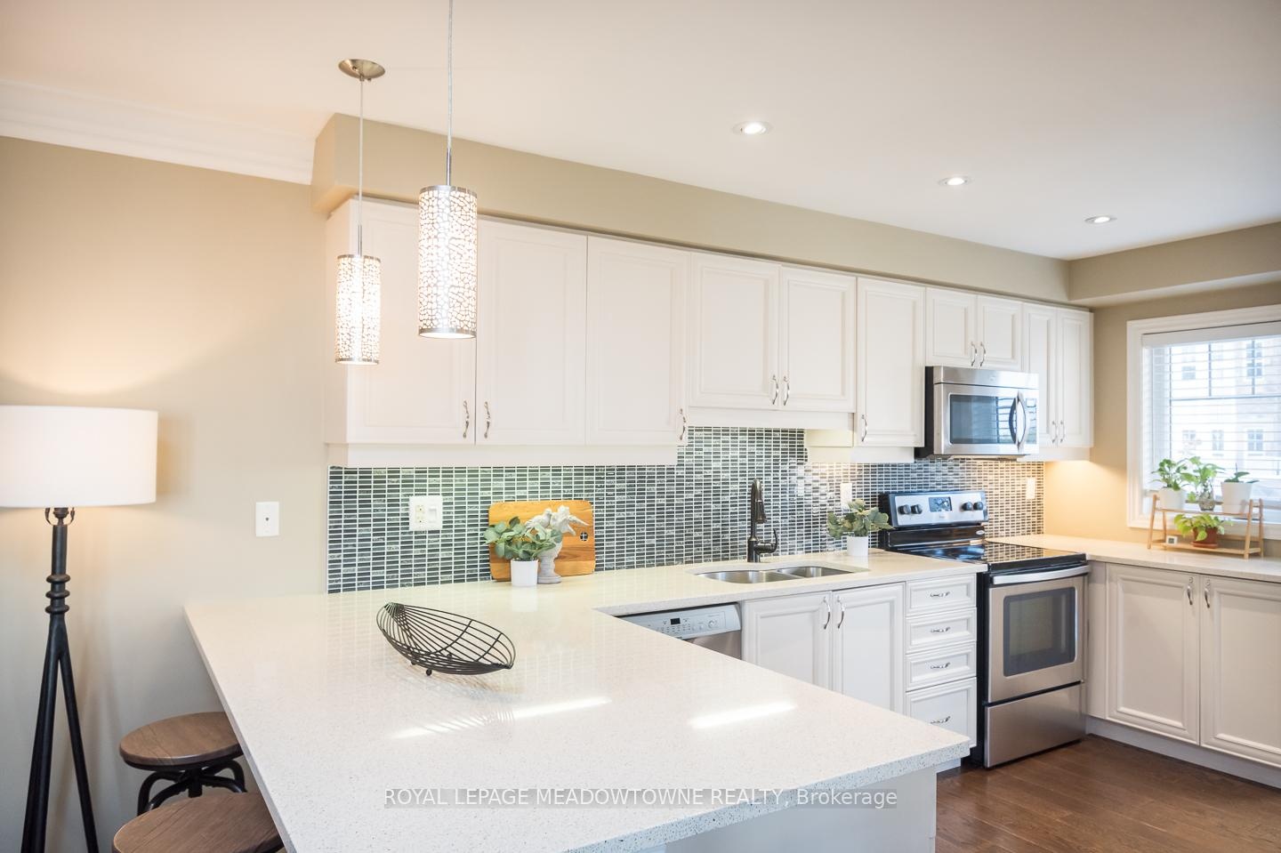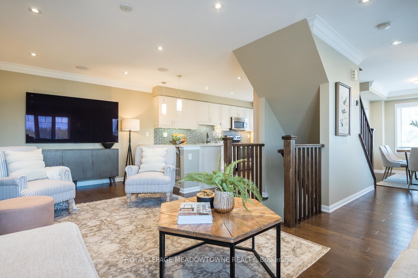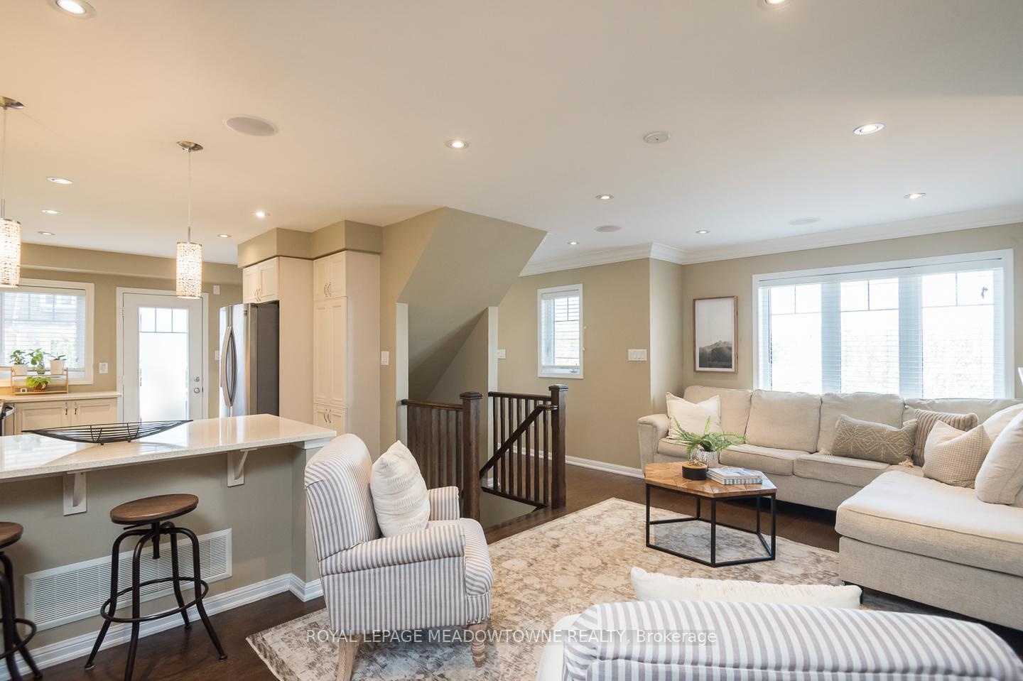 Freehold Mattamy Sutton Corner model townhome located in Milton's sought-after Willmott neighbourhood. This bright and spacious 3-storey corner unit offers over 1500sqft with 3 bedrooms, 2.5 bathrooms, and ample upgrades throughout. Ideally situated within walking distance to parks, schools, and everyday amenities, plus quick access to the 401, 407, and GO station, its perfect for families and commuters alike. The home features a welcoming covered porch, a large balcony, parking for 2 (garage + driveway), and convenient interior garage access. Inside, enjoy hardwood flooring throughout, pot lights, in-ceiling speakers, and a cozy gas fireplace in the open-concept living and dining area. The white kitchen shines with quartz countertops, tile backsplash, under-cabinet lighting, peninsula seating, and direct access to the balcony. Upstairs, you'll find 3 generous bedrooms including a primary retreat with a walk-in closet and 3-piece ensuite, plus a 4-piece main bath. With a main floor den, laundry, and stylish stone counters in every bathroom, this home blends comfort and function in an unbeatable location.
